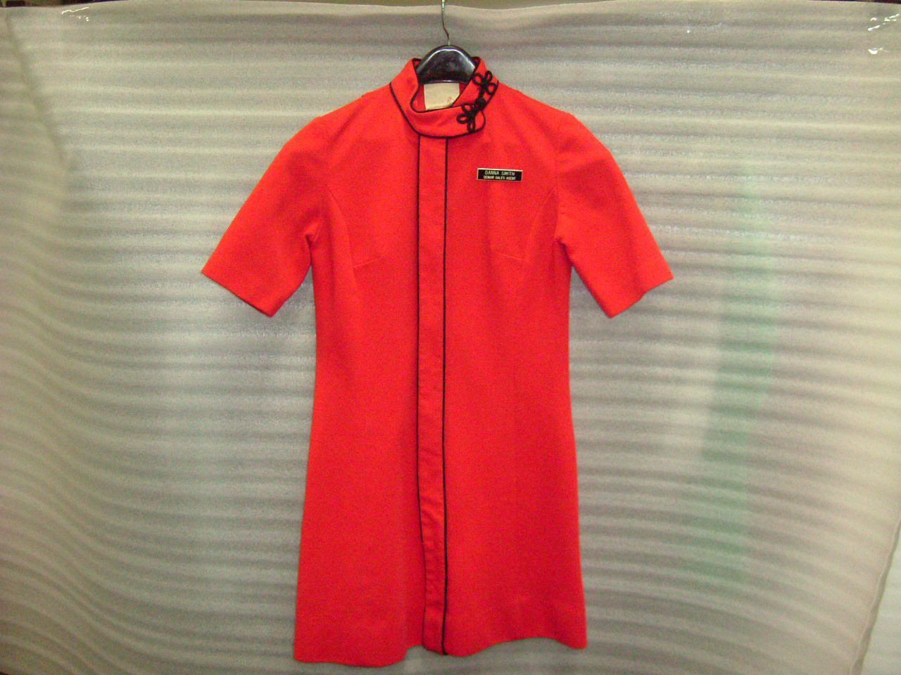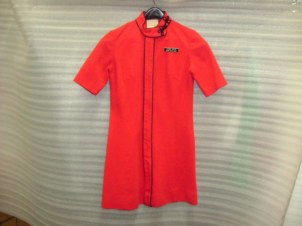 Red zipper-down dress with black trim with name badge, Danna SmithCataloged By