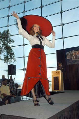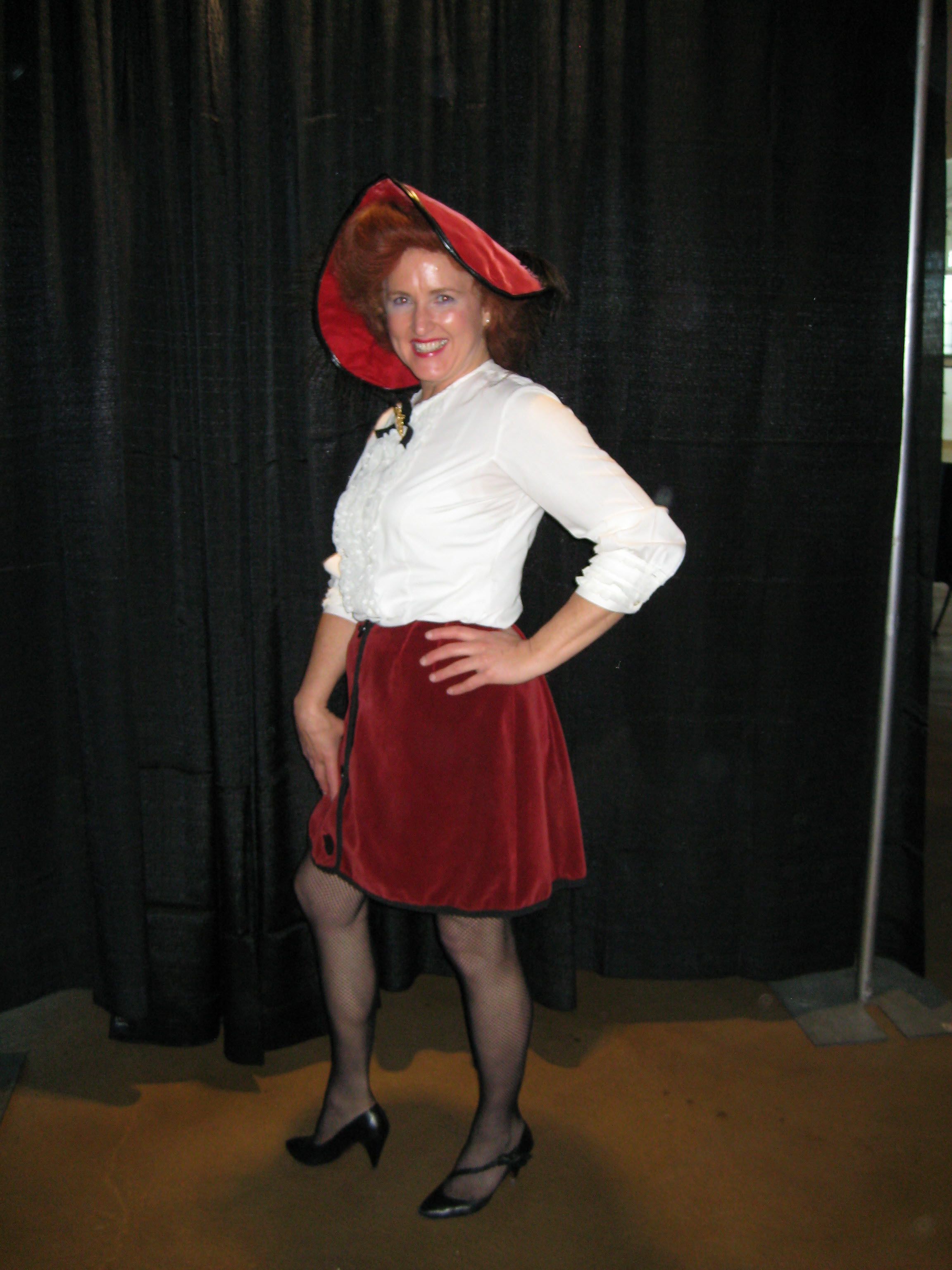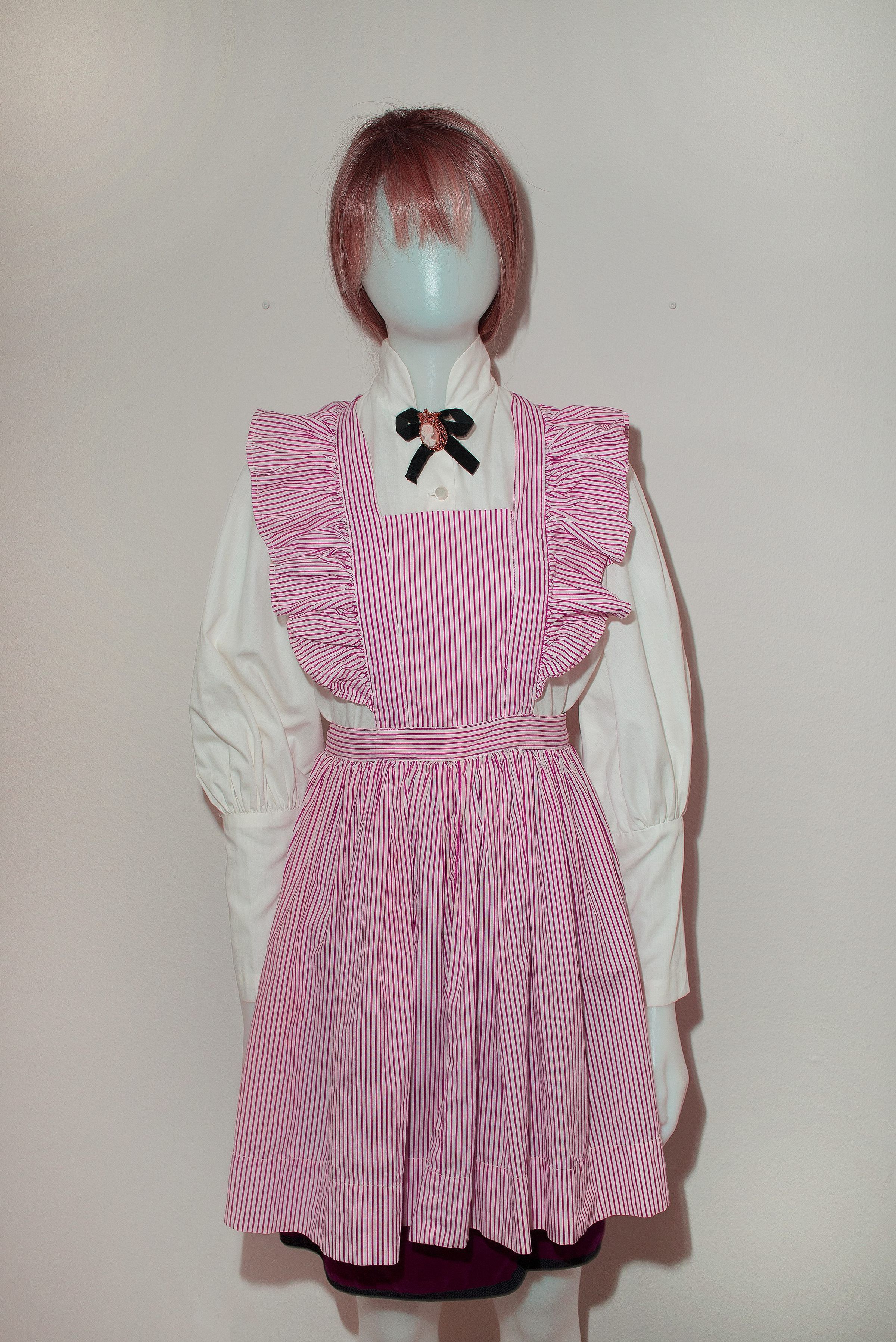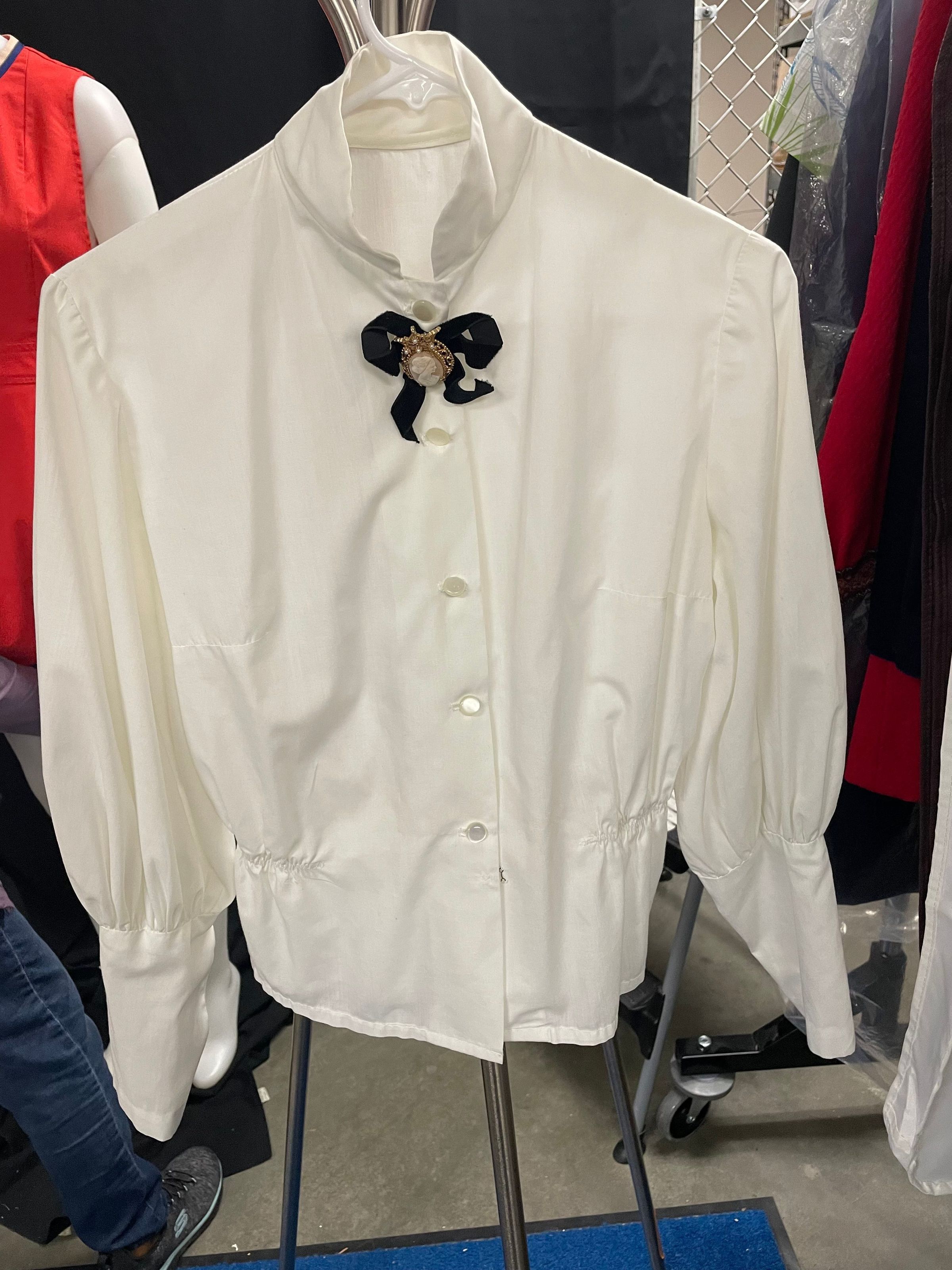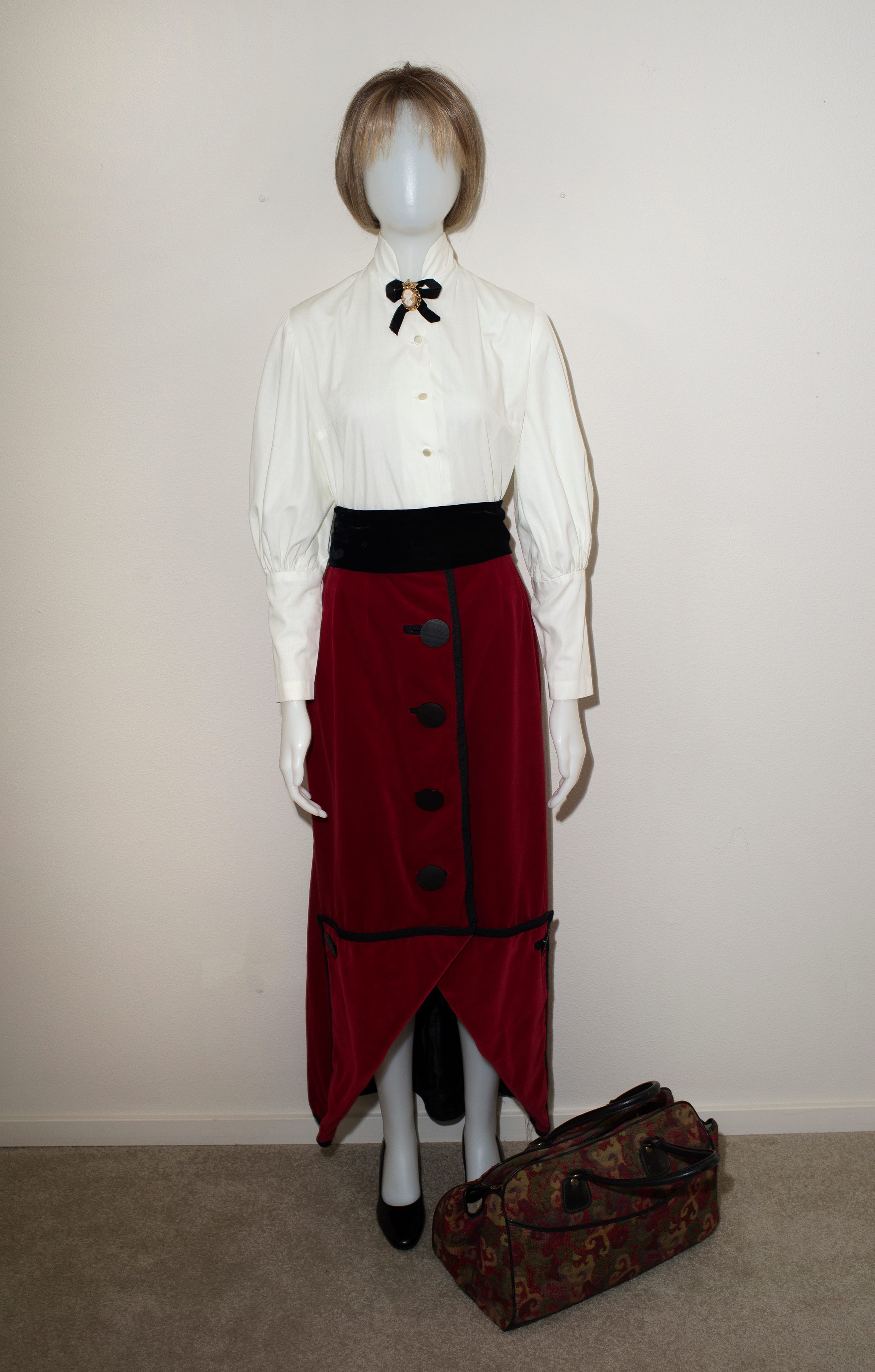 Wrap around red velvet long skirt, white blouse, black tie with cameo (not included).