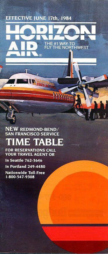 New service from Redmond-Bend / San Francisco timetable. Meatball logo in the bottom right corner, and painting of Horizon F27Context