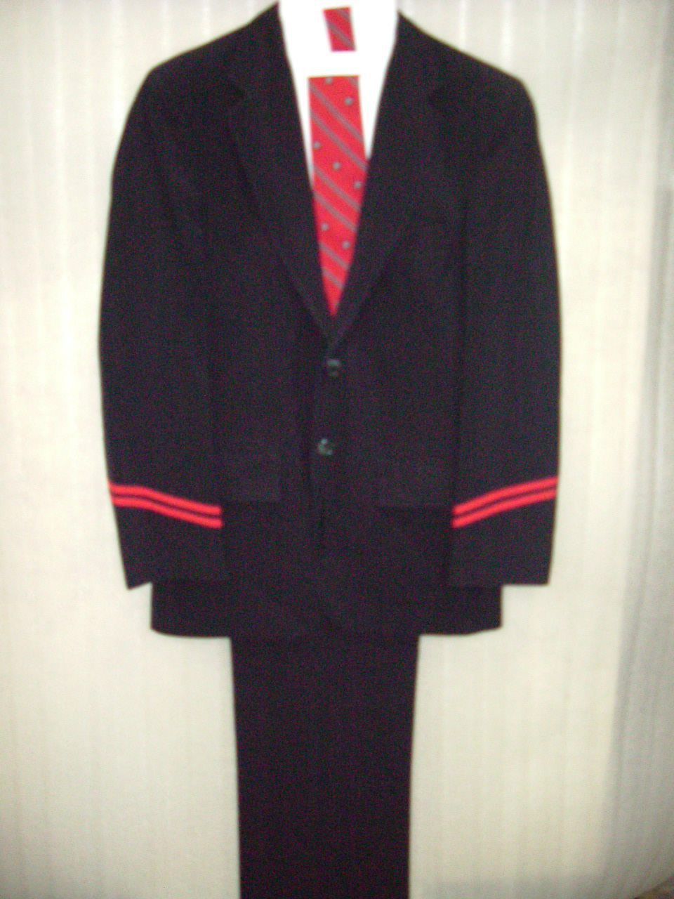 Dark blue male jacket with 2 red stripes on sleeves, slacks and tieCataloged By
