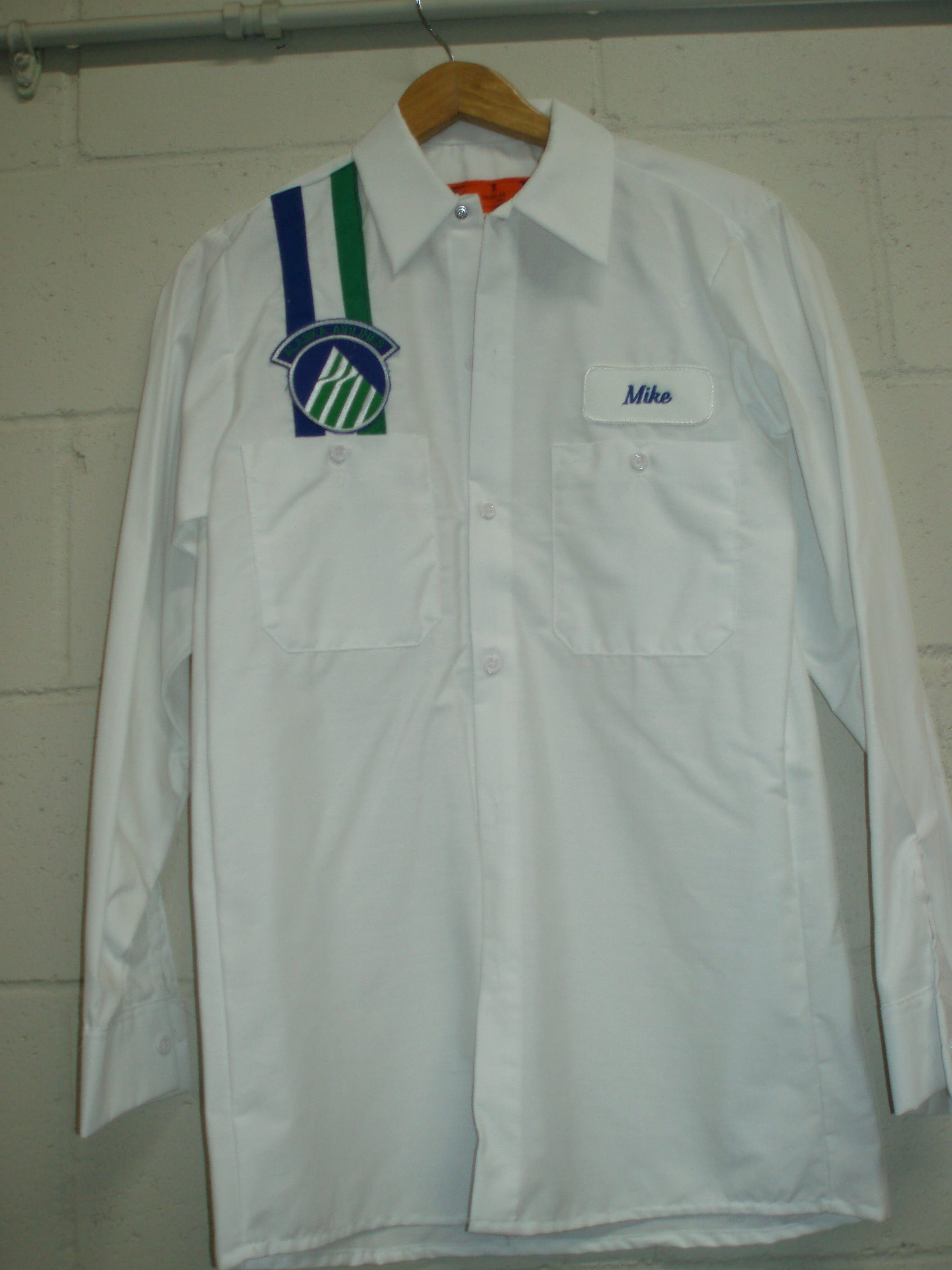 White mechanic shirt. "Mike" name patch on left chest. Two navy vertical stripes with Alaska mountain logo on left chest.Cataloged By