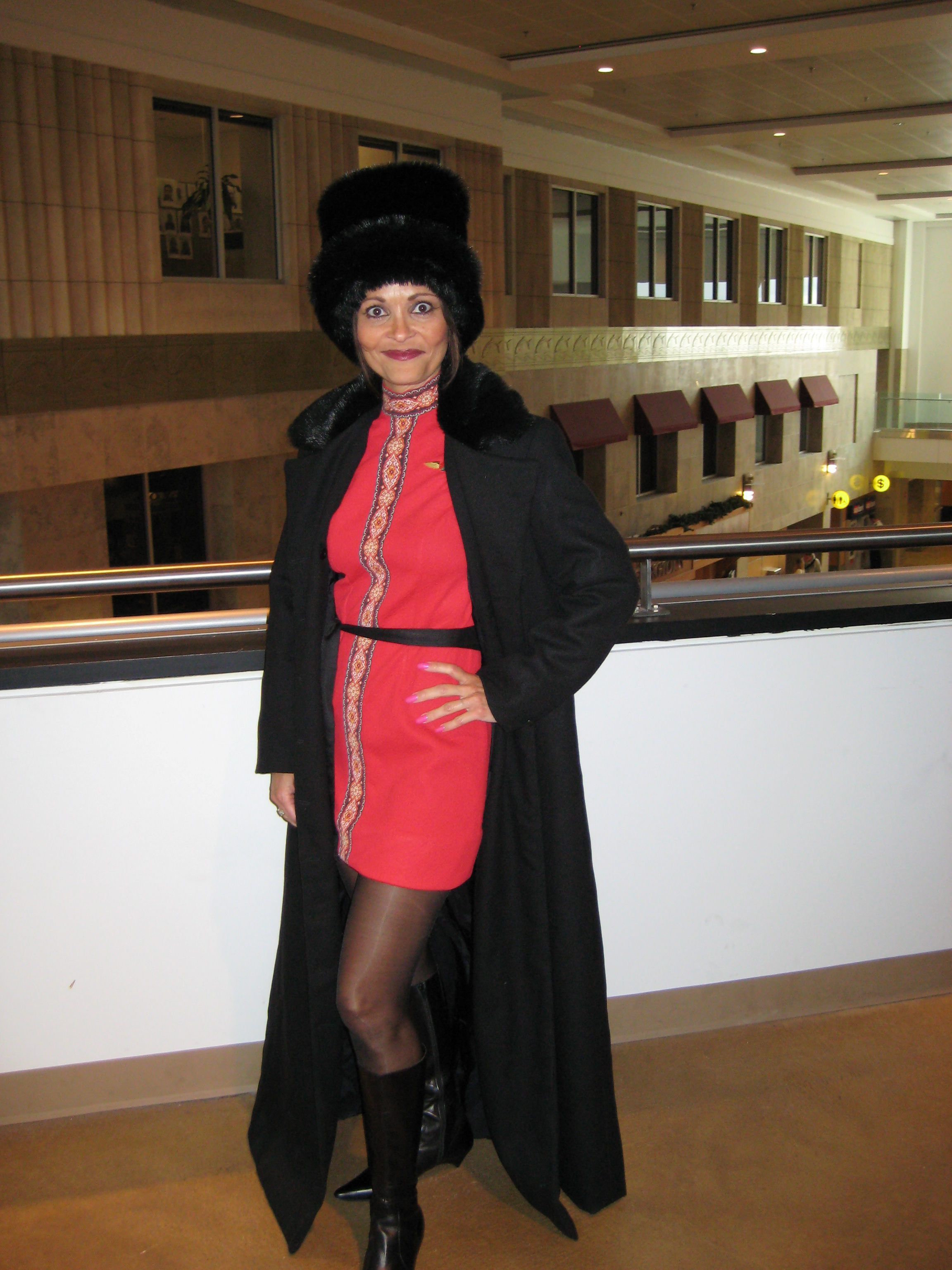 Late 1960s & Early 1970s; Russian Samovar service long black double breasted coat with fur collar & fur hatCataloged By