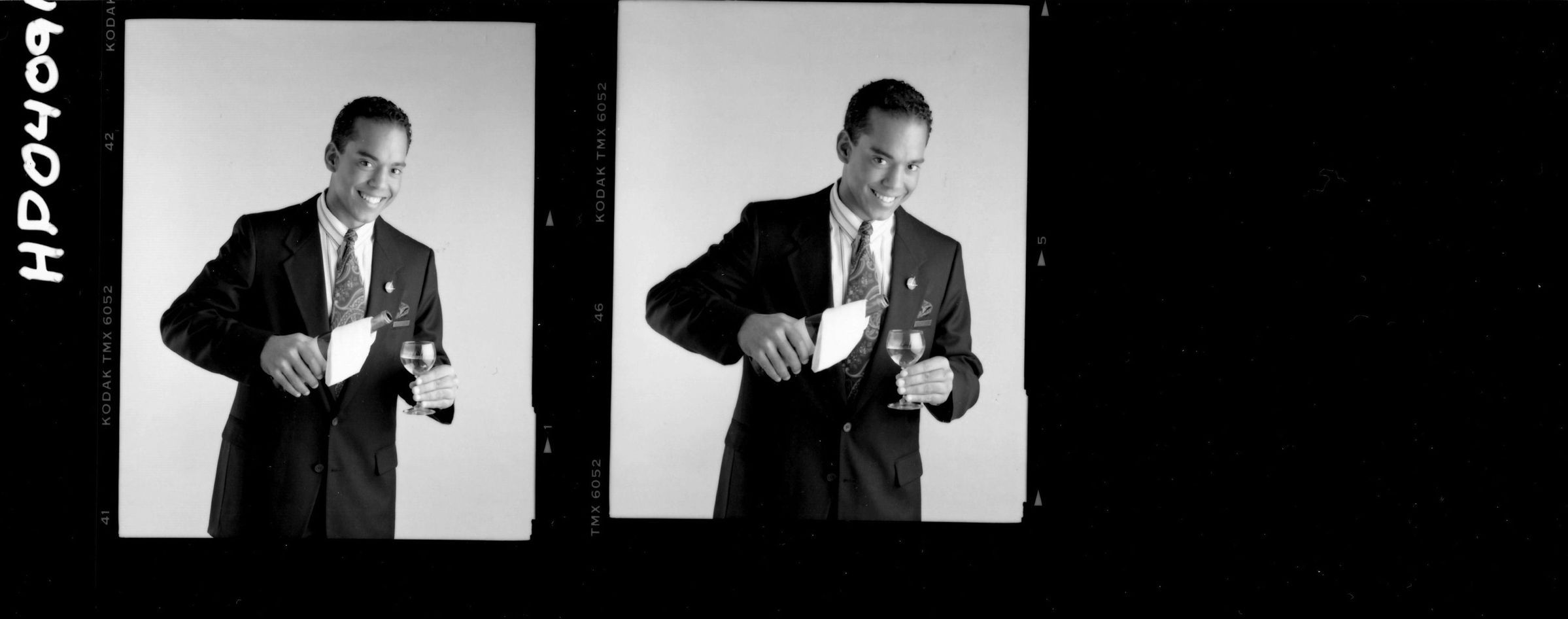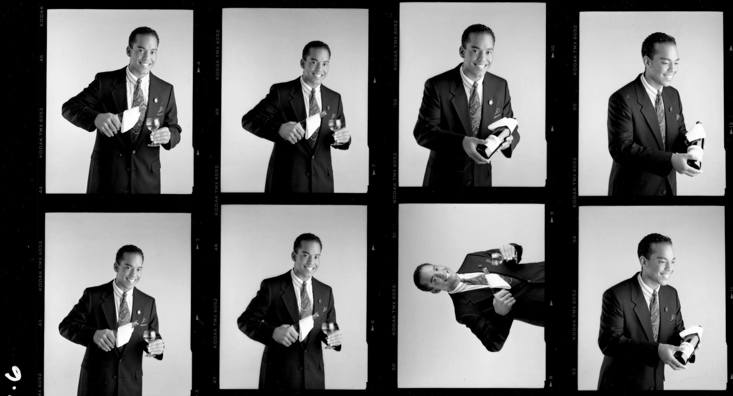 B&W contact sheet of Flight Attendant photoshoot; publicity photo - new AS logo male, dark suit; uniform, early 90s, marketing, pouring champagne, inflight serviceCollection