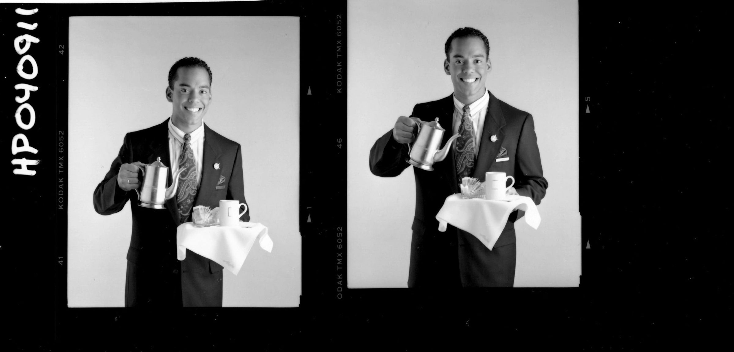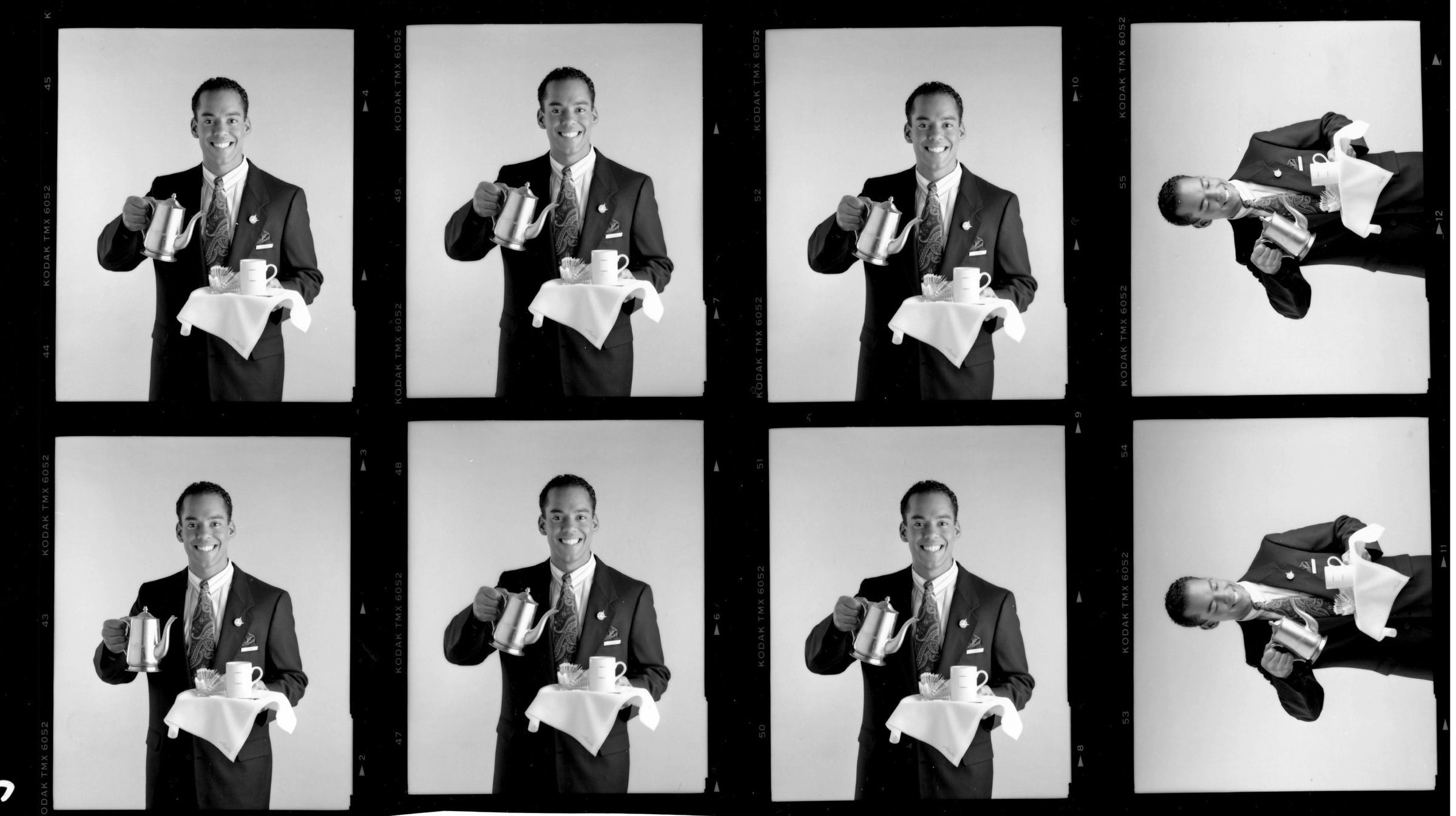B&W contact sheet of Flight Attendant photoshoot; publicity photo - new AS logo male, dark suit; uniform, early 90s, marketing, pouring coffee, inflight serviceCollection