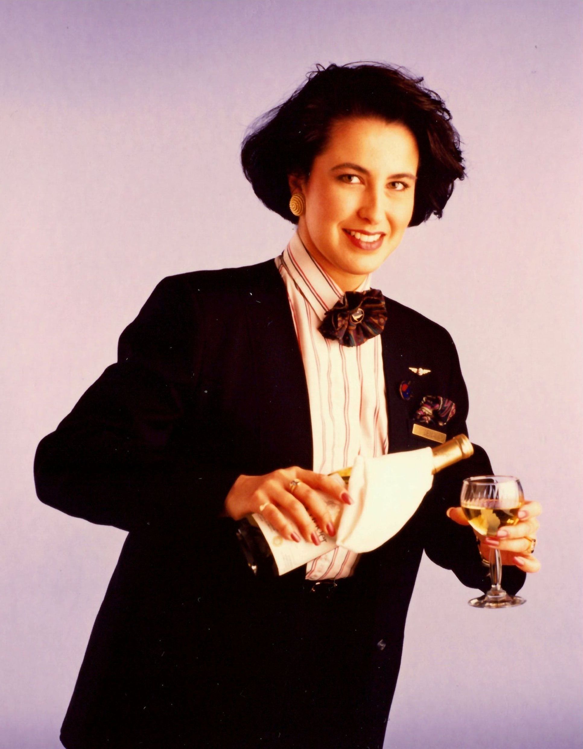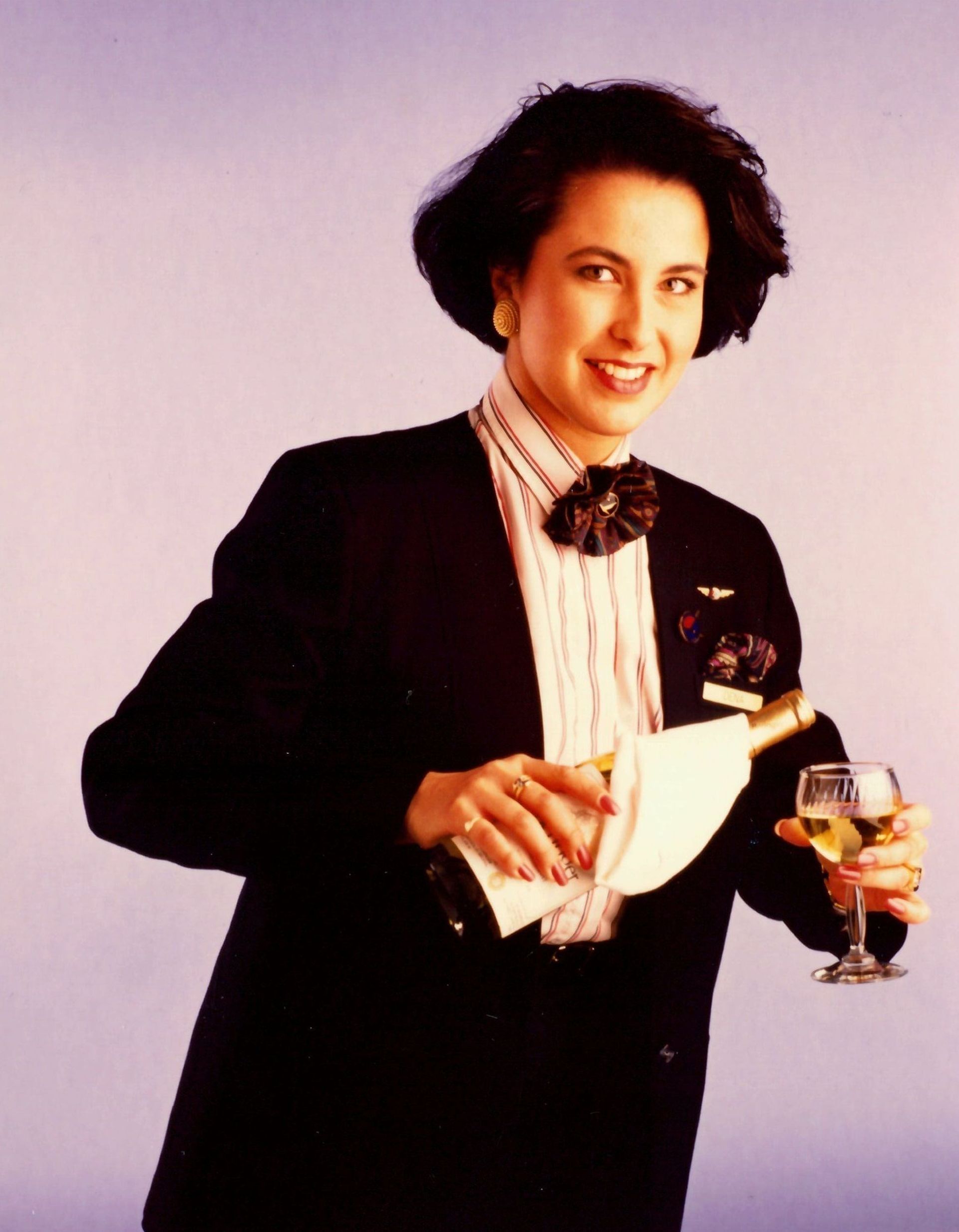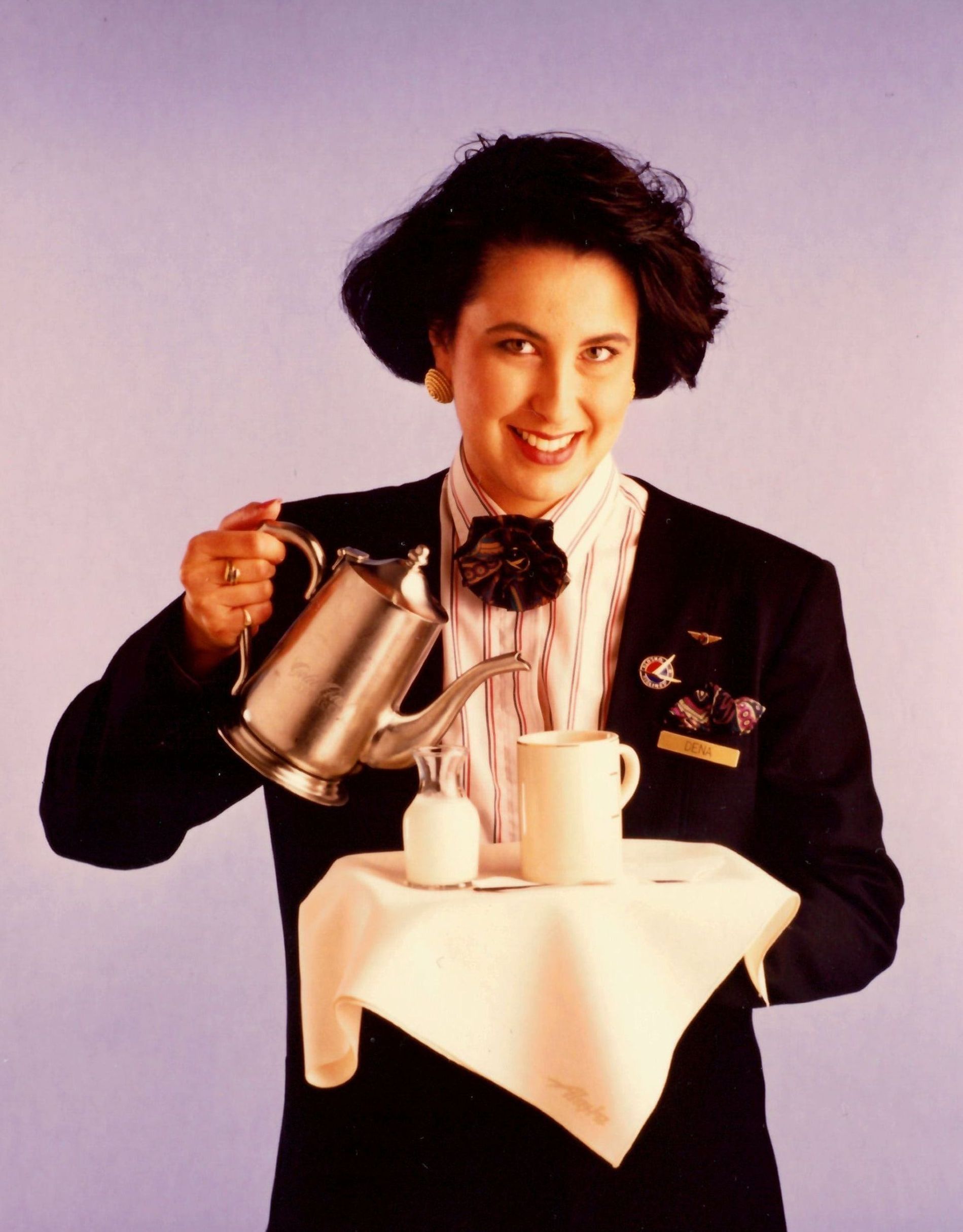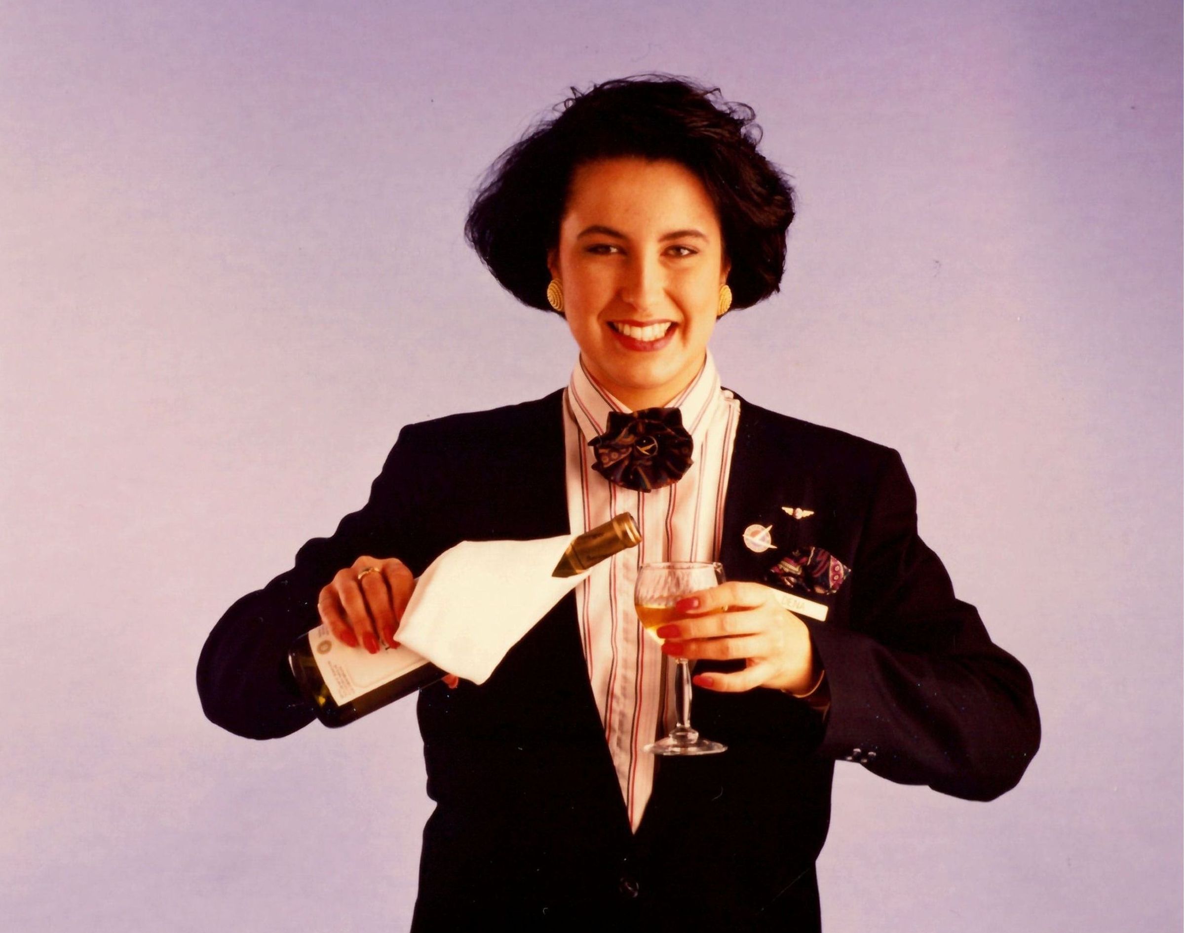 Color photos of Flight Attendant photoshoot - new AS logo , short hair woman; inflight service, pouring drinks, coffee, champagne, FA uniform, publicity photo; early 90sCollection