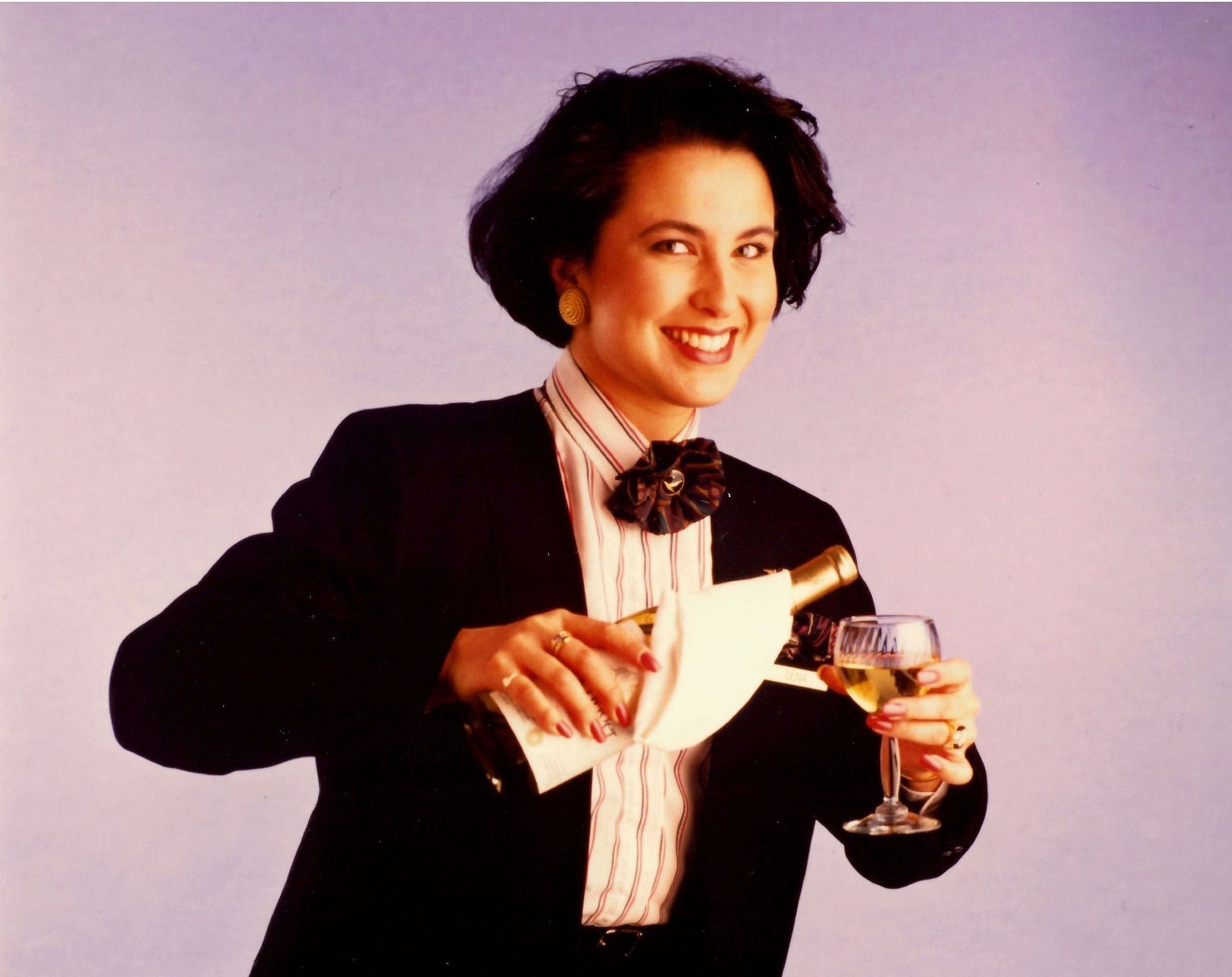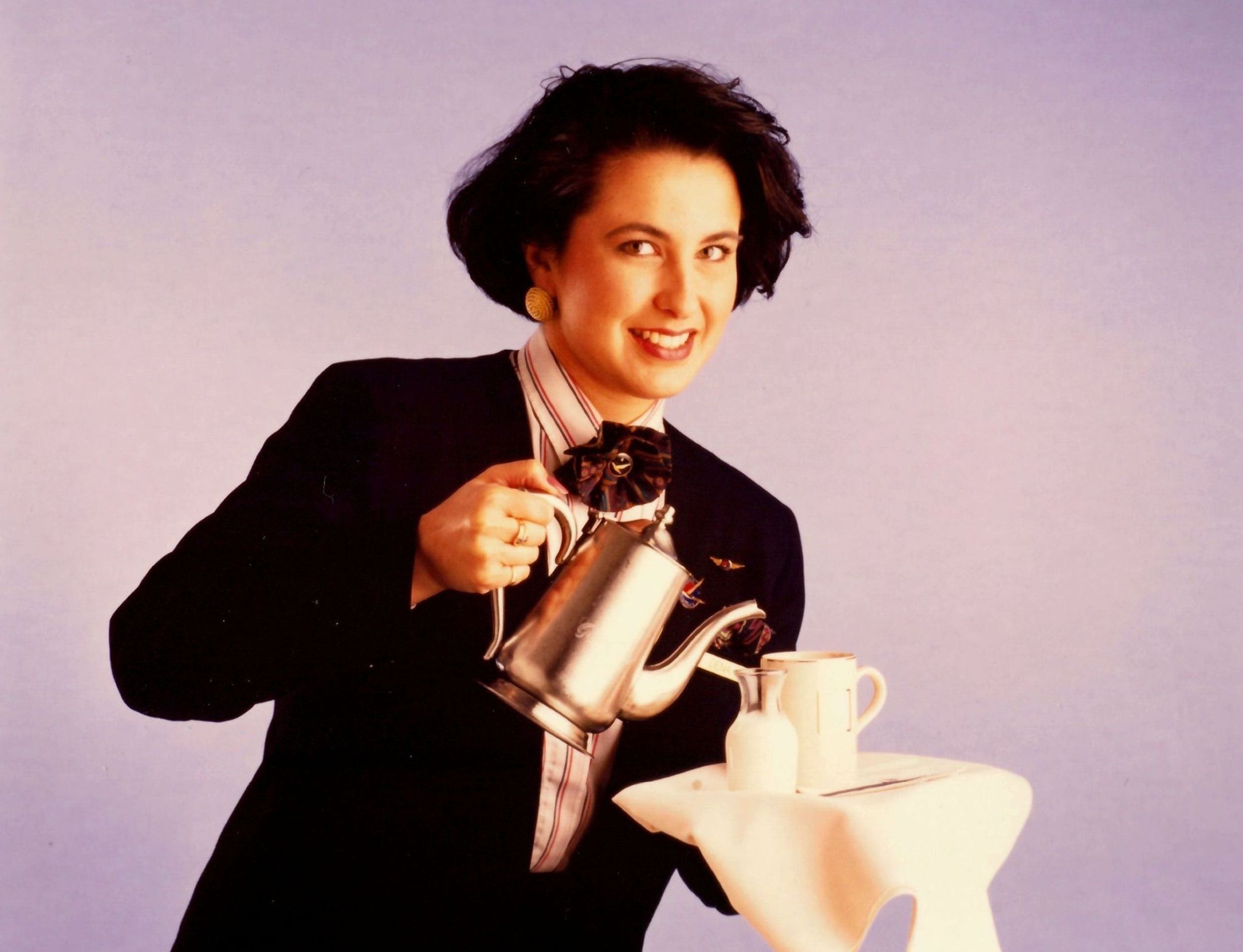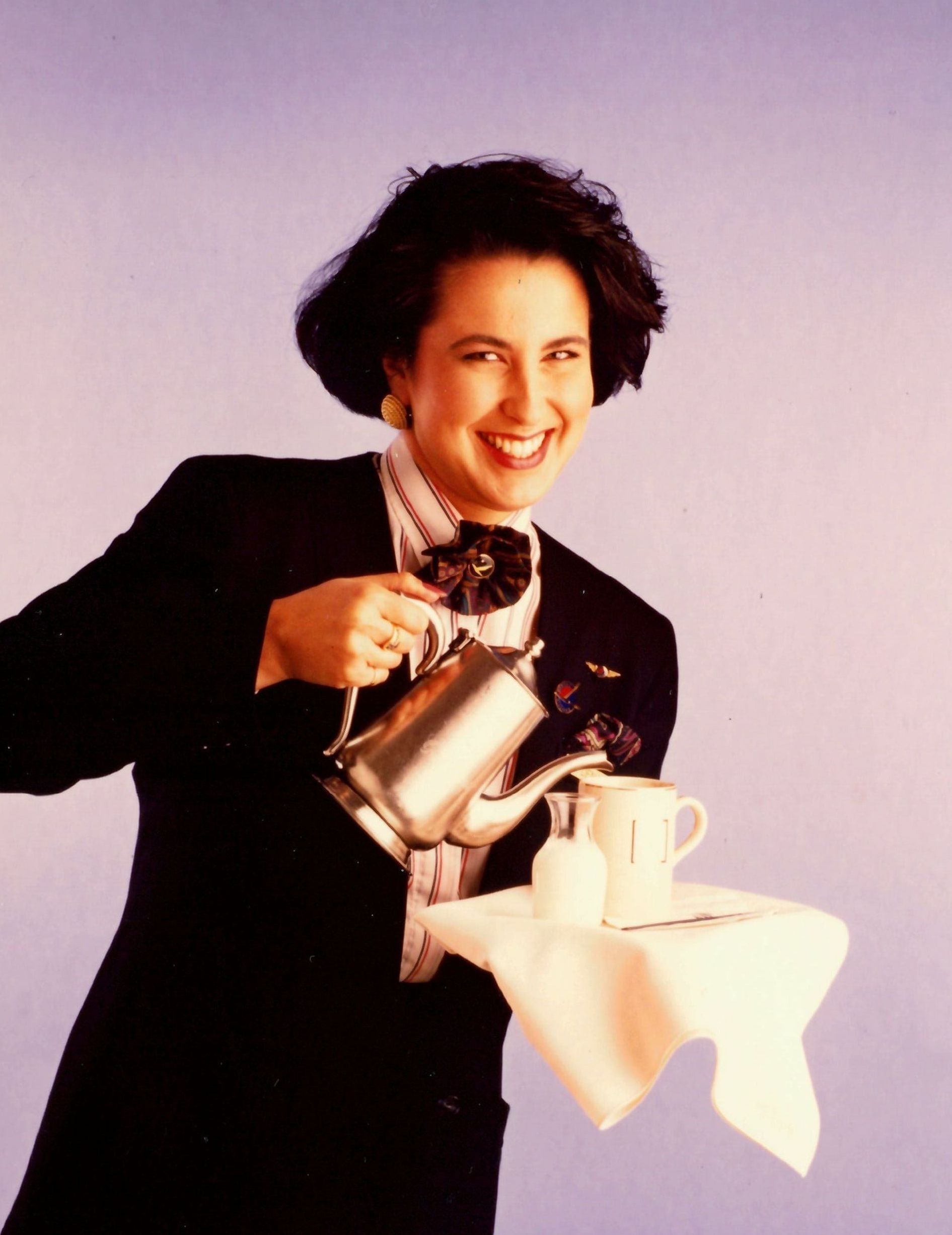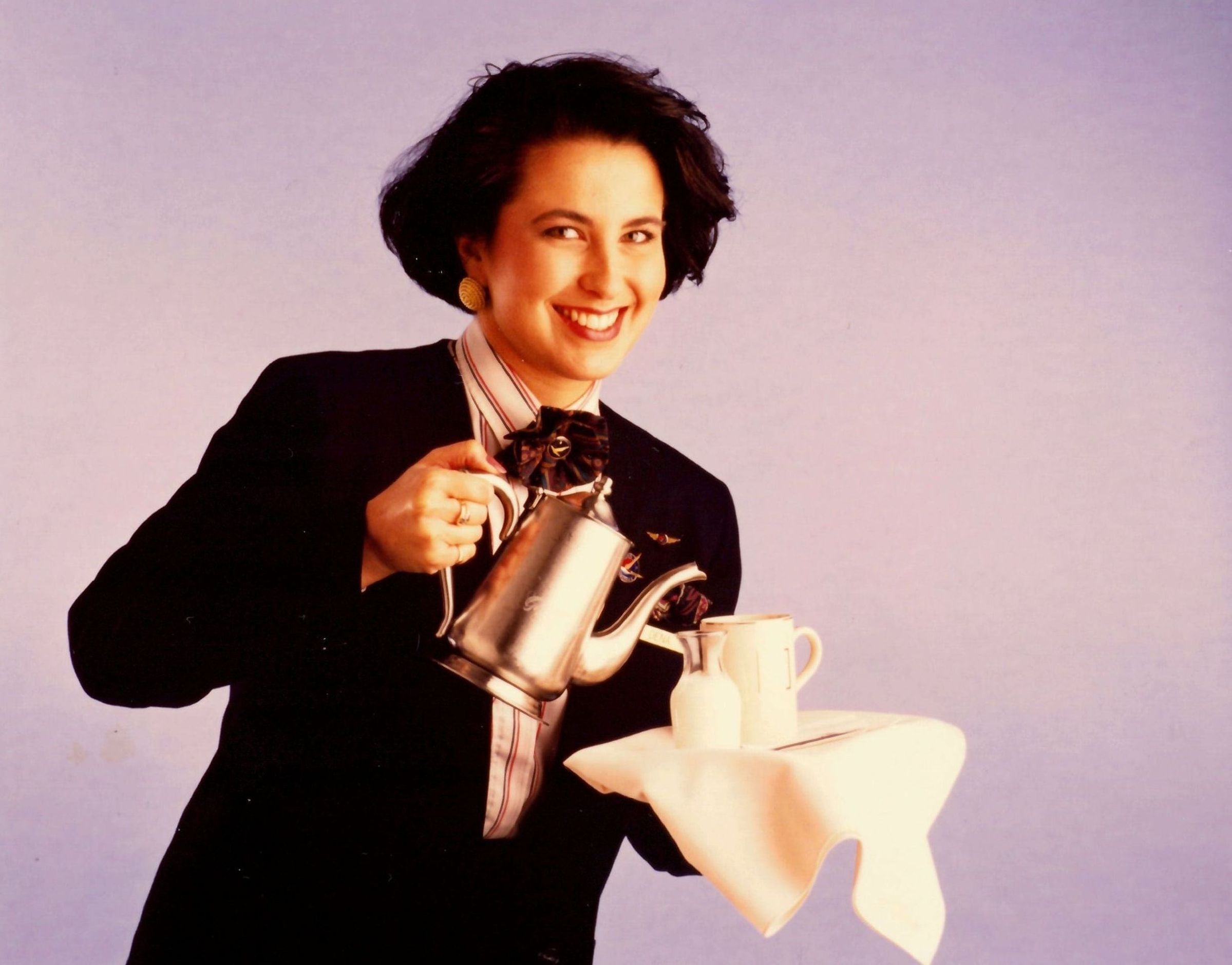 Color photos of Flight Attendant photoshoot - new AS logo , short hair woman; inflight service, pouring drinks, coffee, champagne, FA uniform, publicity photo; early 90sCollection