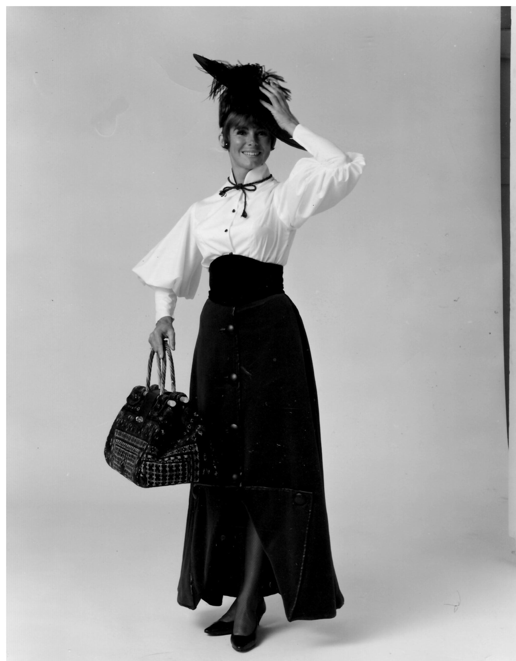 B&W photo from a commercial photoshoot, Flight Attendant Donna Killeen; Gay 90s uniform, Red Hat, uniform; 1967Photograph Details