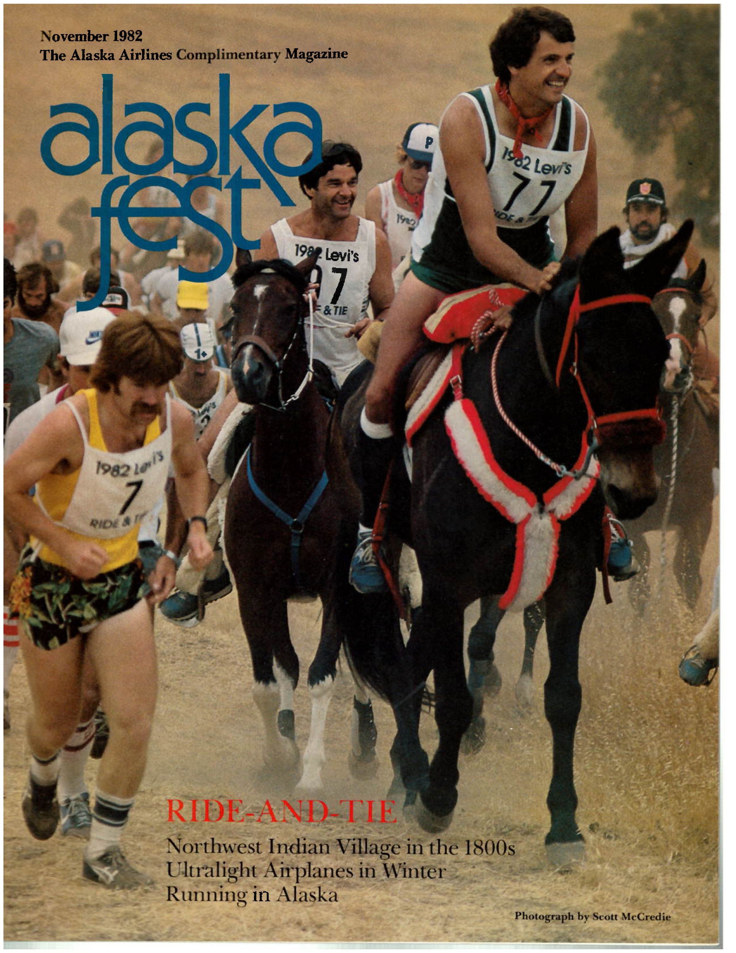 RIDE-AND-TIE, Northwest Indian Village in the 1800s, Ultralight Airplanes in Winter, Running in Alaska. Cover-The 1982 Levi's Ride-and-Tie, at San Jose, California. (Photo by Scott McCredie)Description