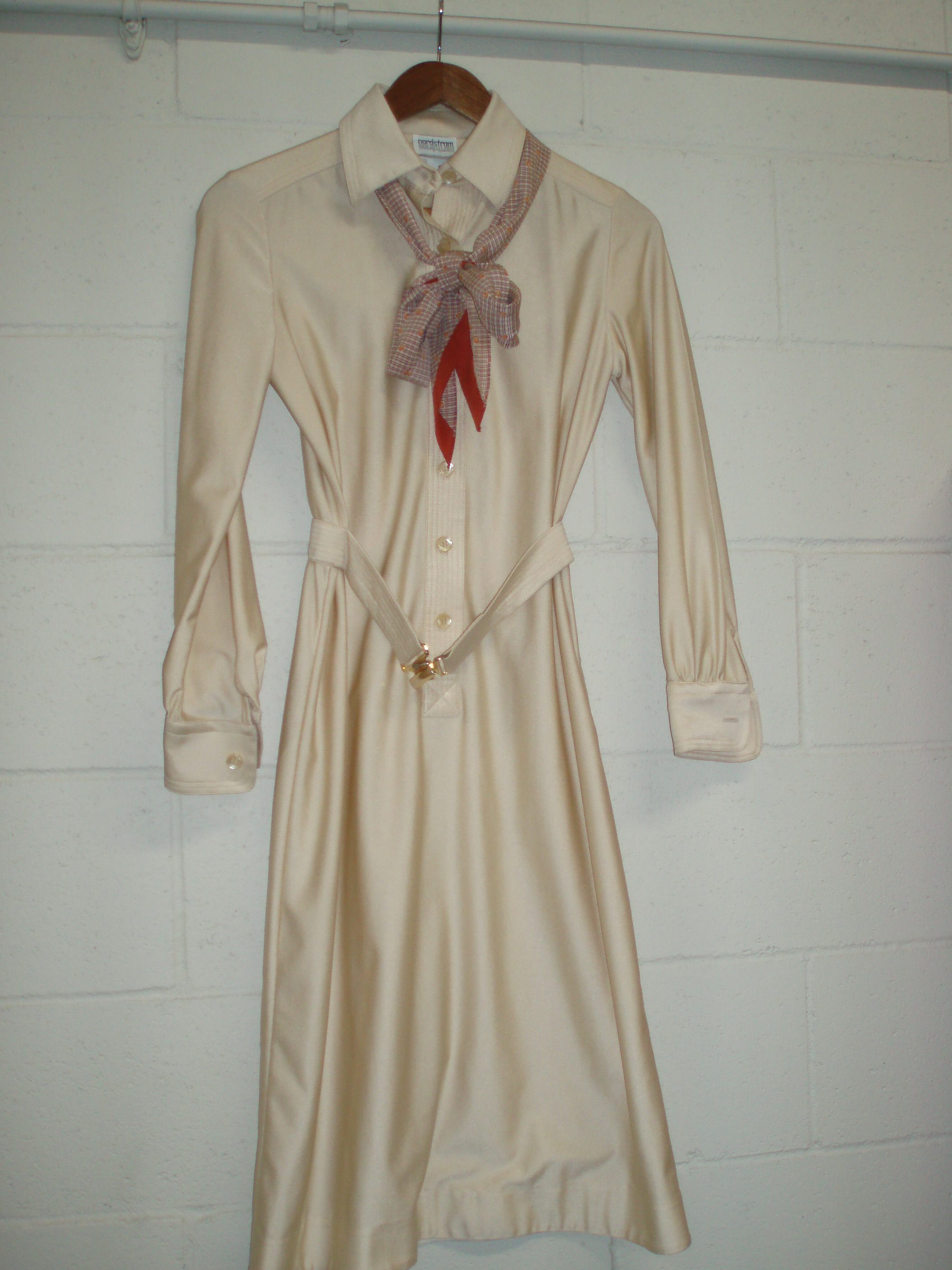 Gold dress uniform with pattern scarf/bow. Belt with gold buckle.Context