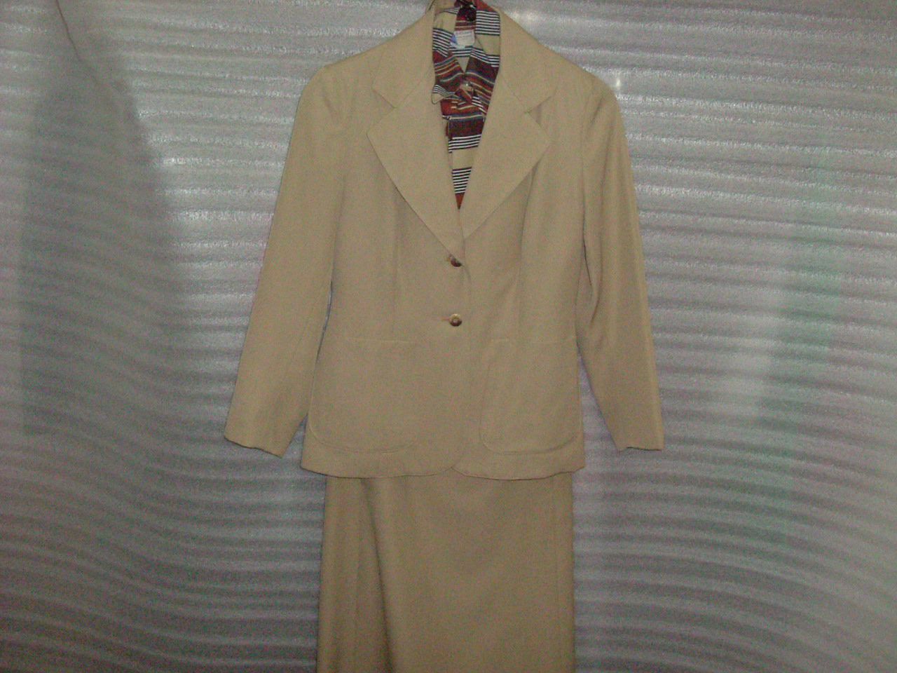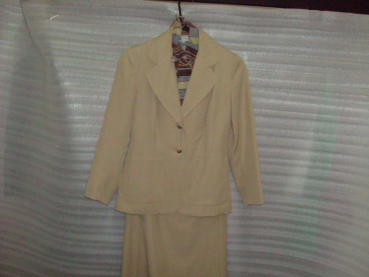 Beige 2-piece with scarf, belt, dress, & blazerCataloged By
