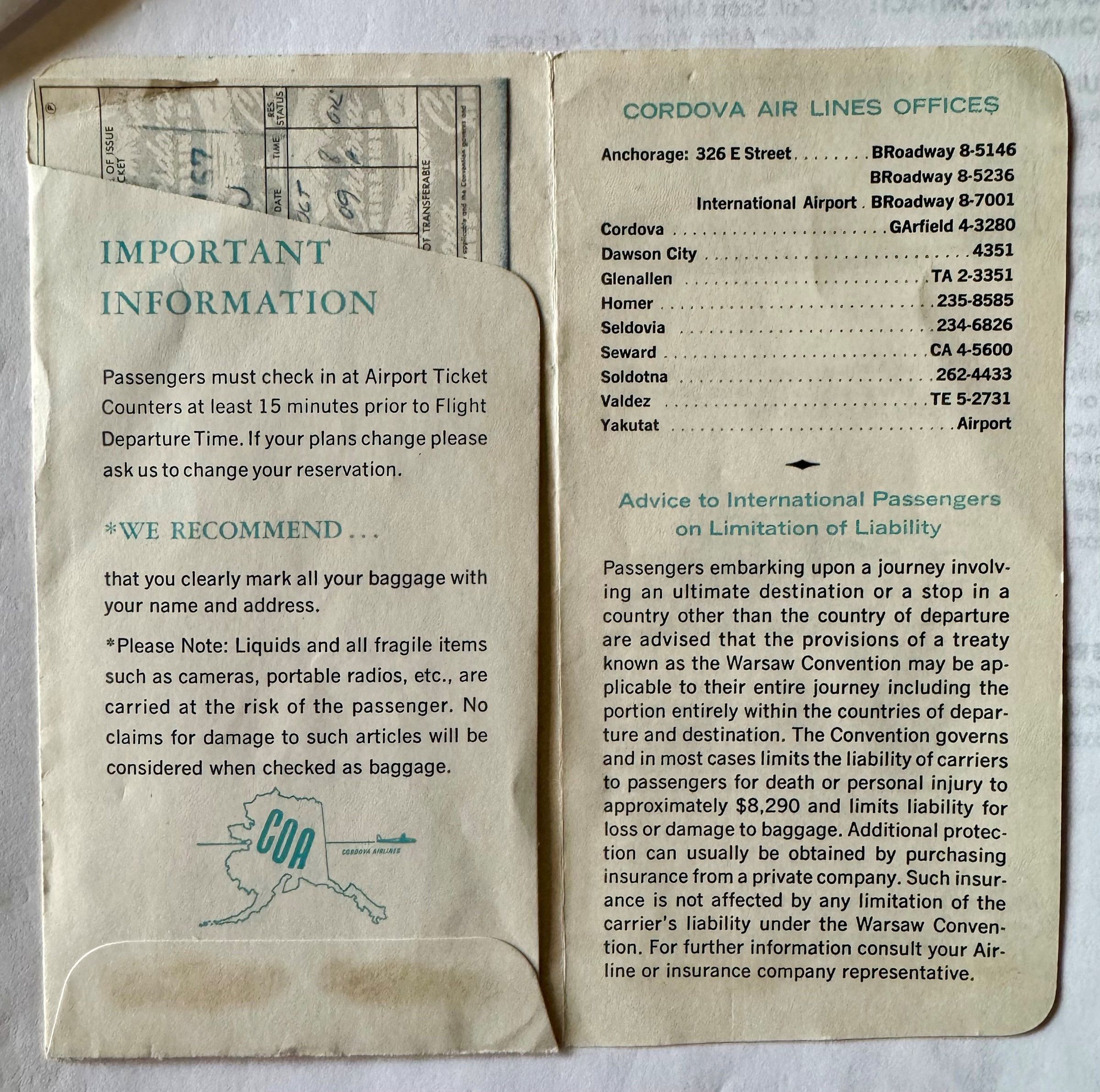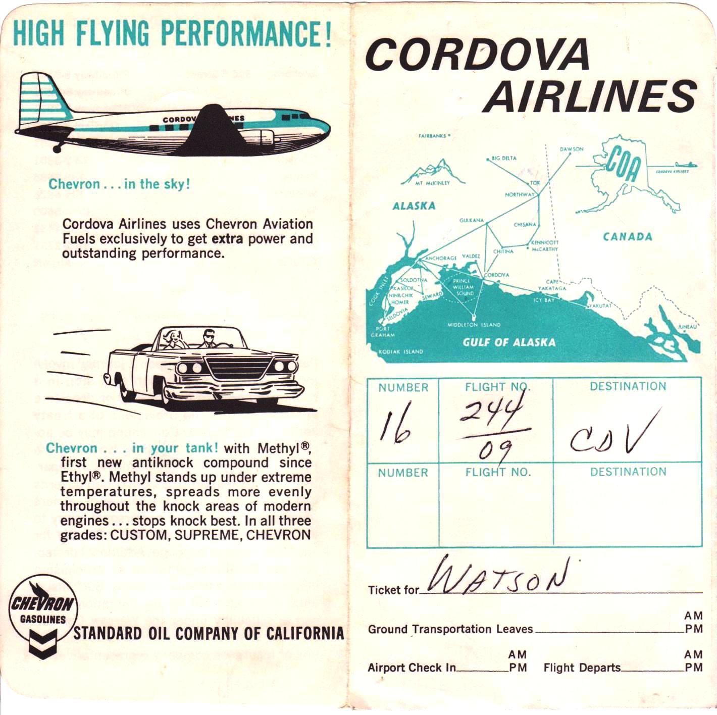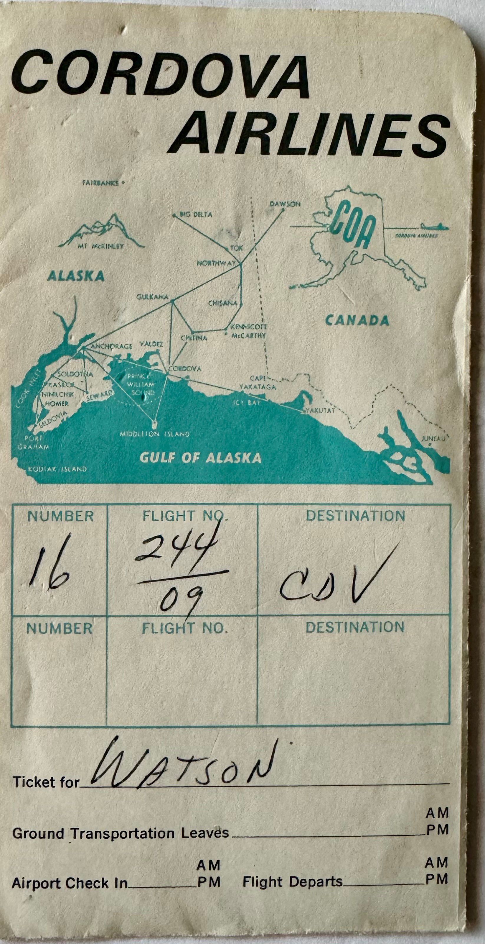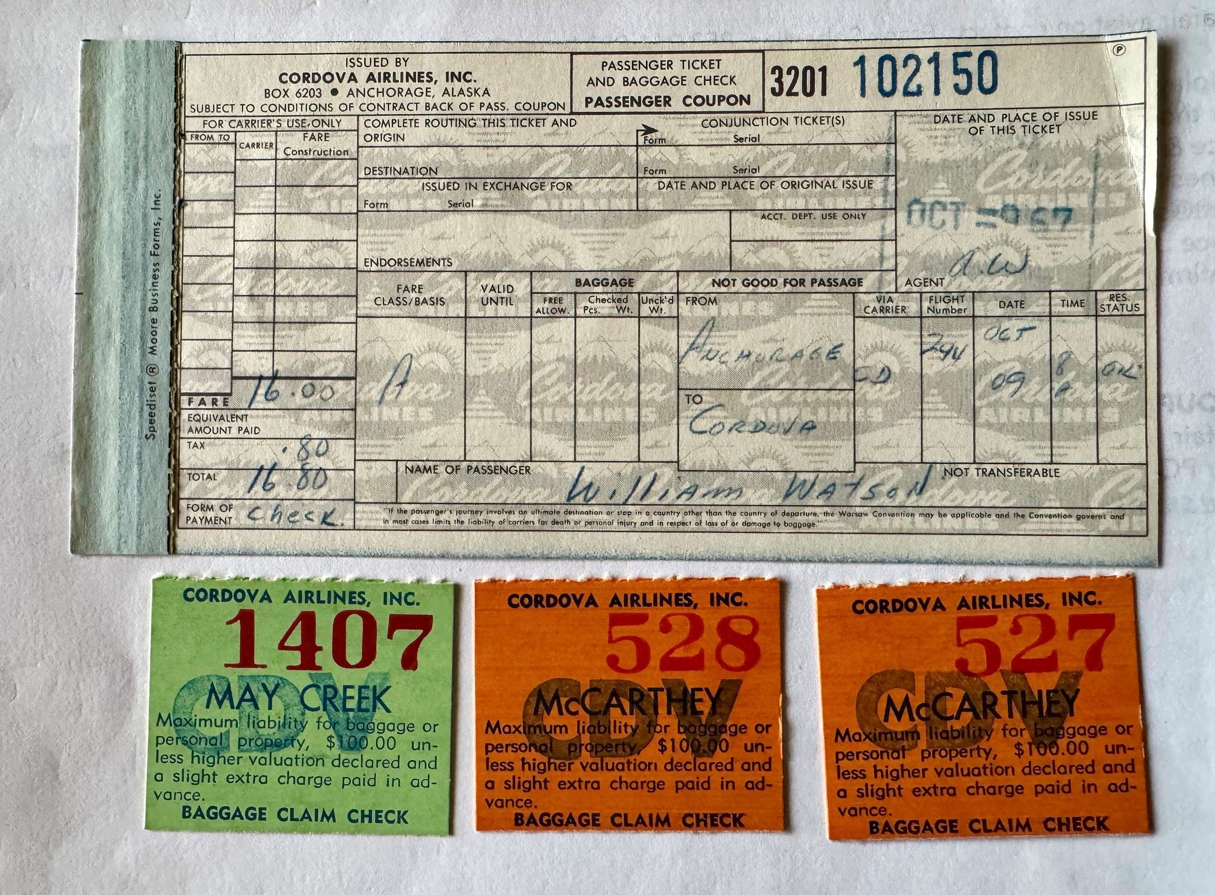 Cordova Airlines Ticket Jacket - Passenger's Name William Watson. Includes ticket and baggage claim checks. Flight from Anchorage to Cordova. Fare $16.00. Year 1967Cataloged By