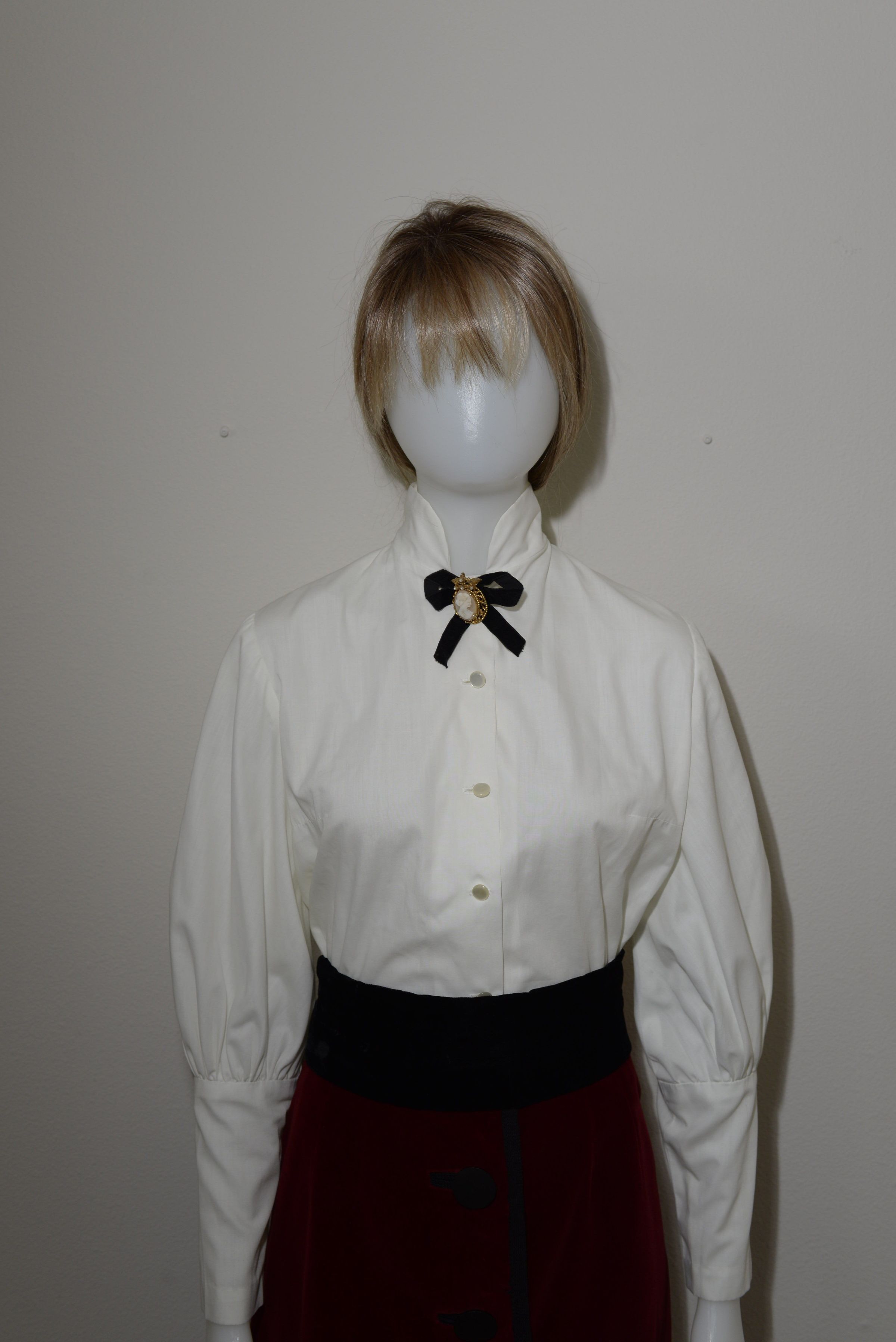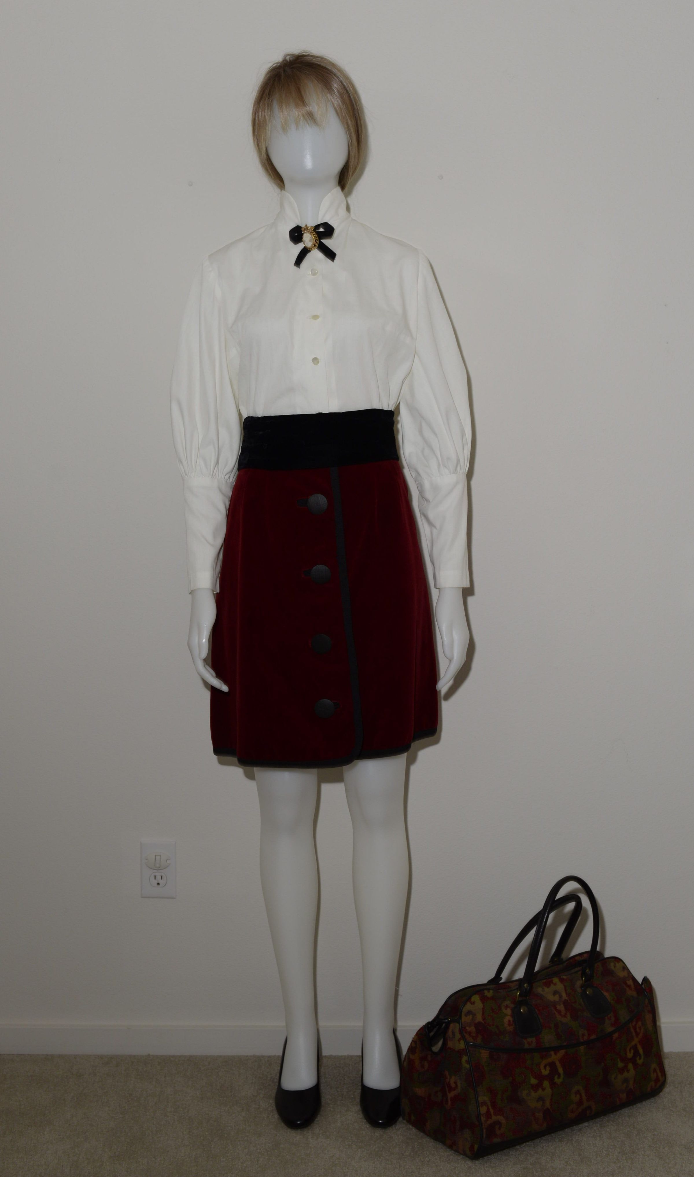 Red velvet short skirt, white blouse, black tie with cameo, black fishnet stockings, black short healsContext