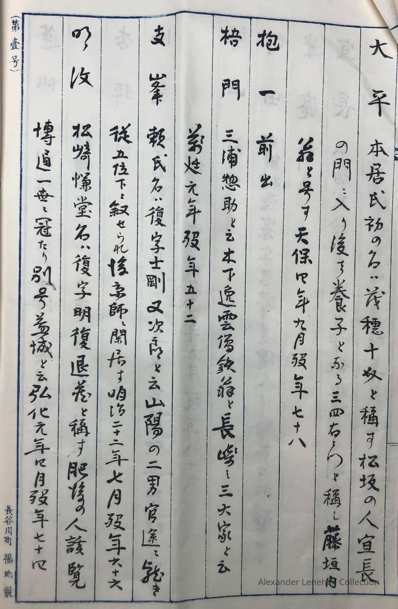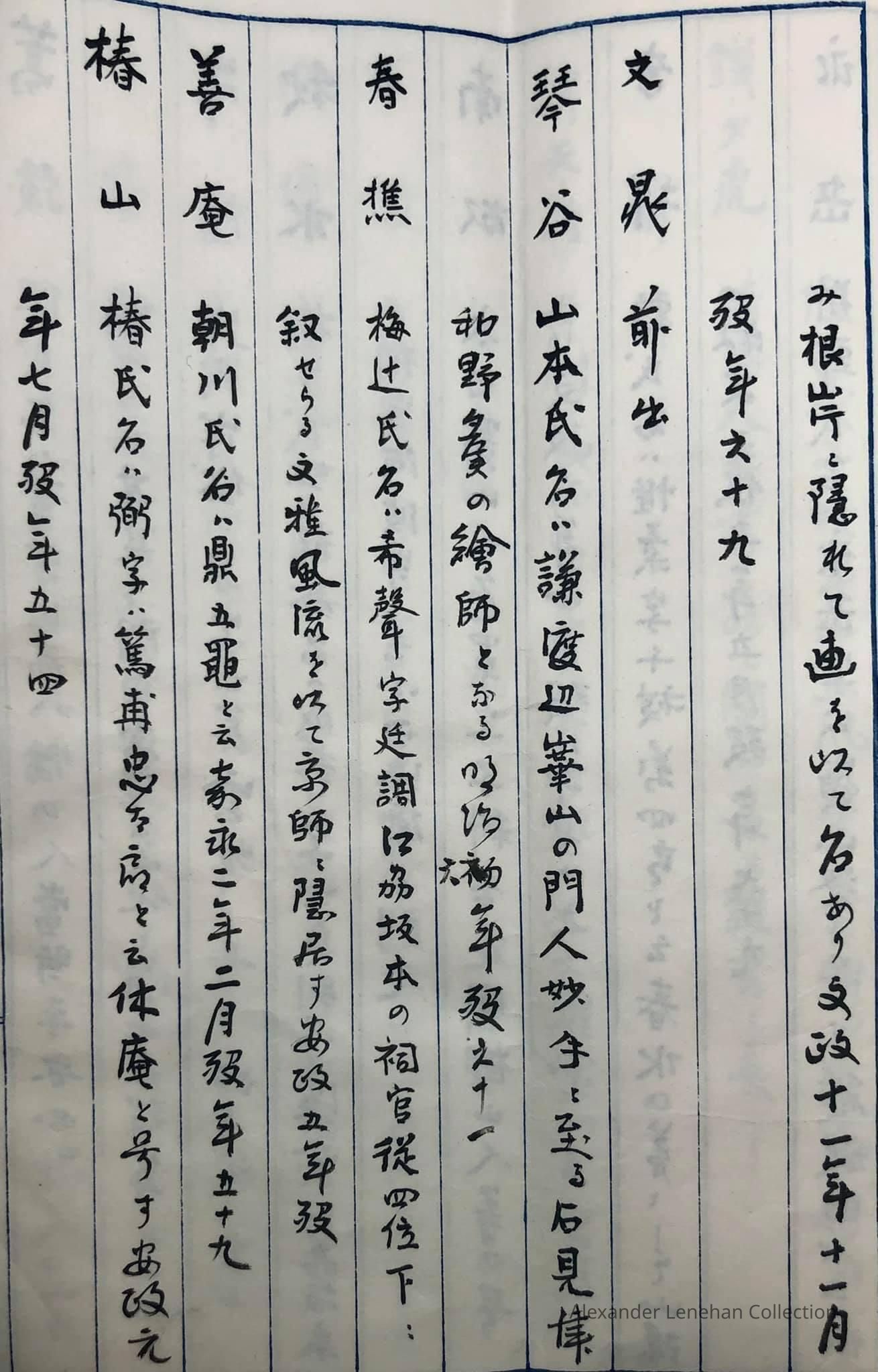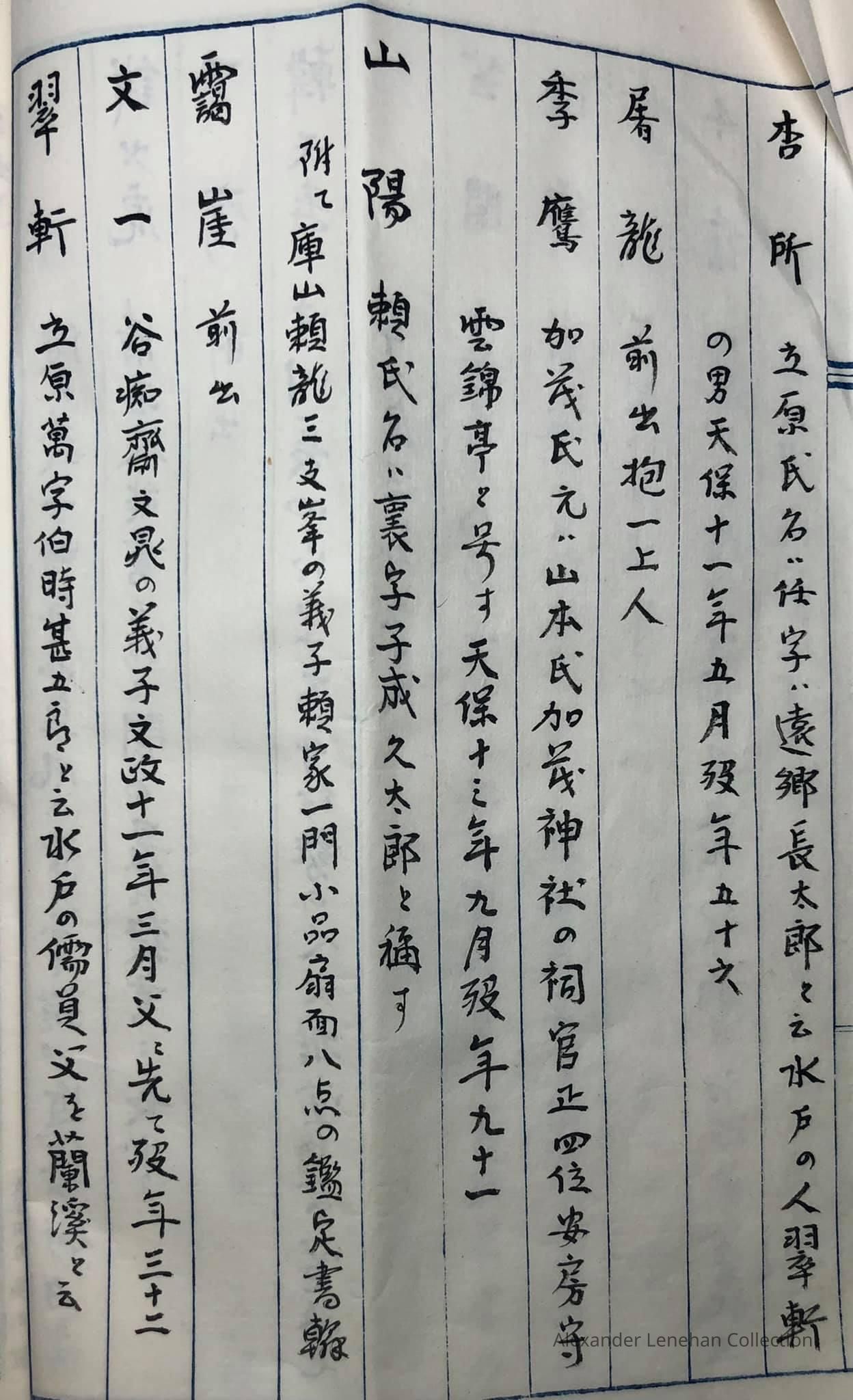 > 雲峯 Unpō 大岡氏名(うじな) Ōoka ujina family name (氏名) 幕府旗下の士 bakufu kika no shi (a samurai in the service of bakufu (shogunate) 天保年中 Tenpō nenchū era (died in the Tenpō era, 1830-1843);