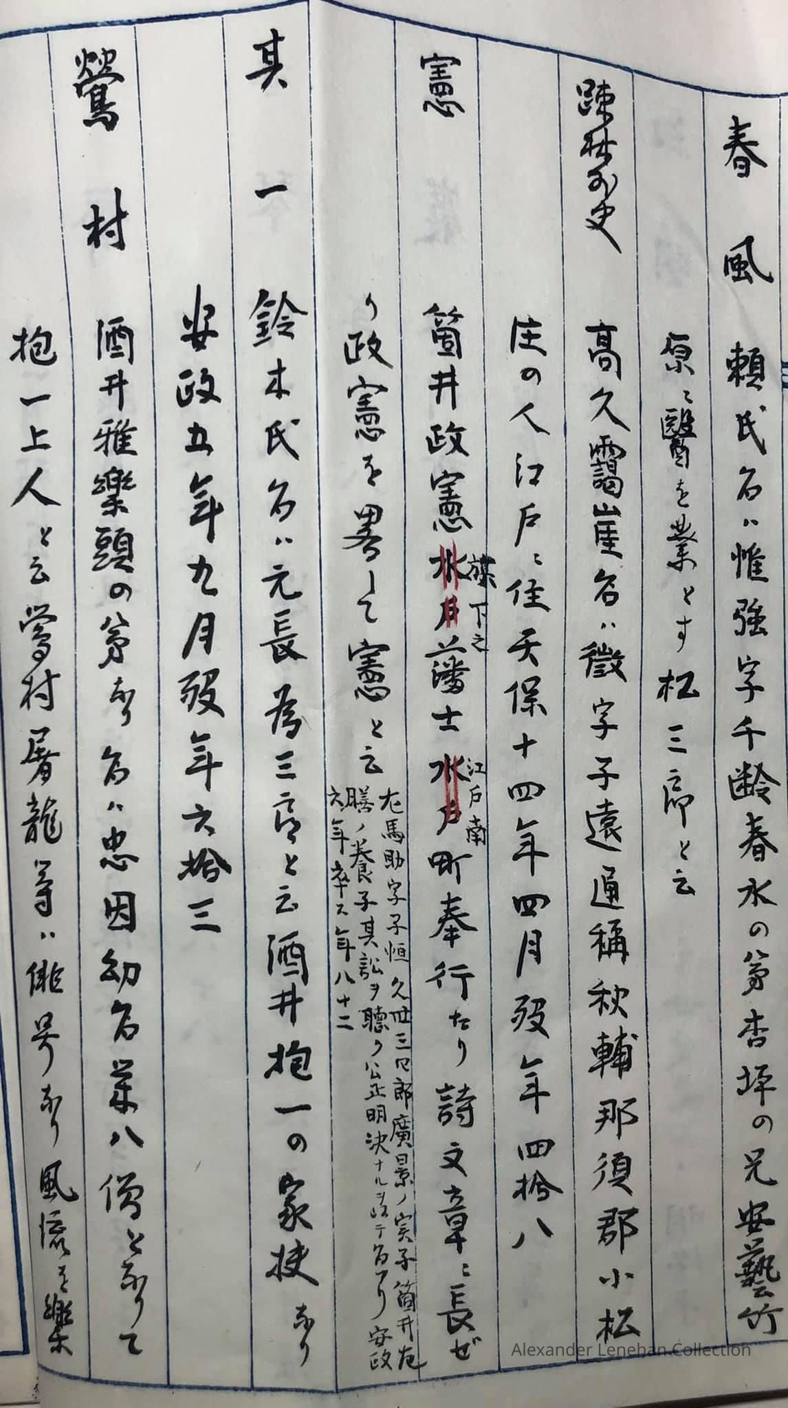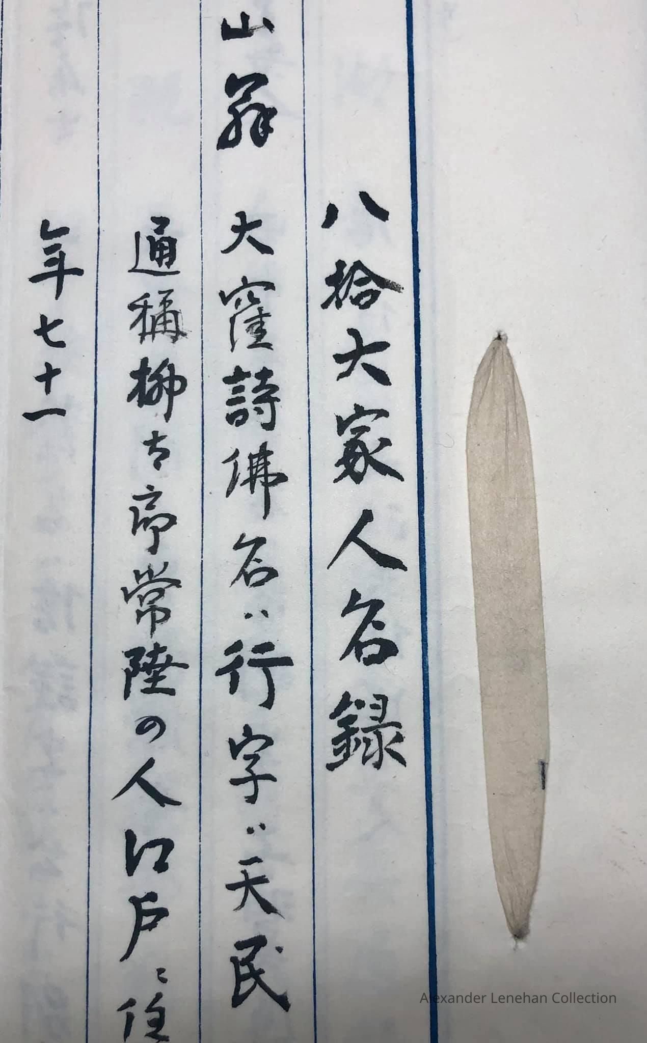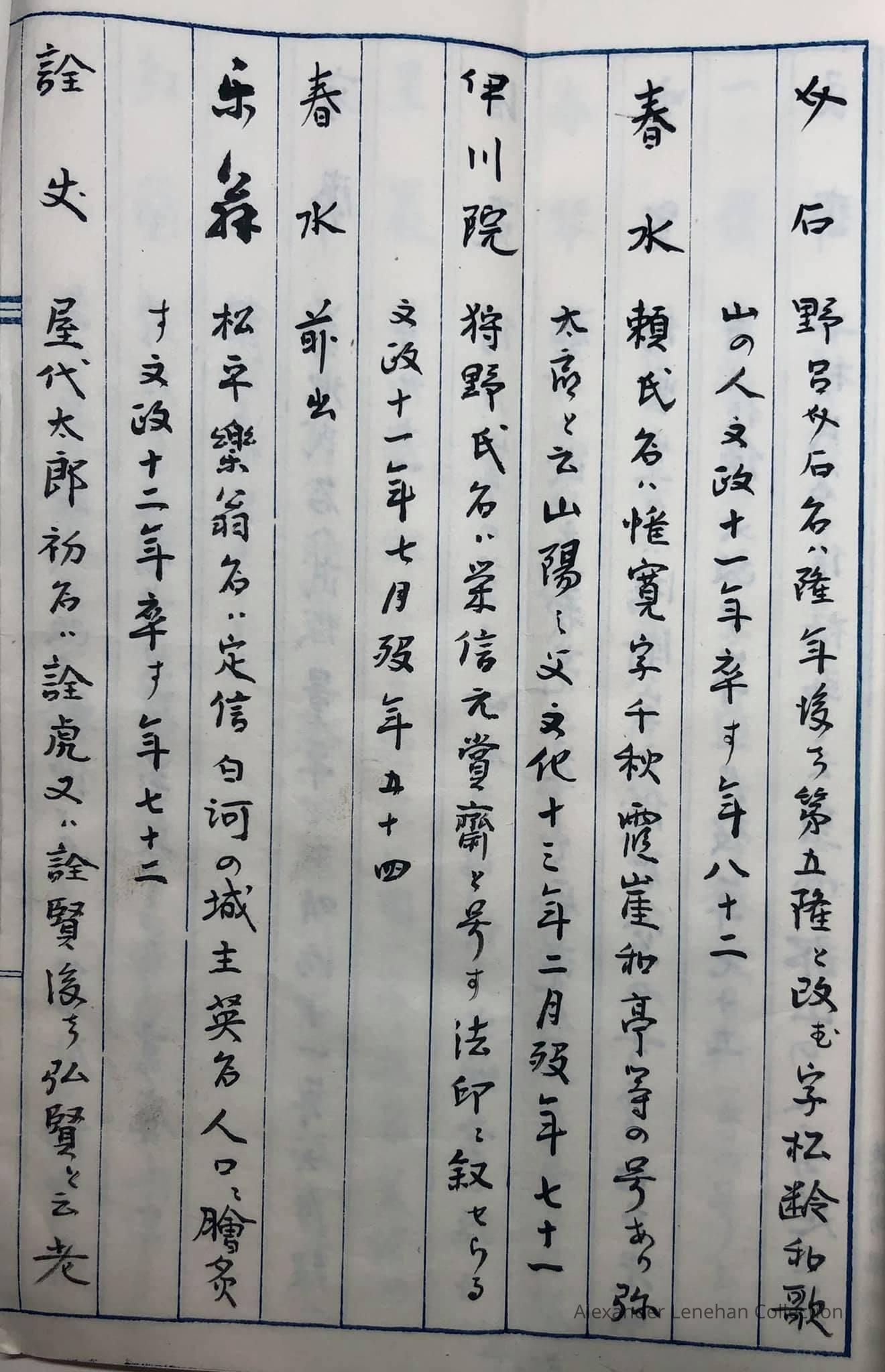 > 雲峯 Unpō 大岡氏名(うじな) Ōoka ujina family name (氏名) 幕府旗下の士 bakufu kika no shi (a samurai in the service of bakufu (shogunate) 天保年中 Tenpō nenchū era (died in the Tenpō era, 1830-1843);