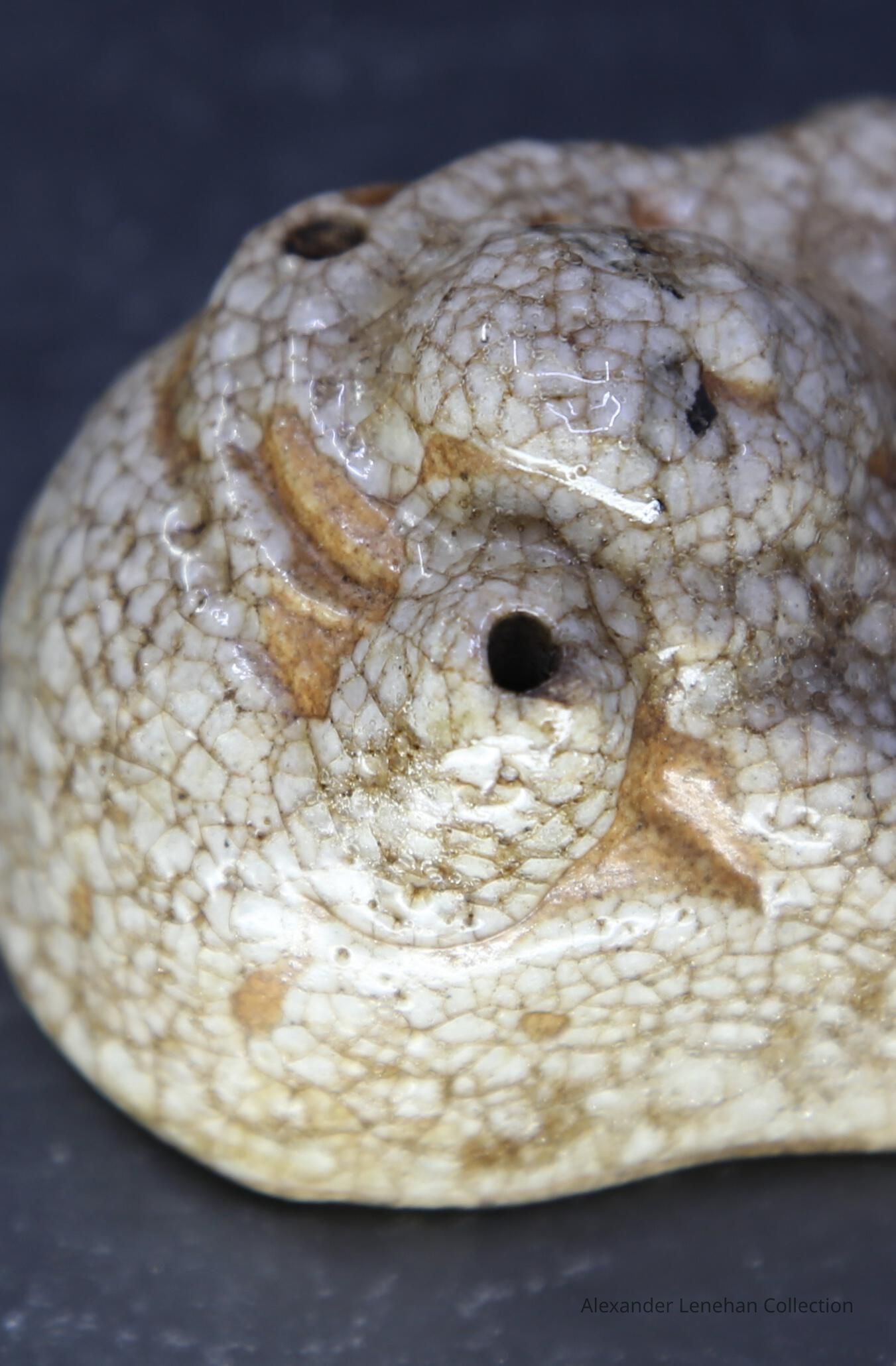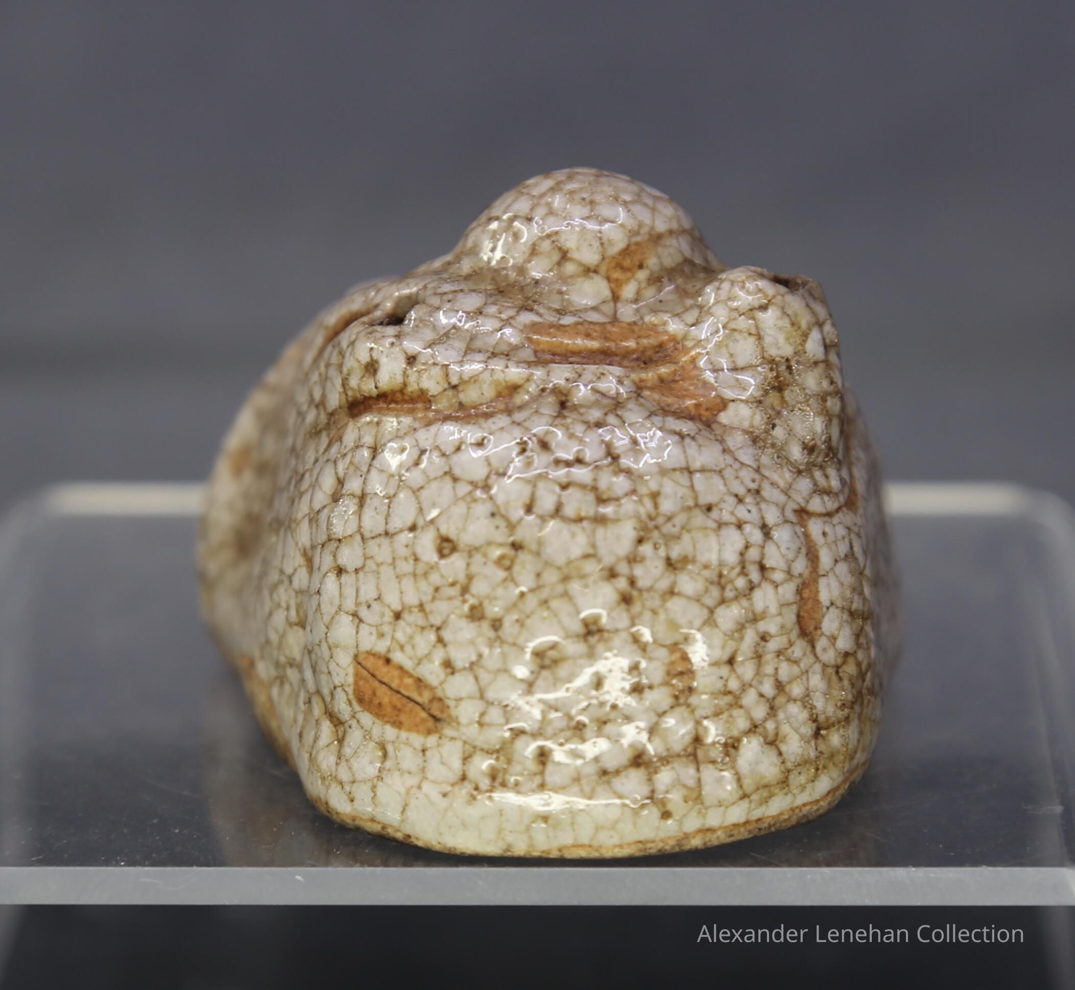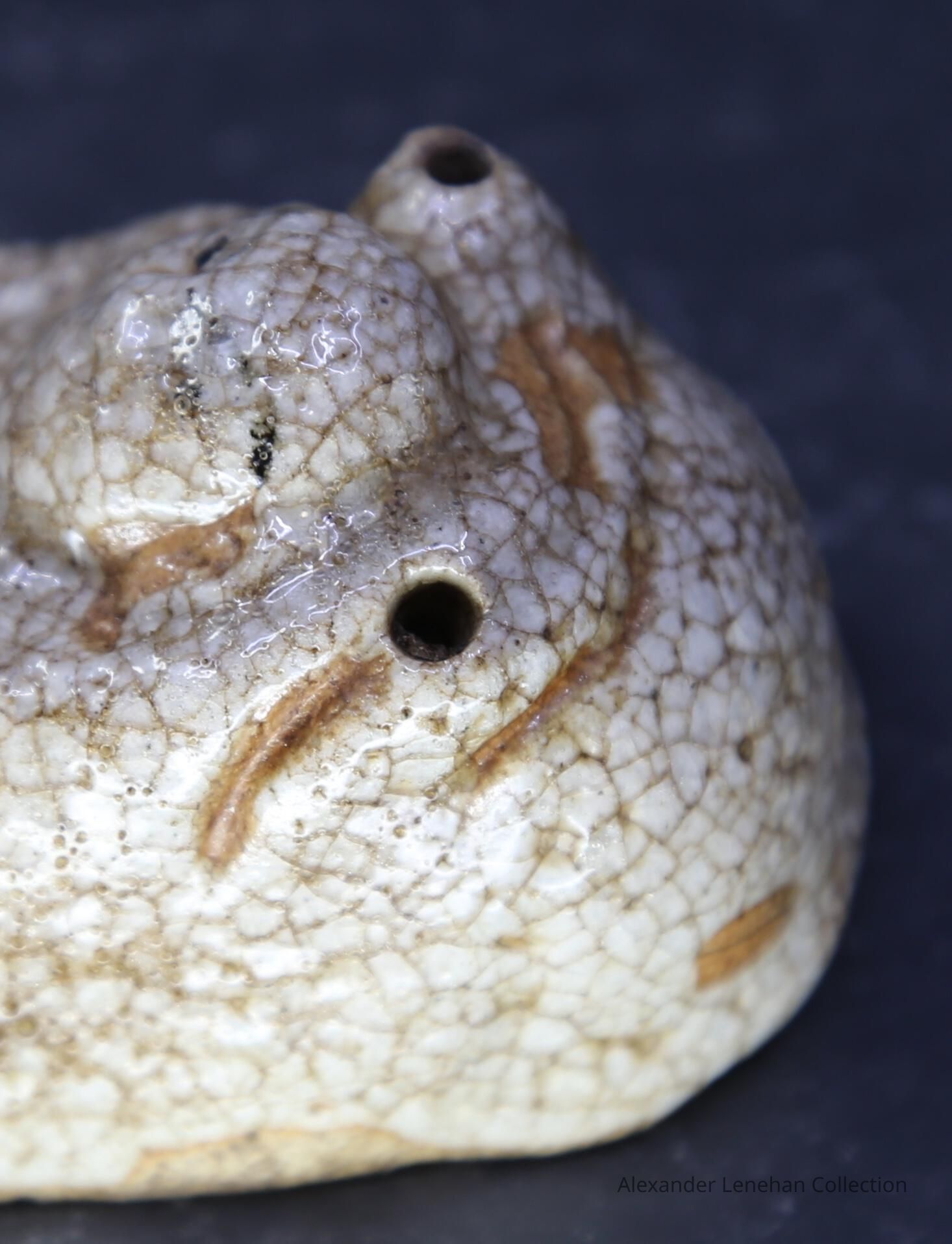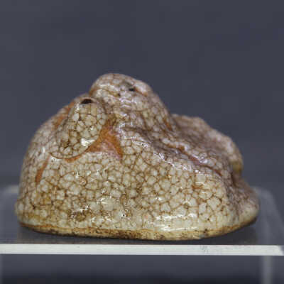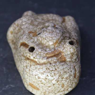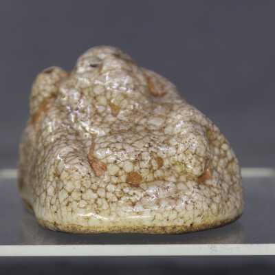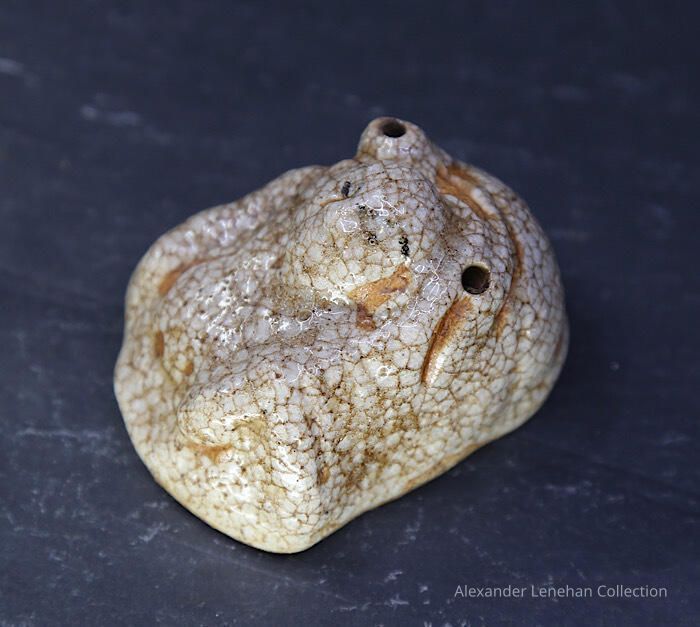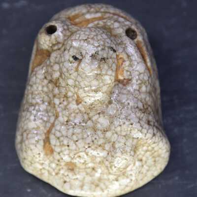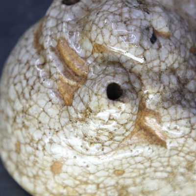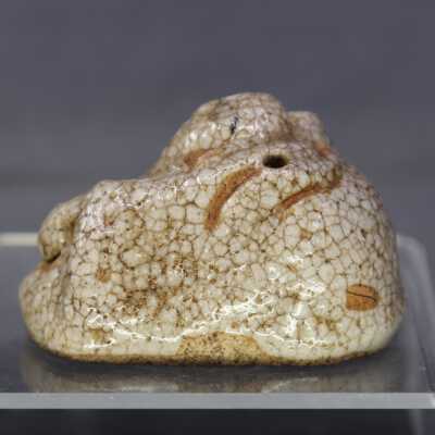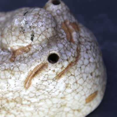 Small water dropper / suiteki in form of Hotei reclining on his sack. Shino glaze.Create Date