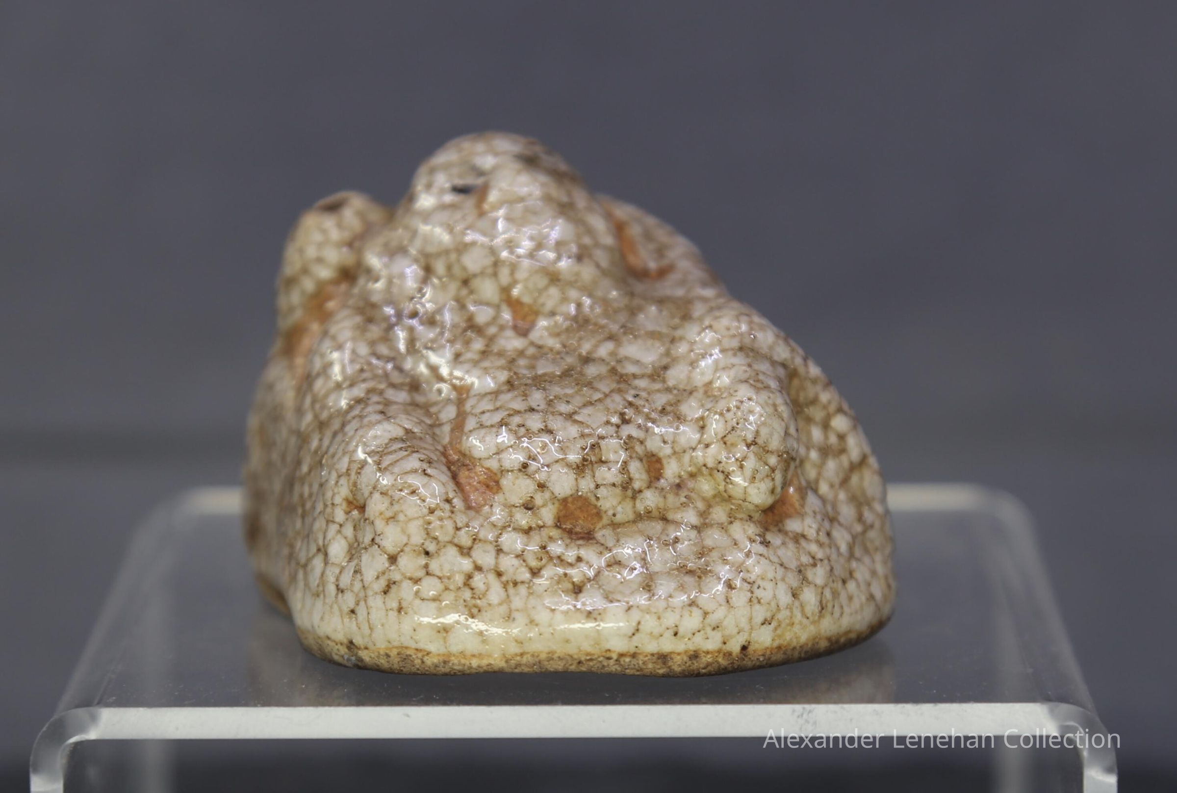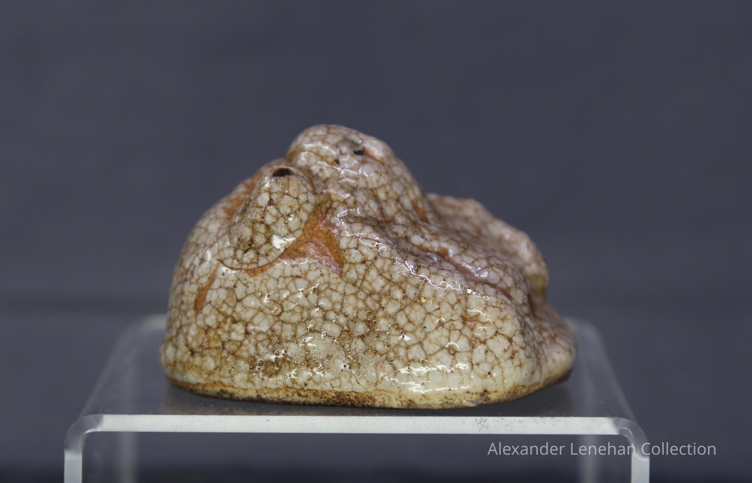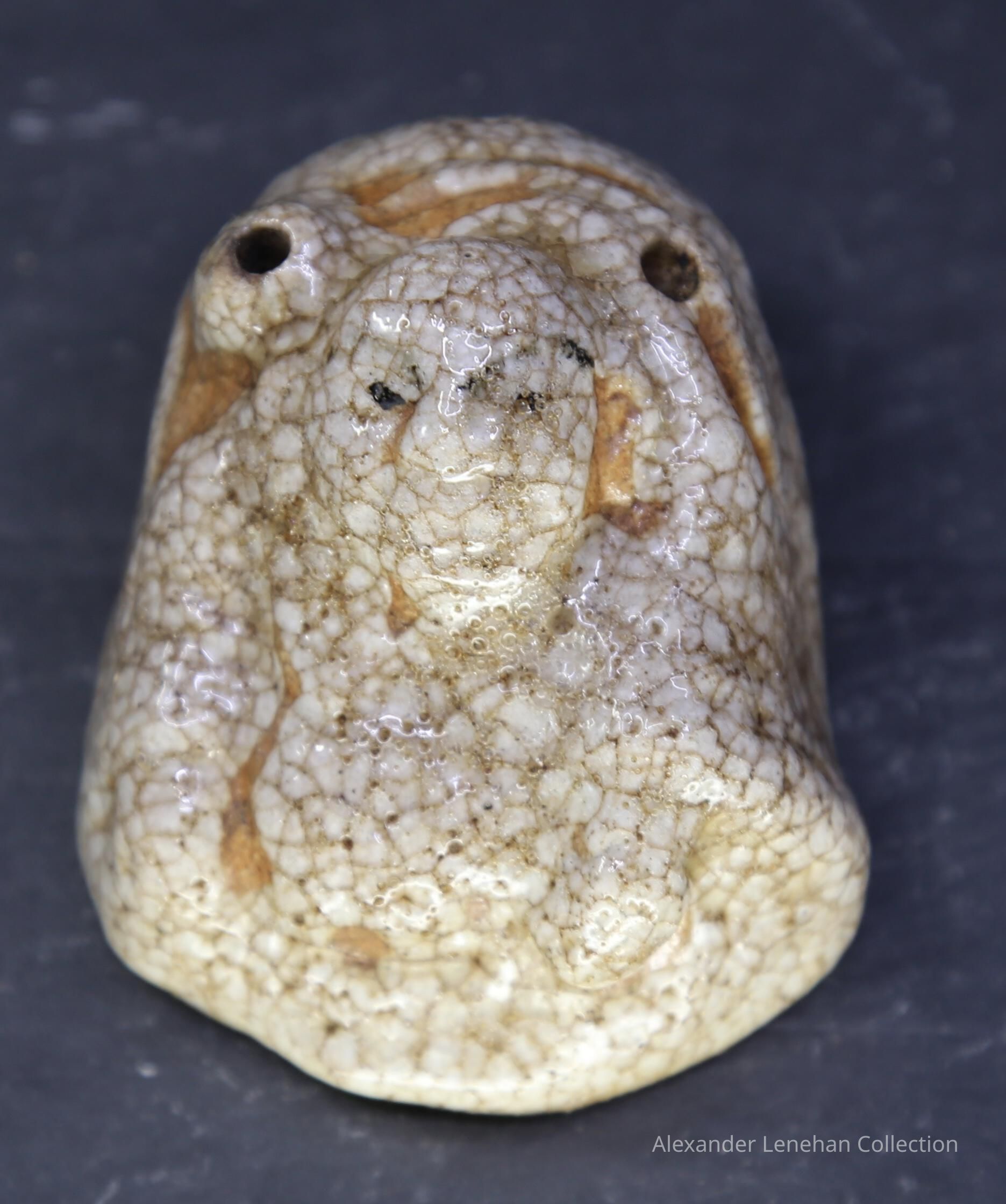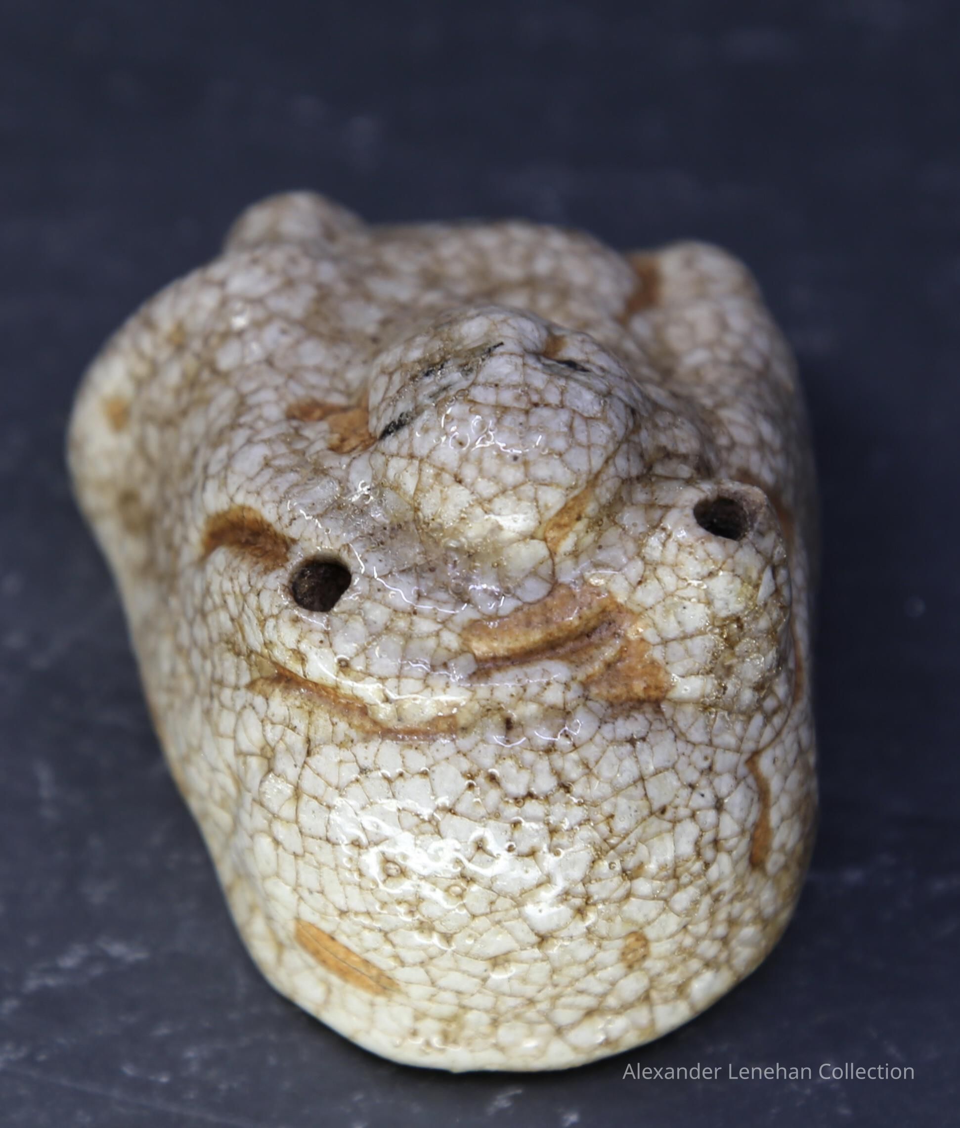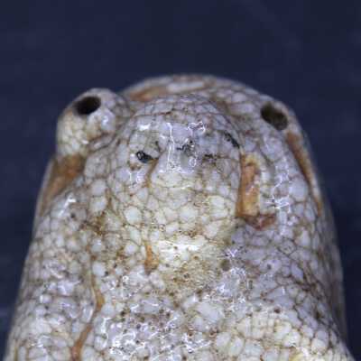 Small water dropper / suiteki in form of Hotei reclining on his sack. Shino glaze.Create Date