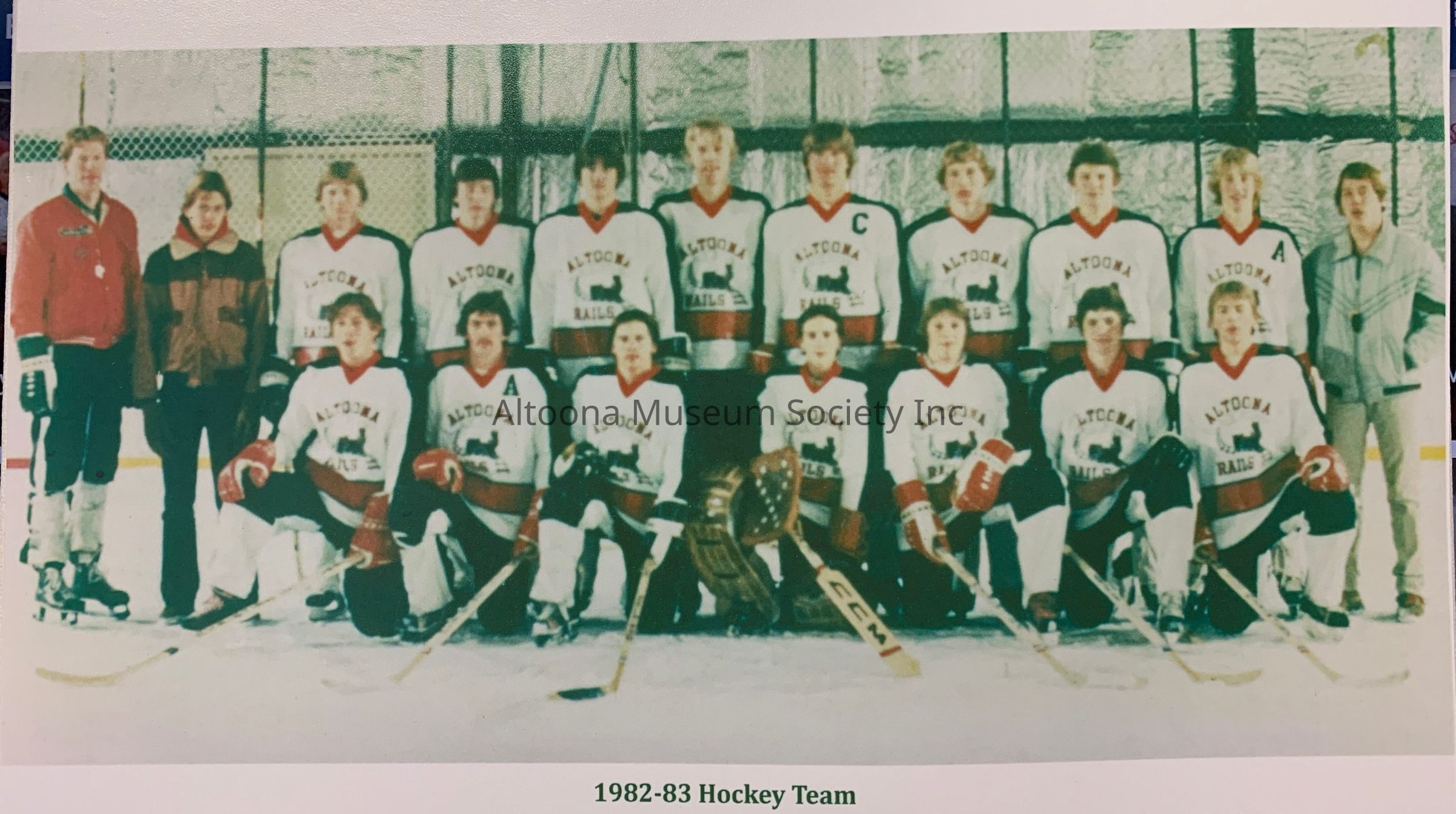 1982-83 Hockey Team - Front Row: 17 John Jaskowski, 12 Ed Schafer, 16 Pete Weghorn, 1 Grant Heiman, 8 Scott Meyer, 5 Wally Kaye, 10 Jim Smith