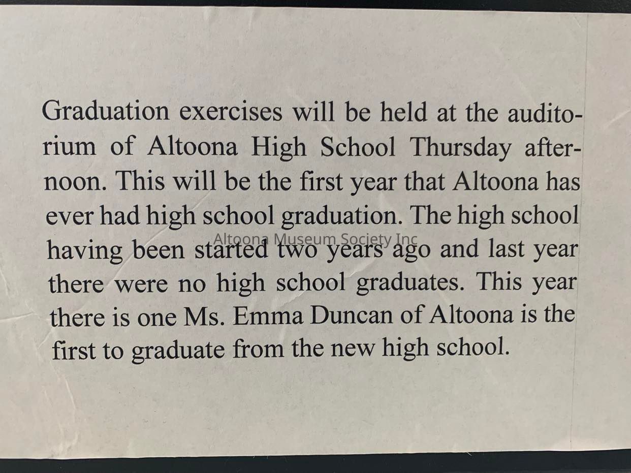 Ms. Emma Duncan 1st graduste of AHS-Graduation held in the Altoona HIgh School Auditorium
