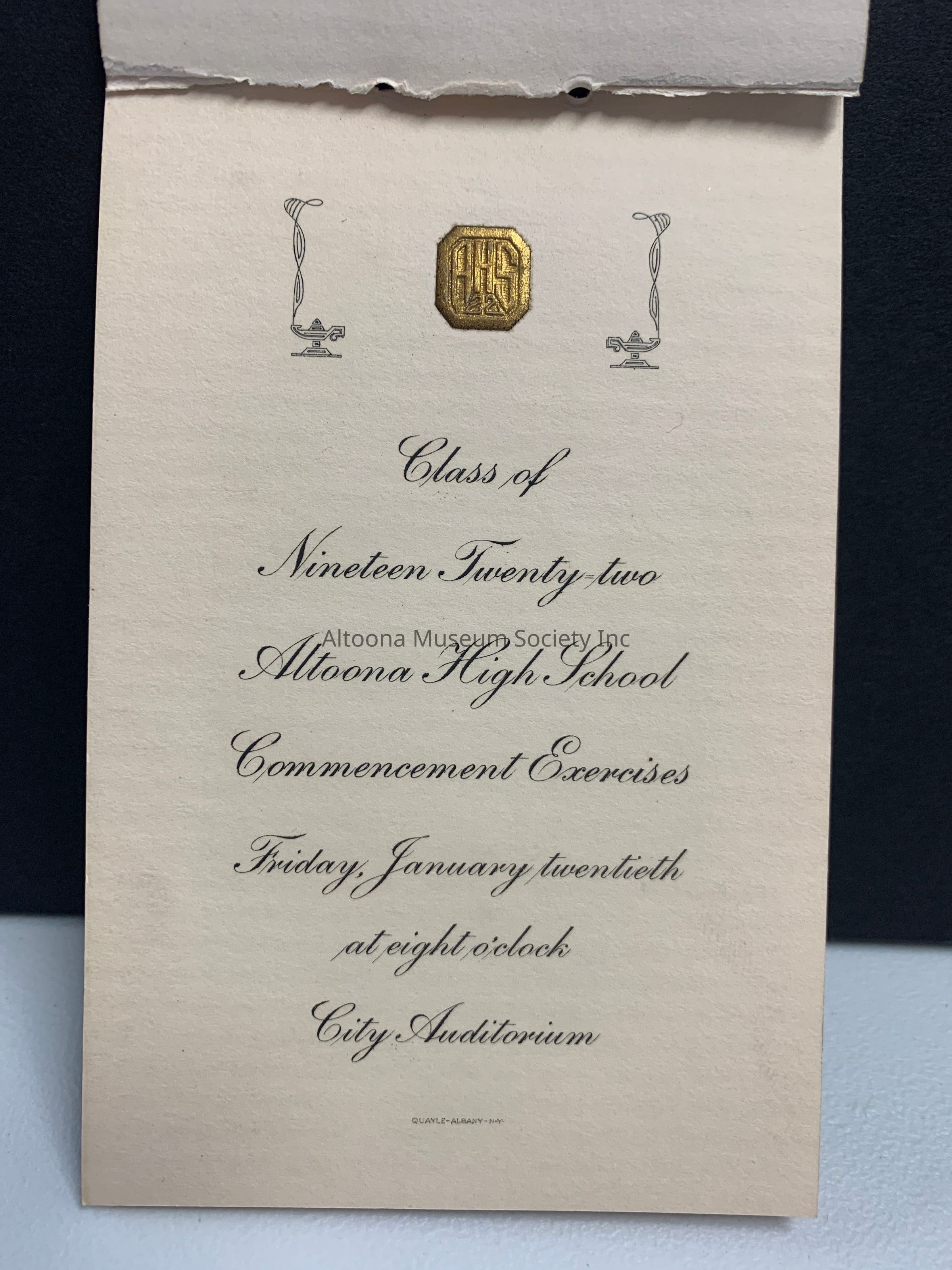 Class of 1922 Altoona High School Commencement Exercises Friday, January twentieth at eight o'clock City Auditorium.