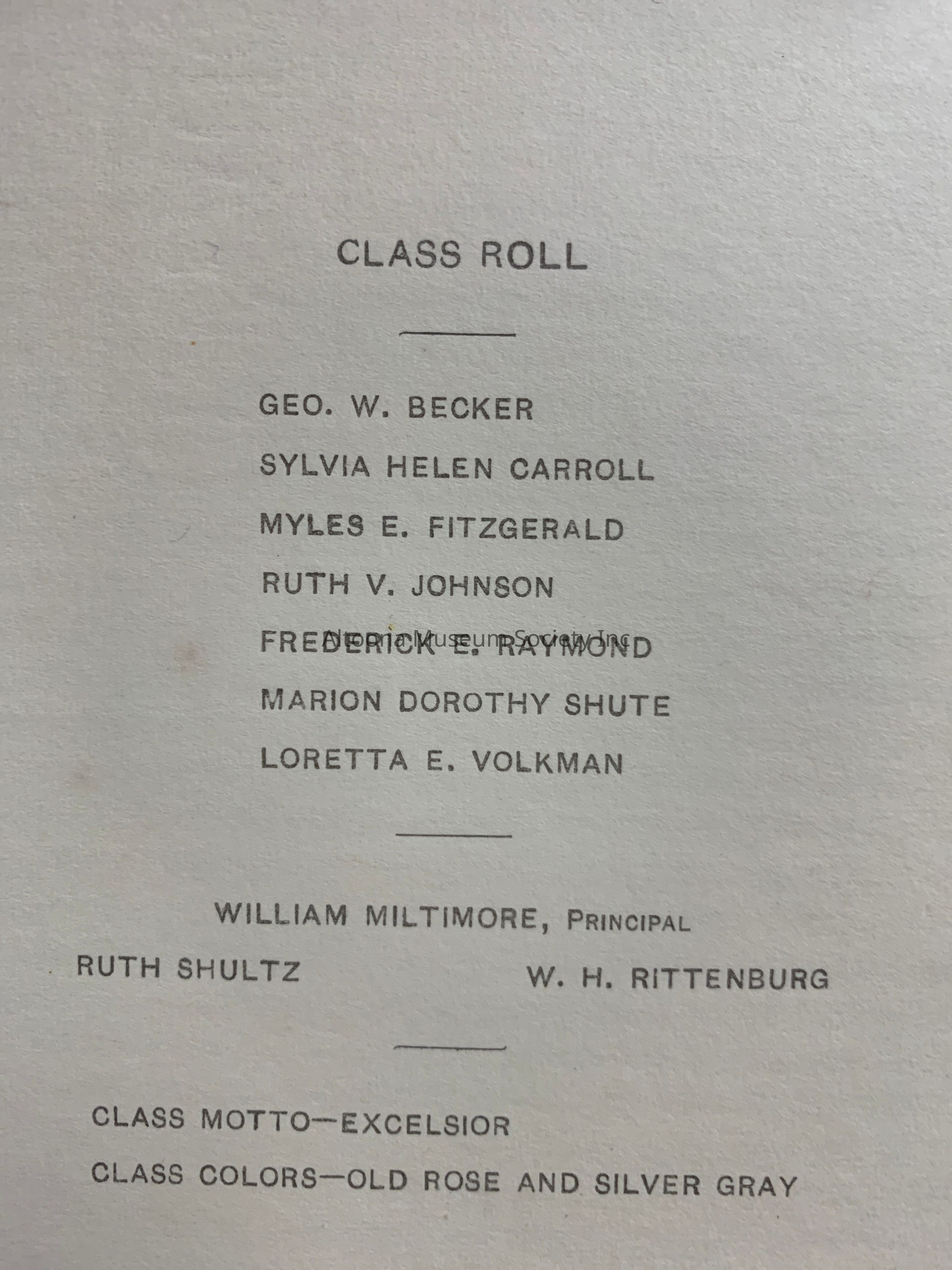 Class Roll: Geo. W Becker, Sylvia Helen Carroll, Myles E. Fitzgerald, Ruth V. Johnson, Frederick E. Raymond, Marion Dorothy Shute, Loretta E. Volkman
