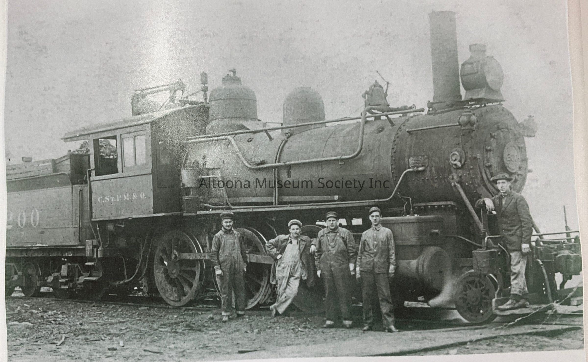 Engine 200 Altoona Rail yard 1915. Pictured left to right: L.J. Stephny, George W. Green, Sy Jacobson, Louise P. Bonnie, H. Sturz. CStPM & built and delivered July 1892 by American Loco Co., Schenectady, N.Y. Works, builders #3793 cylinders 19 x 24 Drive Wheels 52", Boiler pressure lbs PSI, weight of engine alone 125,100, tractive effort 24,964. Class F-2 4-6-0 Water Capy 3300 gals. Coal 8 tons. Disposition unknown.