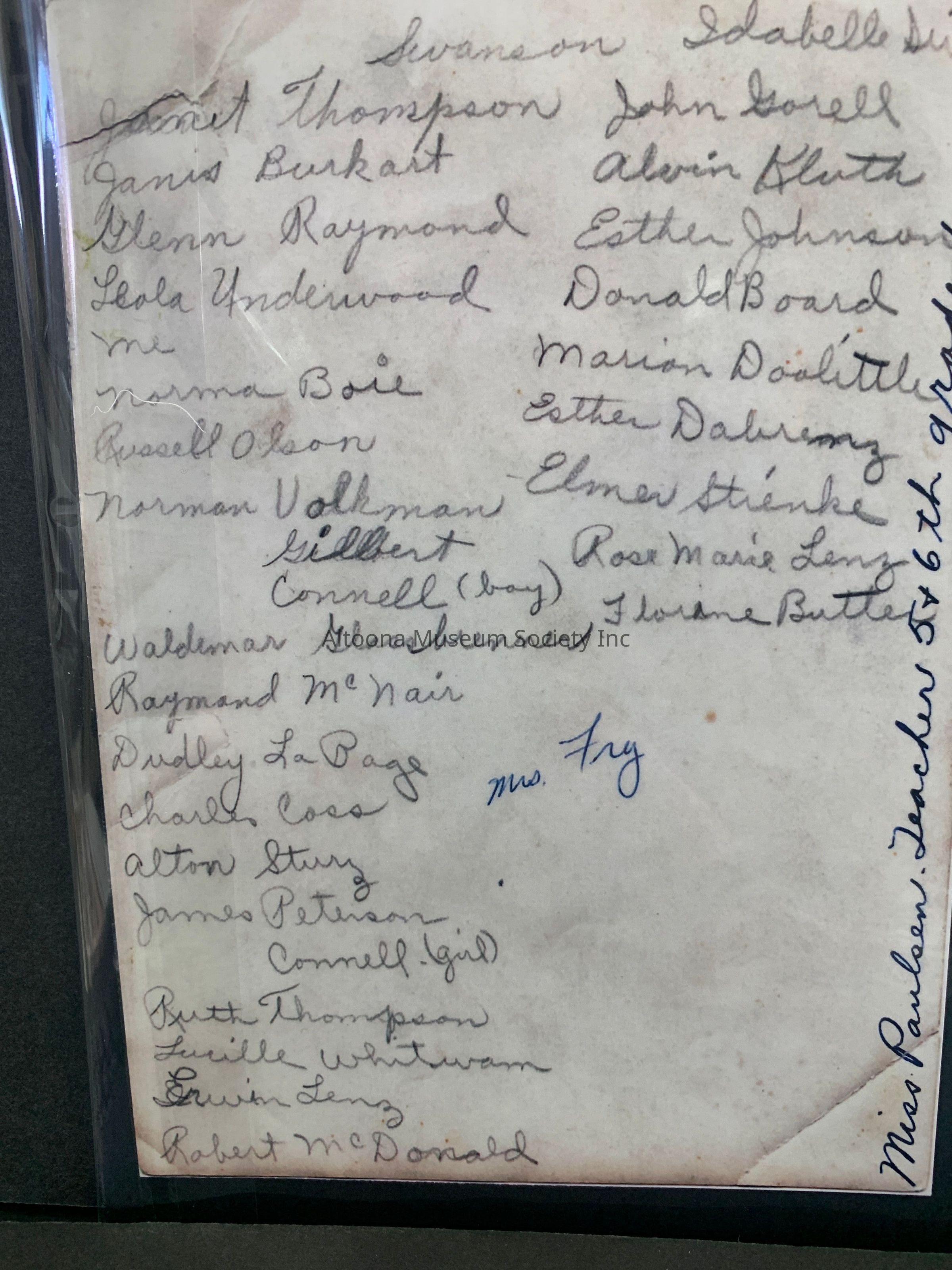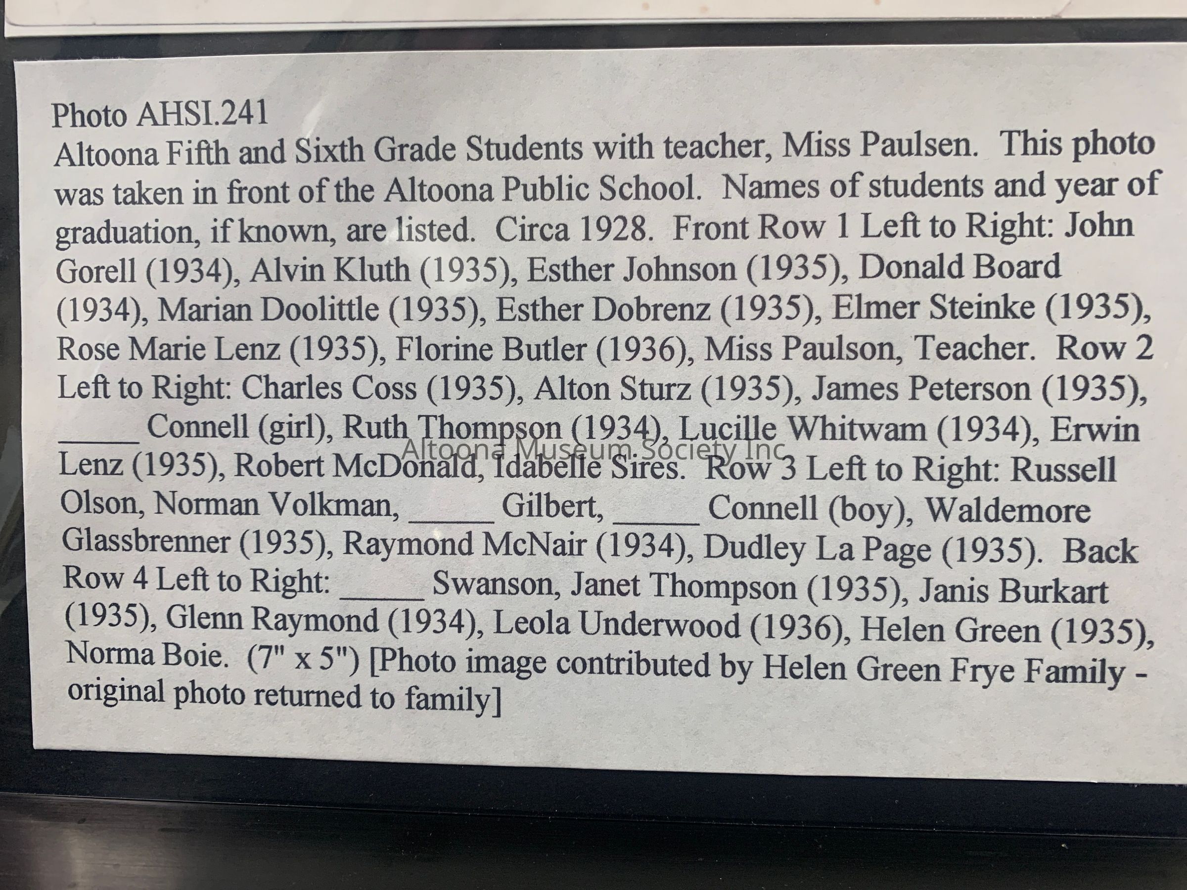 Picture is from Helen Green Frye family; Helen was born in Eau Claire, WI and graduated from Altoona High School in 1935. See attached picture with names of students and year they graduate (if known).Acquisition
