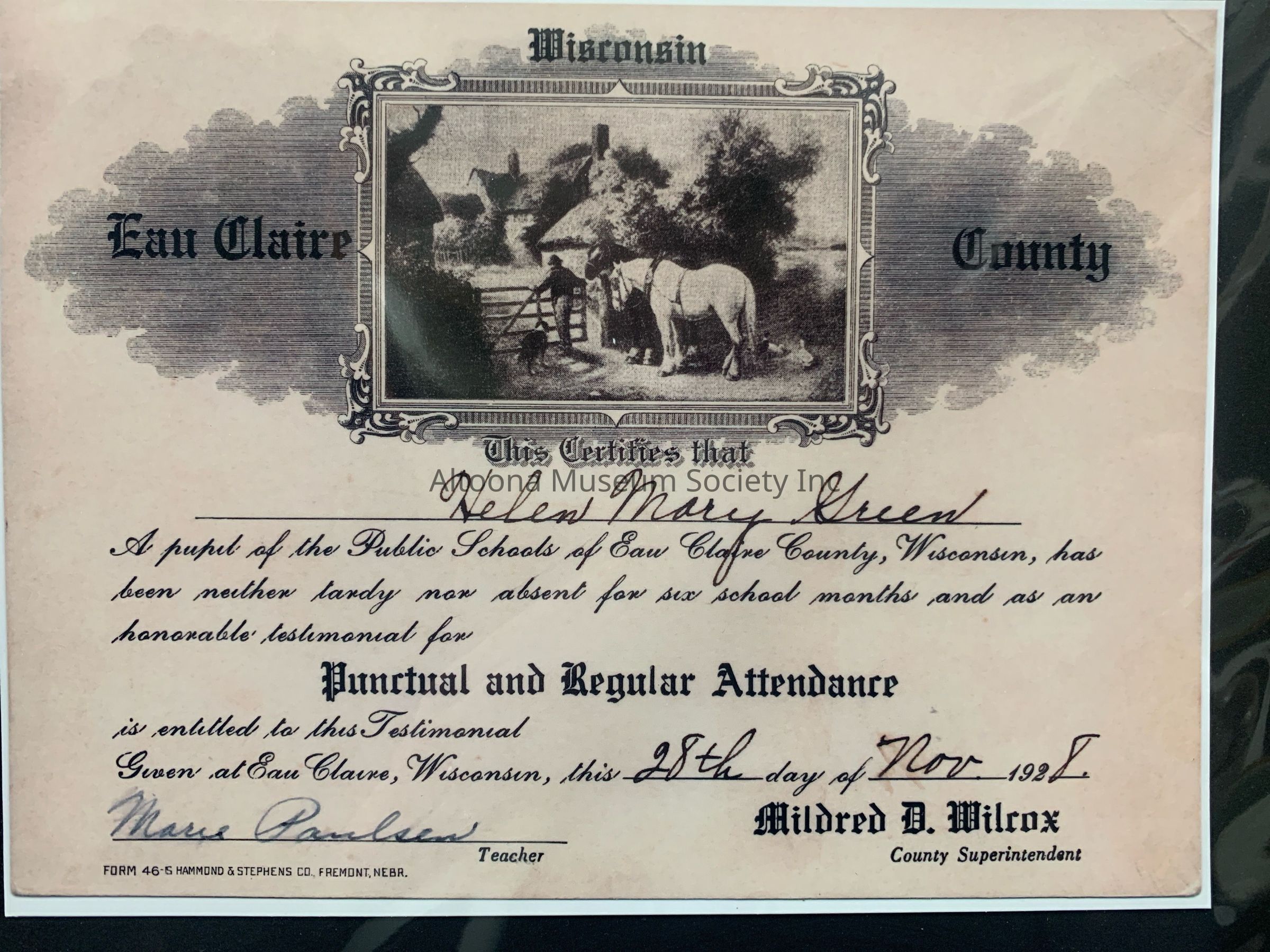 November 28, 1928 - Helen Mary Green received a Punctual and Regular Attendance Certificate from Public Schools of Eau Claire County, Wisconsin. Marie Paulsen - Teacher, Mildred D. Wilcox - County Superintendent.Acquisition