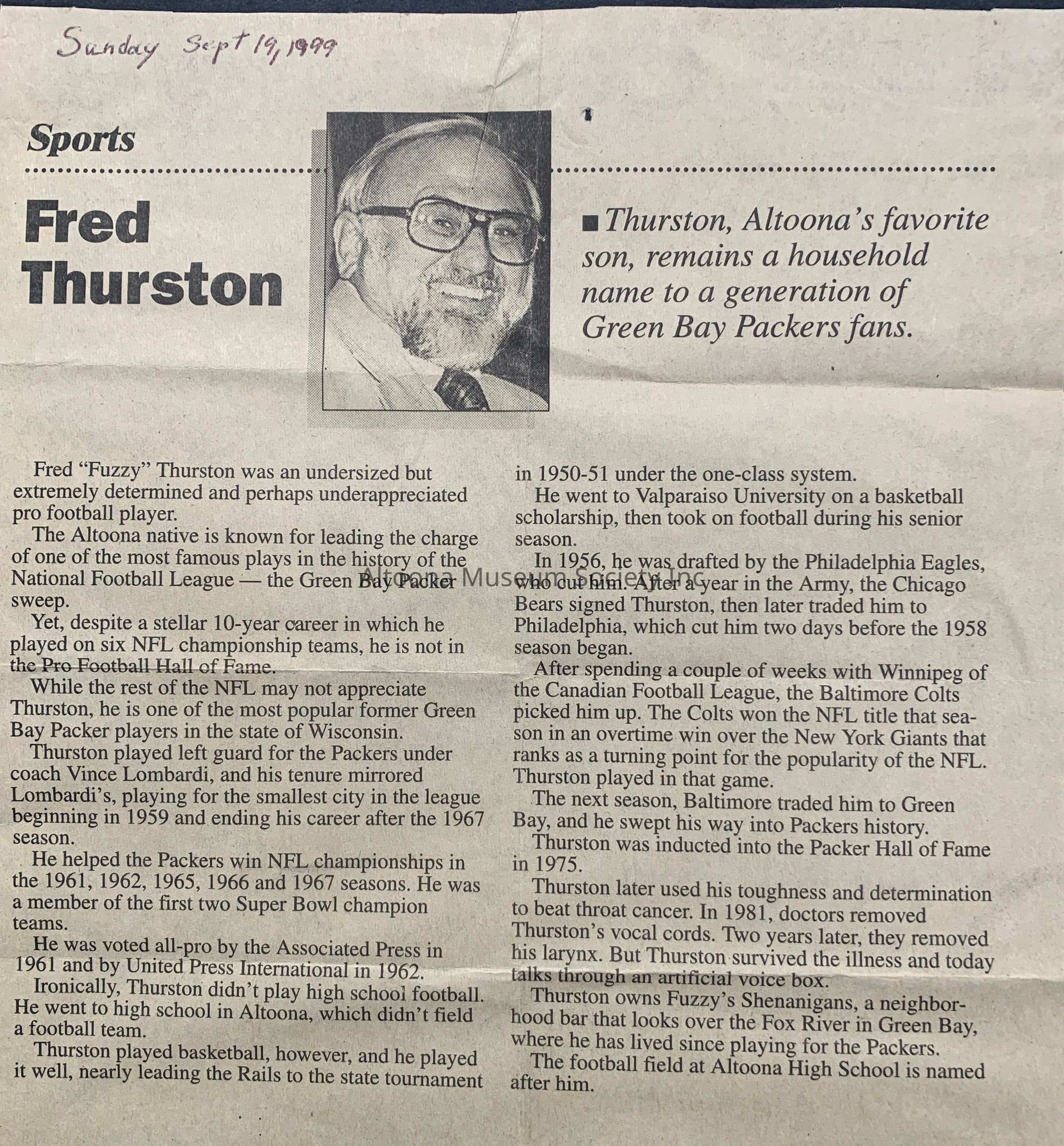 News article “ Thurston, Altoona’s favorite son, remains a household name to a generation of Green Bay Packer fans
