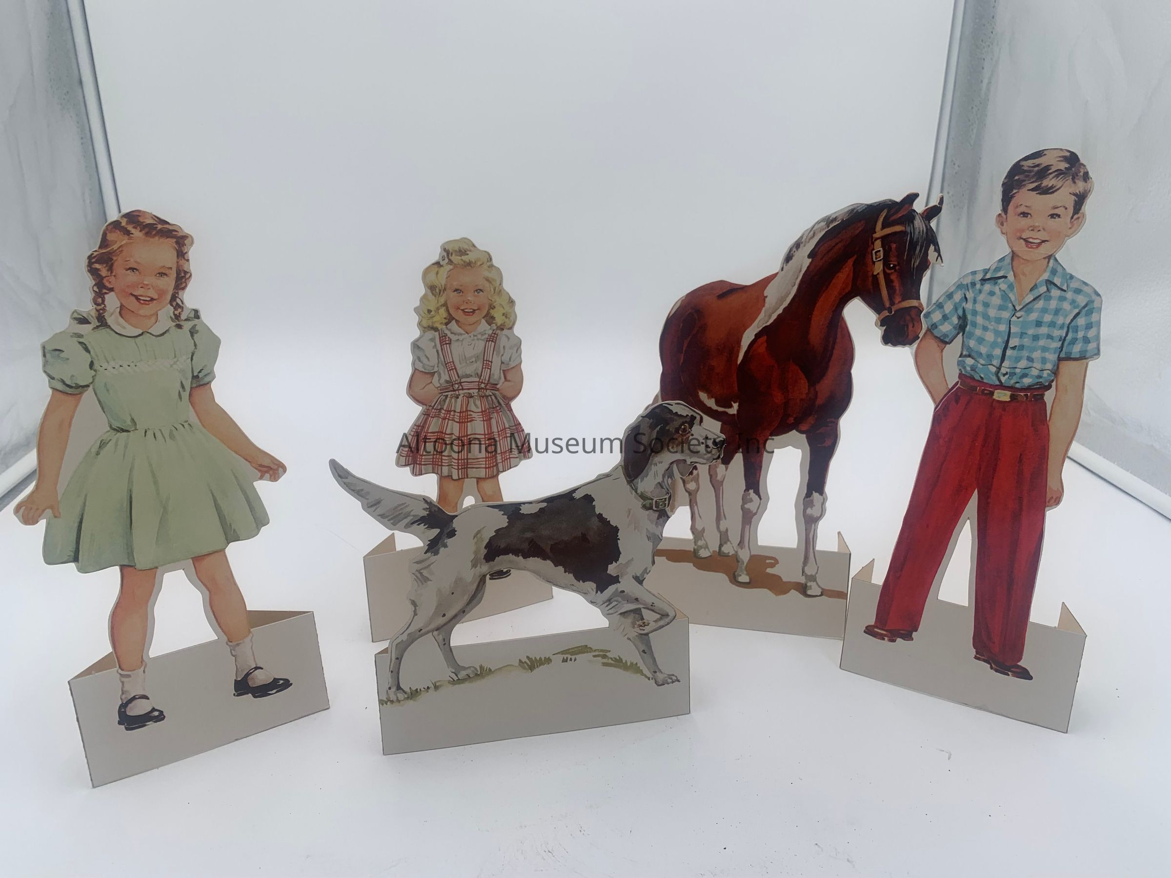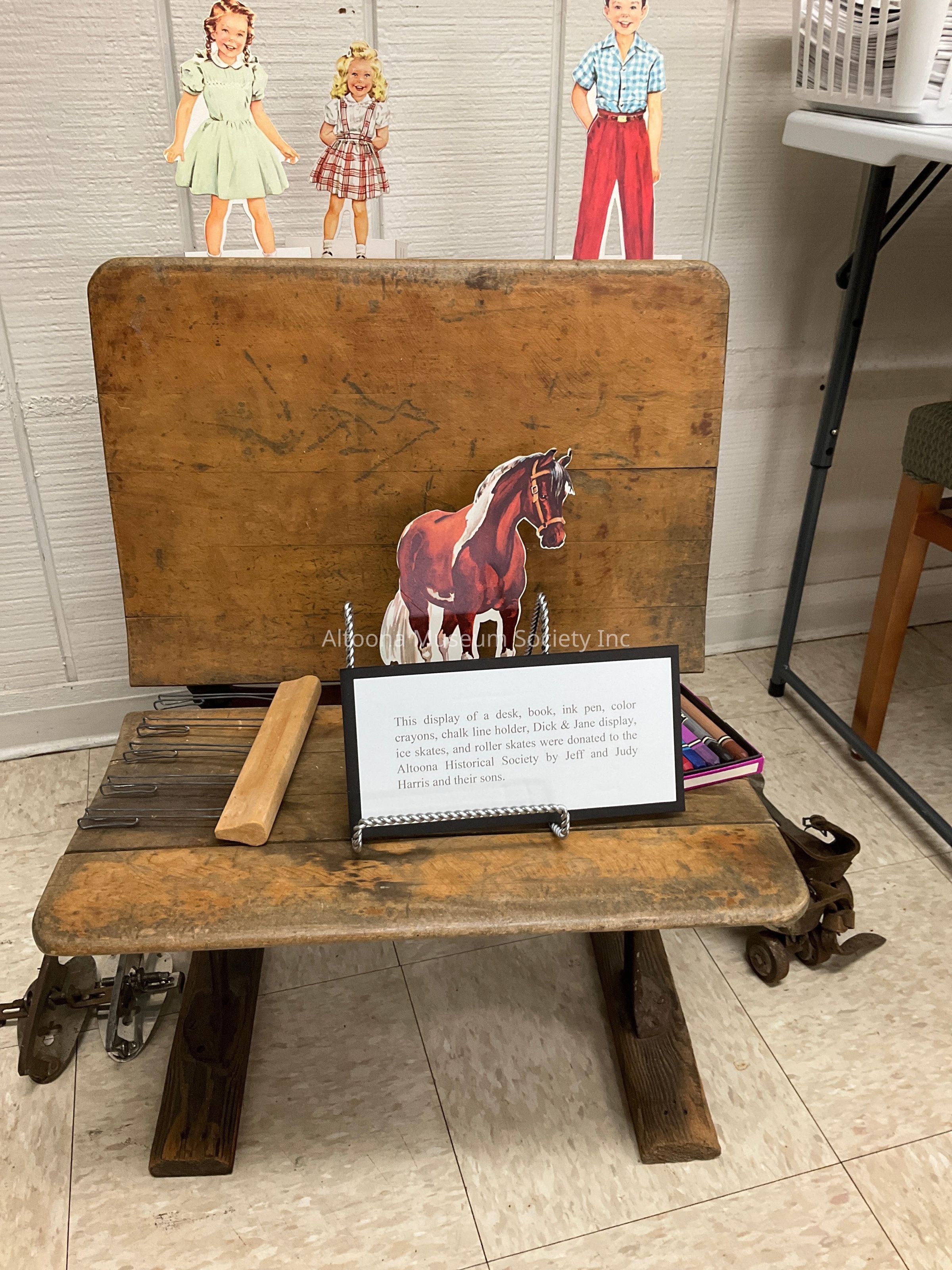 This display of a desk, book, ink pen, color crayons, chalk line holder, Dick & Jane display, ice skates and roller skates were donated to the AHSI by Jeff and Judy Harris and their sons.