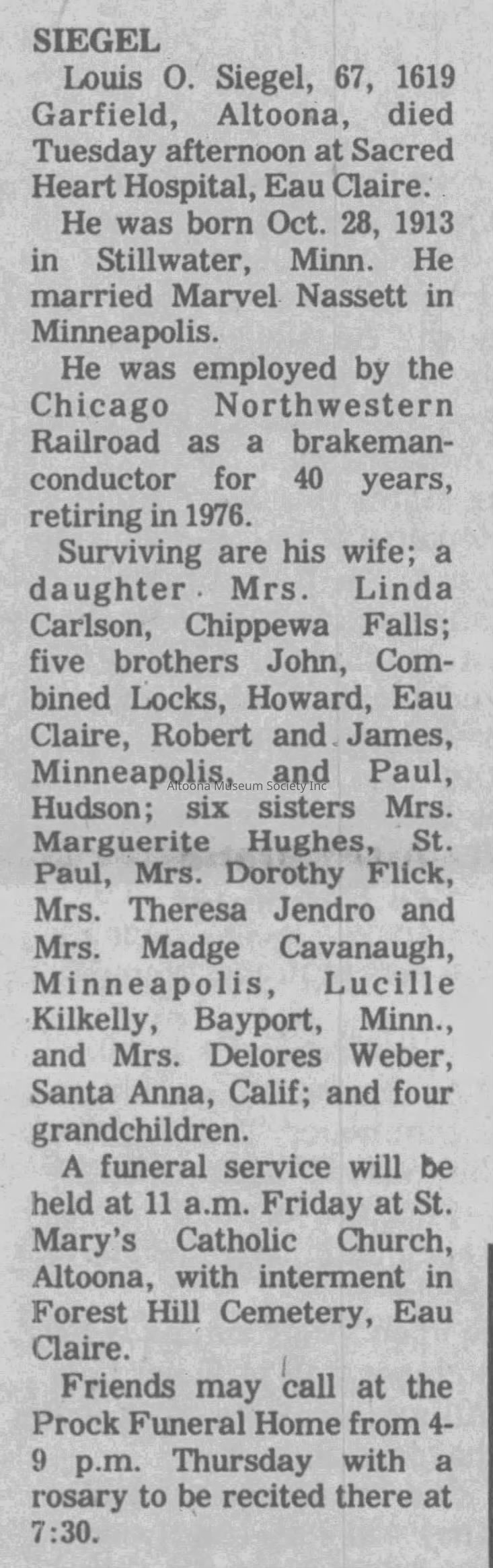 Louis Siegel uniform. He was a resident of Altoona and was employees by the CNW as a brakeman-conductor for 40 years retiring in 1976. He worked on the 400 that passed through Altoona.