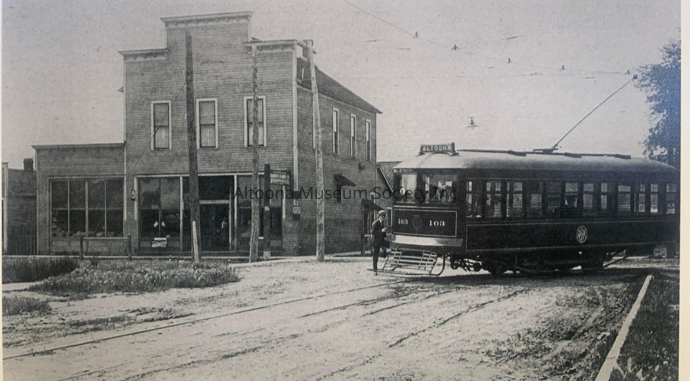 Streetcar in downtown Altoona coming around the corner of Lynn Avenue and Division Street. This photo is looking south toward Edward W. Pond's building which had a General Store downstairs and a meeting room upstairs. This is a hardware store to the left.