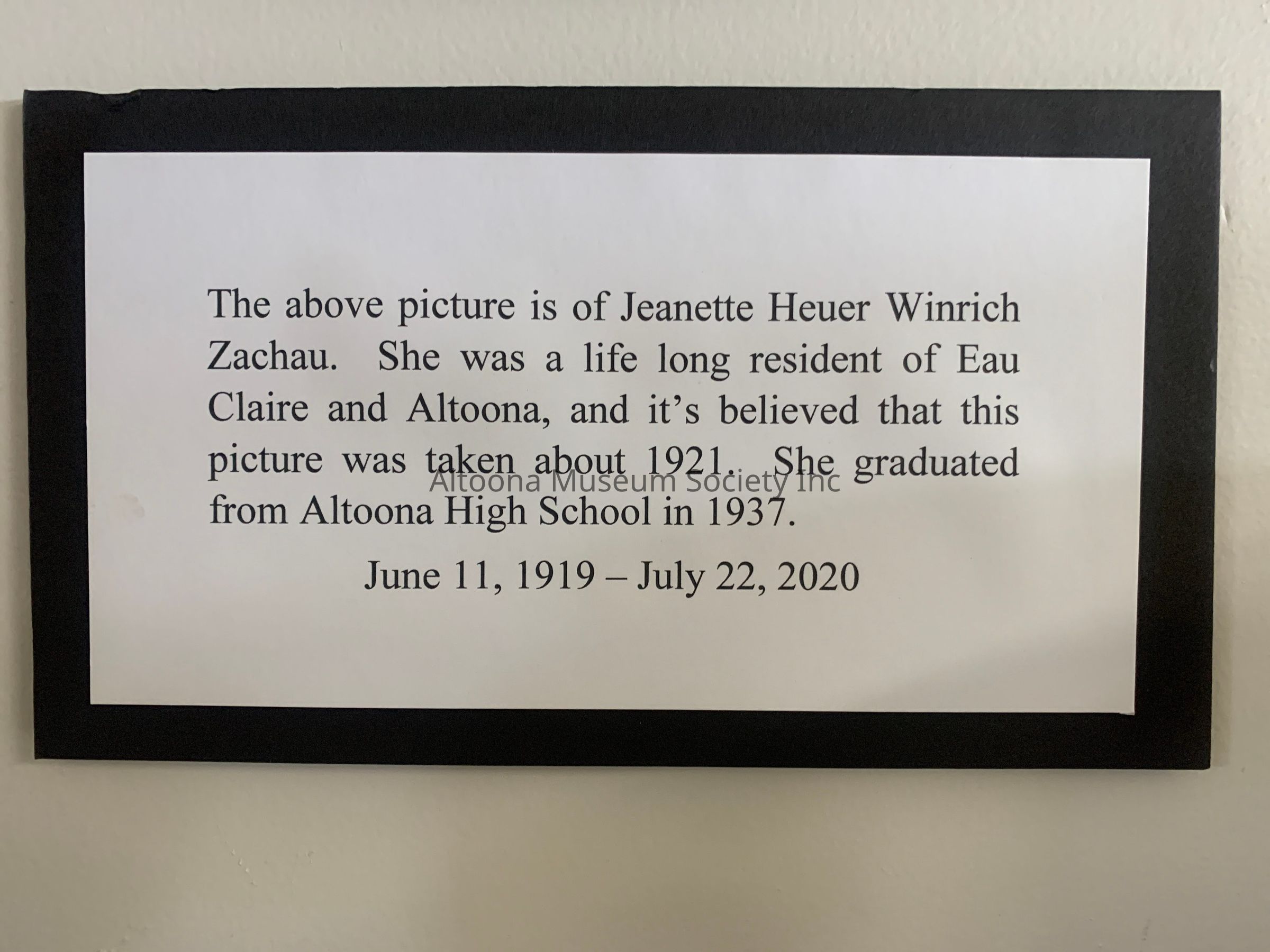 This picture is of Jeanette Heuer Winrich Zachau. Jeanette was a lifelong resident of Eau Claire and Altoona, and it is believed this picture was taken about 1921. Jeanette graduated from Altoona High School in 1937.