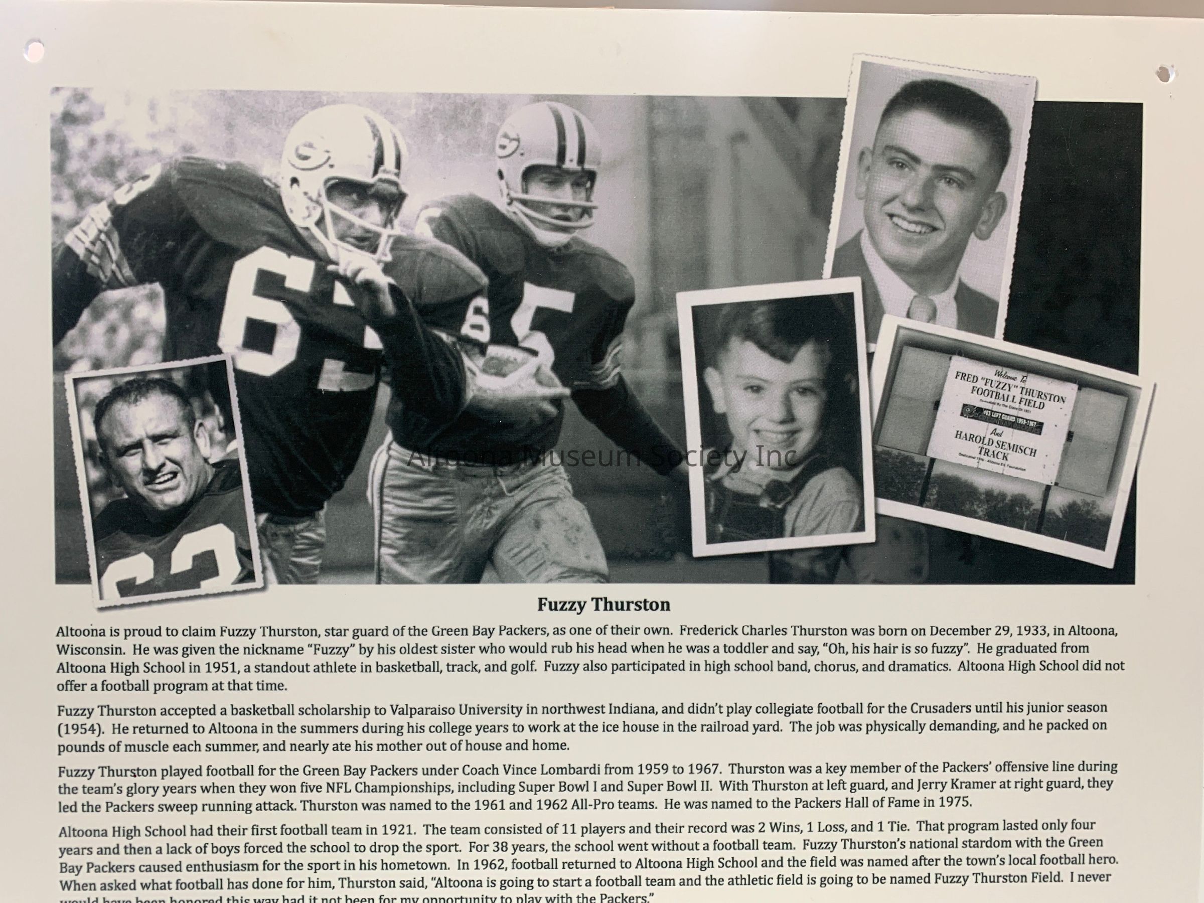 Frederick Charles Thurston (Fuzzy) was born 12/29/33 in Altoona, graduated from AHS in 1951 a standout athlete in basketball, track and golf. Fuzzy accepted a basketball scholarship to Valparaiso University, Northern Indiana. He returned in the summers of his college years to work in the ice house at the rail yard. Fuzzy Thurston played football for the Green Bay Packers from 1959 - 1967 under Coach Vince Lombadi. He was part of the team that won 5 National Championships including Super I and II. He was named to 1961 & 1962 All Pro Teams and to Packers Hall of Fame in 1975.