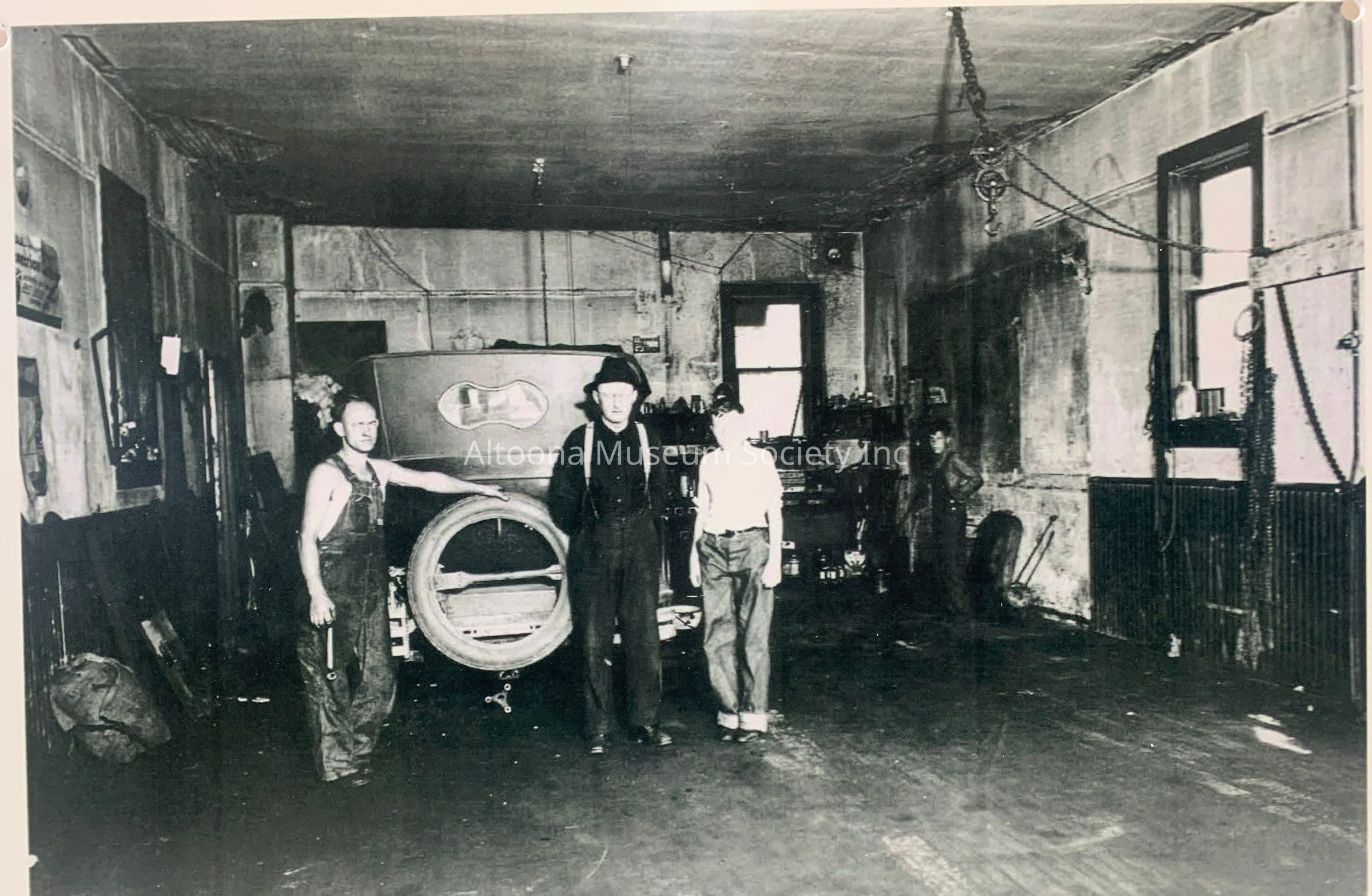 Dwight "Dyke" Neill (left) with unidentified people in his garage (car repair business) in Altoona mid 1930's to early 1940's. In the early 1930's Ted Rasmussen started a garage in the former bank building on Division Street in Altoona. Dwight Neill took over the garage in the mid 1930's and ran it until early 1940's. The owner of the building, Gus Sund, then operated his plumbing shop there until 1947.