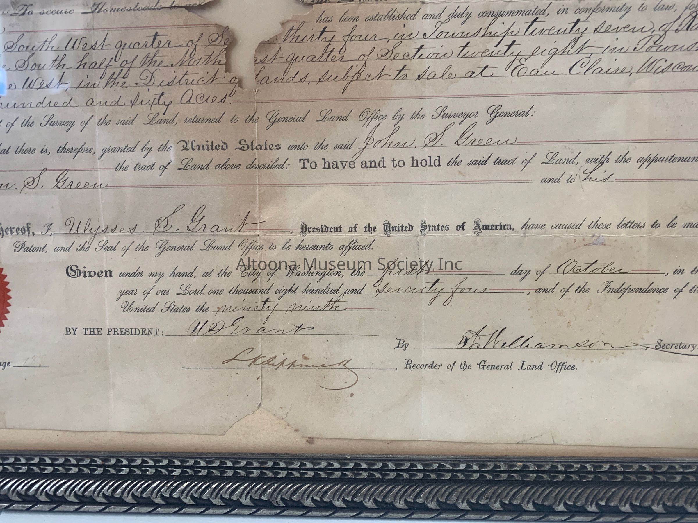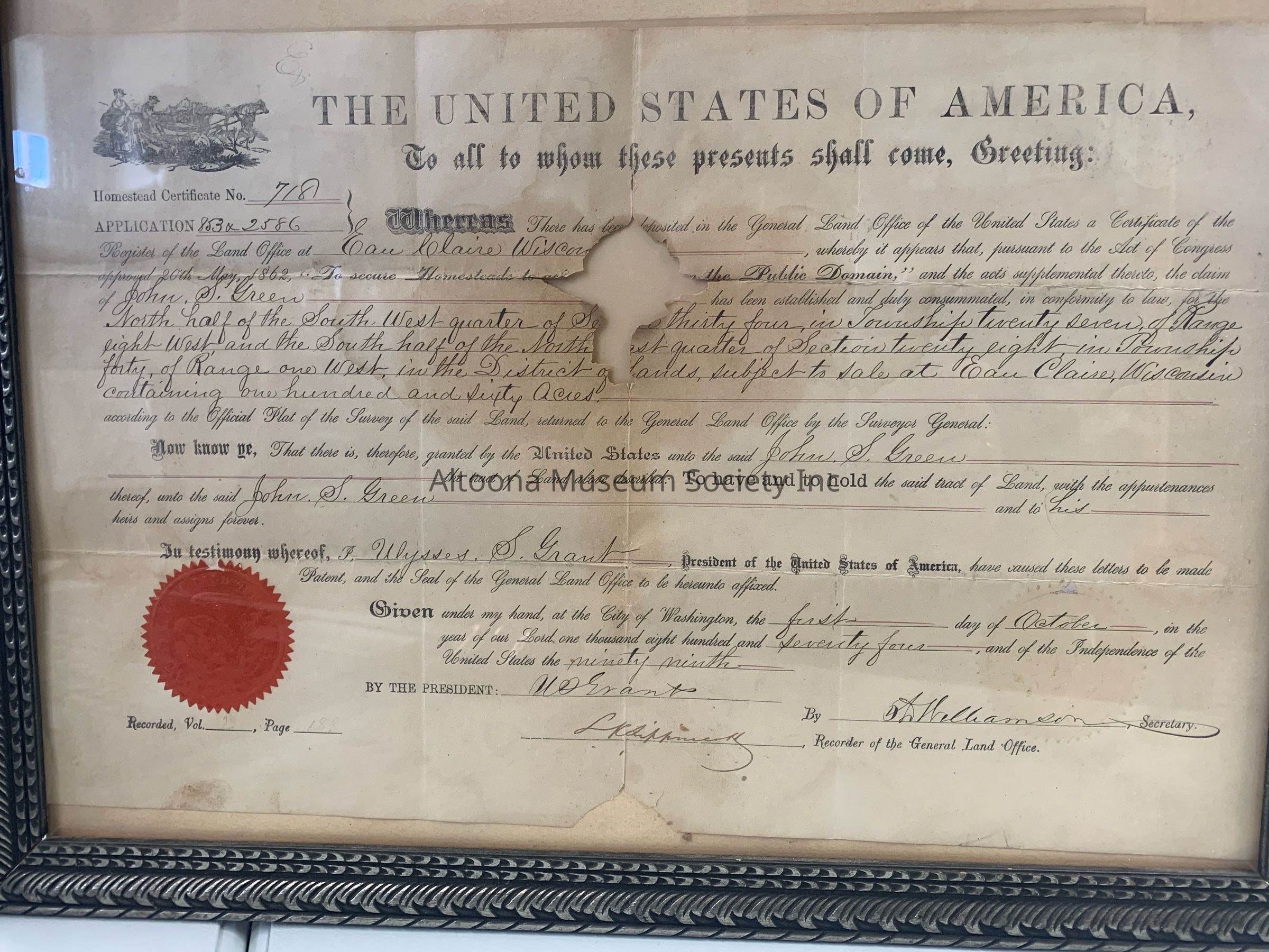 Homestead Certificate for John S Green for 160 acres in Eau Claire County