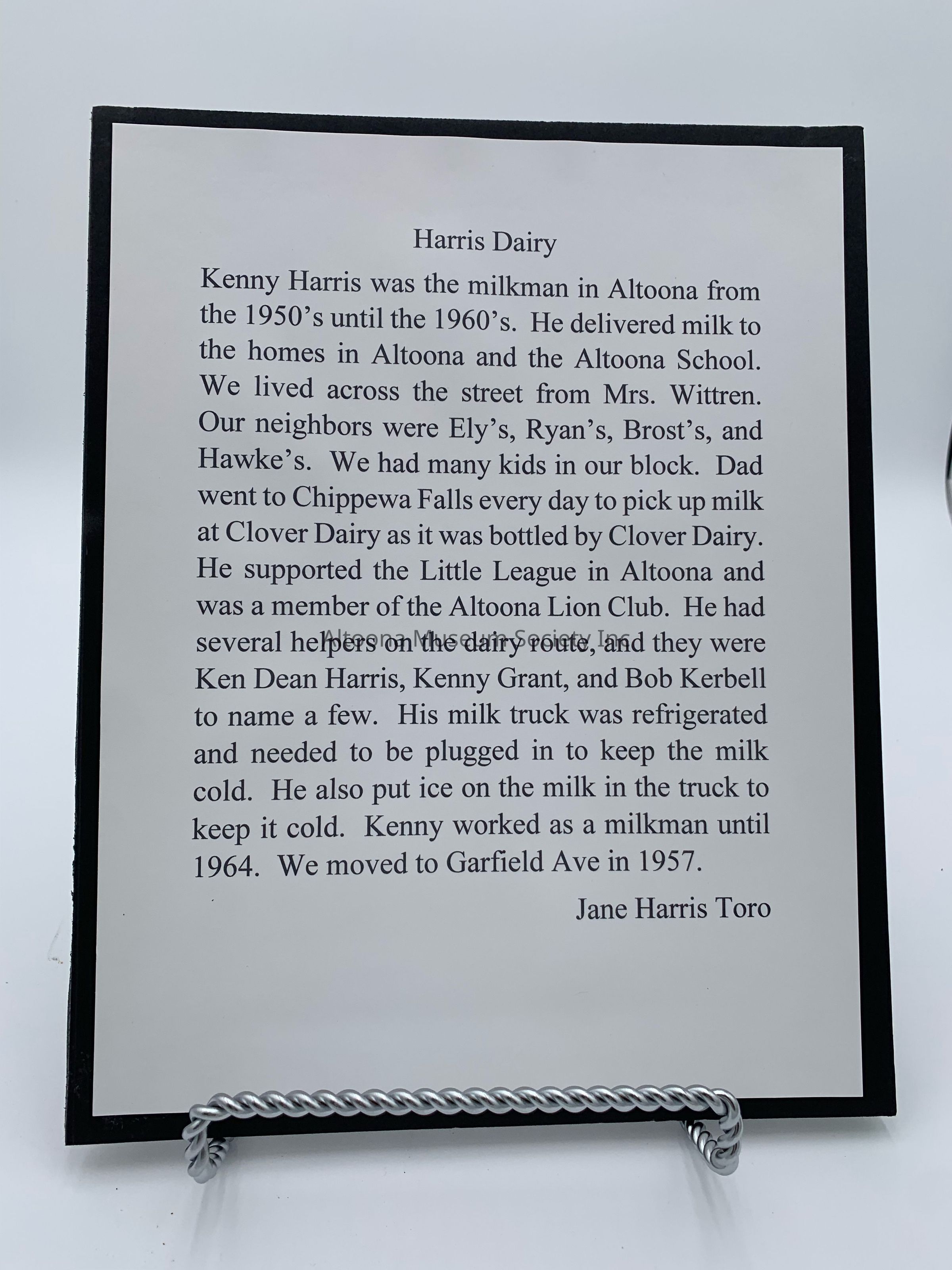 Kenny Harris was the milkman in Altoona from the 1950's until the 1960's. He delivered milk to the homes in Altoona and the Altoona School. Kenny Harris went to Chippewa Falls every day to pick up milk at Clover Dairy as it was bottled at Clover Dairy. Kenny's milk truck was refrigerated and needed to be plugged in to keep the milk cold. Kenny also put ice on the milk in the truck to keep it cold. Kenny worked as a milkman until 1964. He moved to Garfield Avenue, Altoona WI in 1957Acquisition