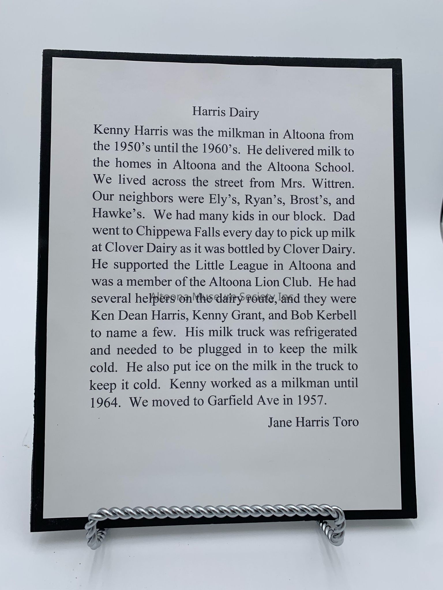 Kenny Harris was the milkman in Altoona from the 1950's until the 1960's. He delivered milk to the homes in Altoona and the Altoona School. Kenny Harris went to Chippewa Falls every day to pick up milk at Clover Dairy as it was bottled at Clover Dairy. Kenny's milk truck was refrigerated and needed to be plugged in to keep the milk cold. Kenny also put ice on the milk in the truck to keep it cold. Kenny worked as a milkman until 1964. He moved to Garfield Avenue, Altoona WI in 1957Acquisition