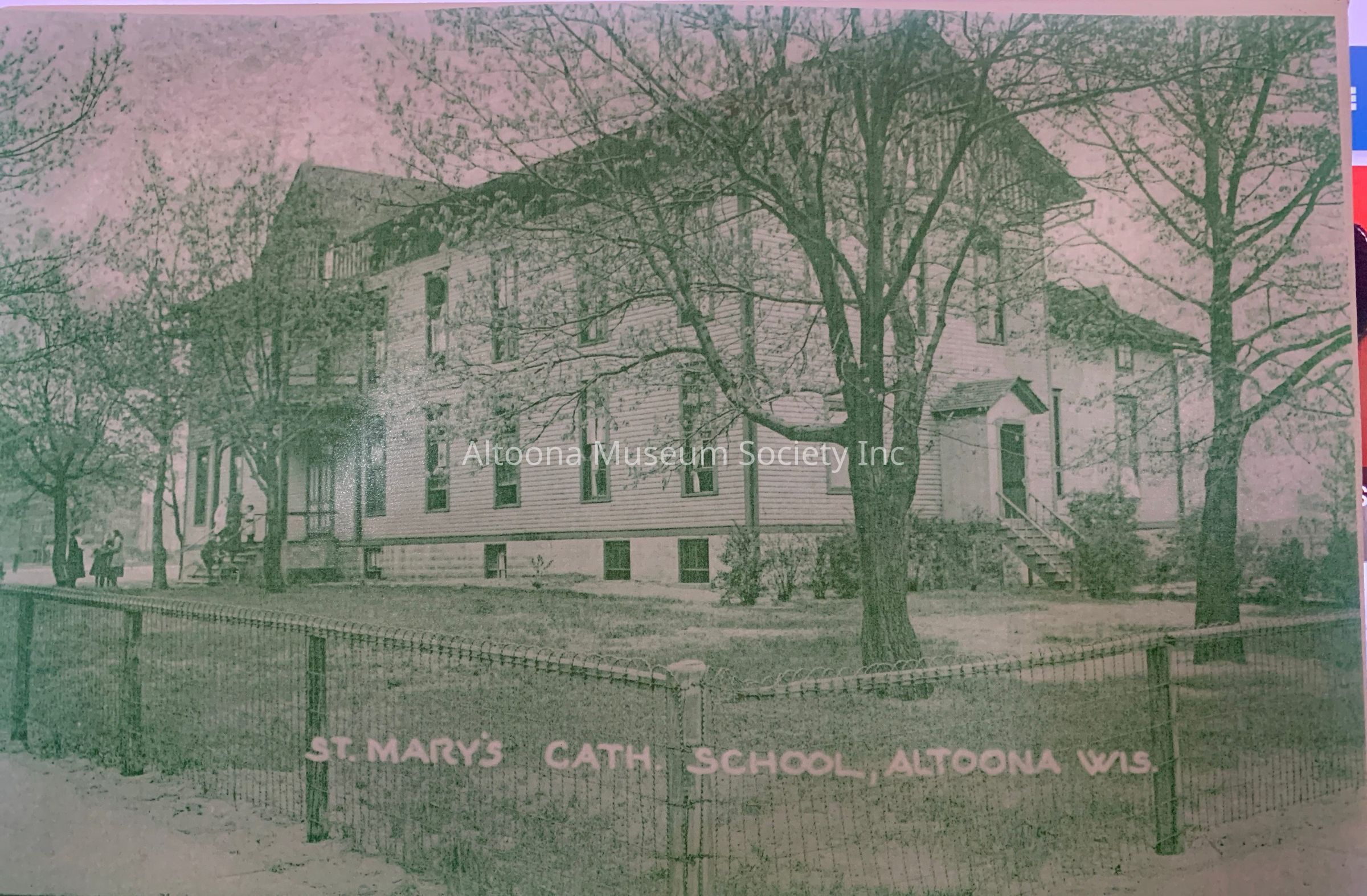 Originally a hotel known as the Omaha Eating House, this building was moved to the corner of Spooner Avenue and 4th Street West. St. Mary's boarding school for girls served as Altoona's first high school until 1913. It later became a military boarding school for boys. It was torn down August 5, 1966 and replaced by present St. Mary's School. This building stood where the present-day church stands.