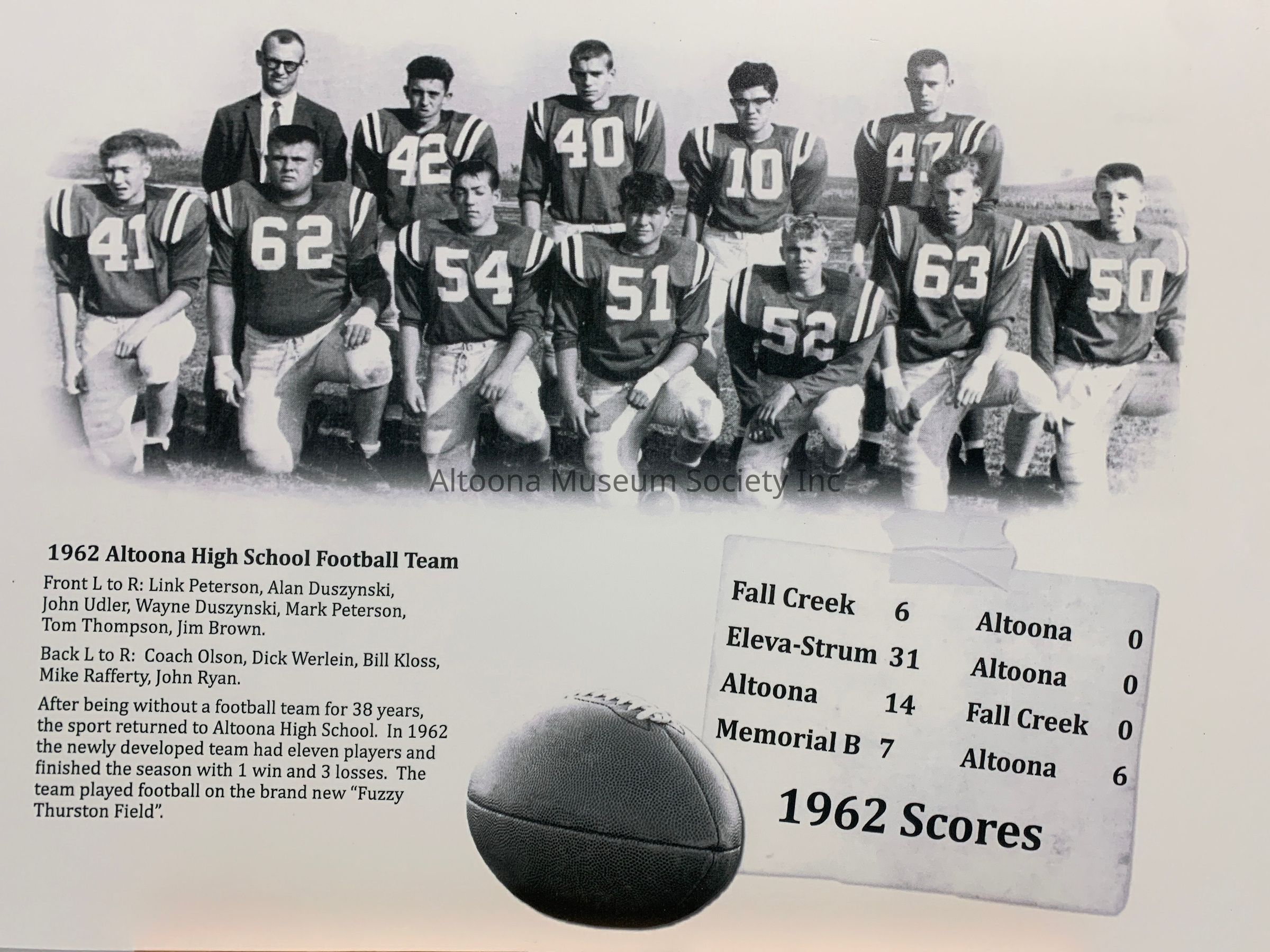 1962 Altoona Hight School Football Team. After being without a football team for 38 years the sport returned to AHS. In 1962 the newly developed team had eleven players and finished the season with 1 win and 3 losses. The team played football on the new "Fuzzy Thurston Field"