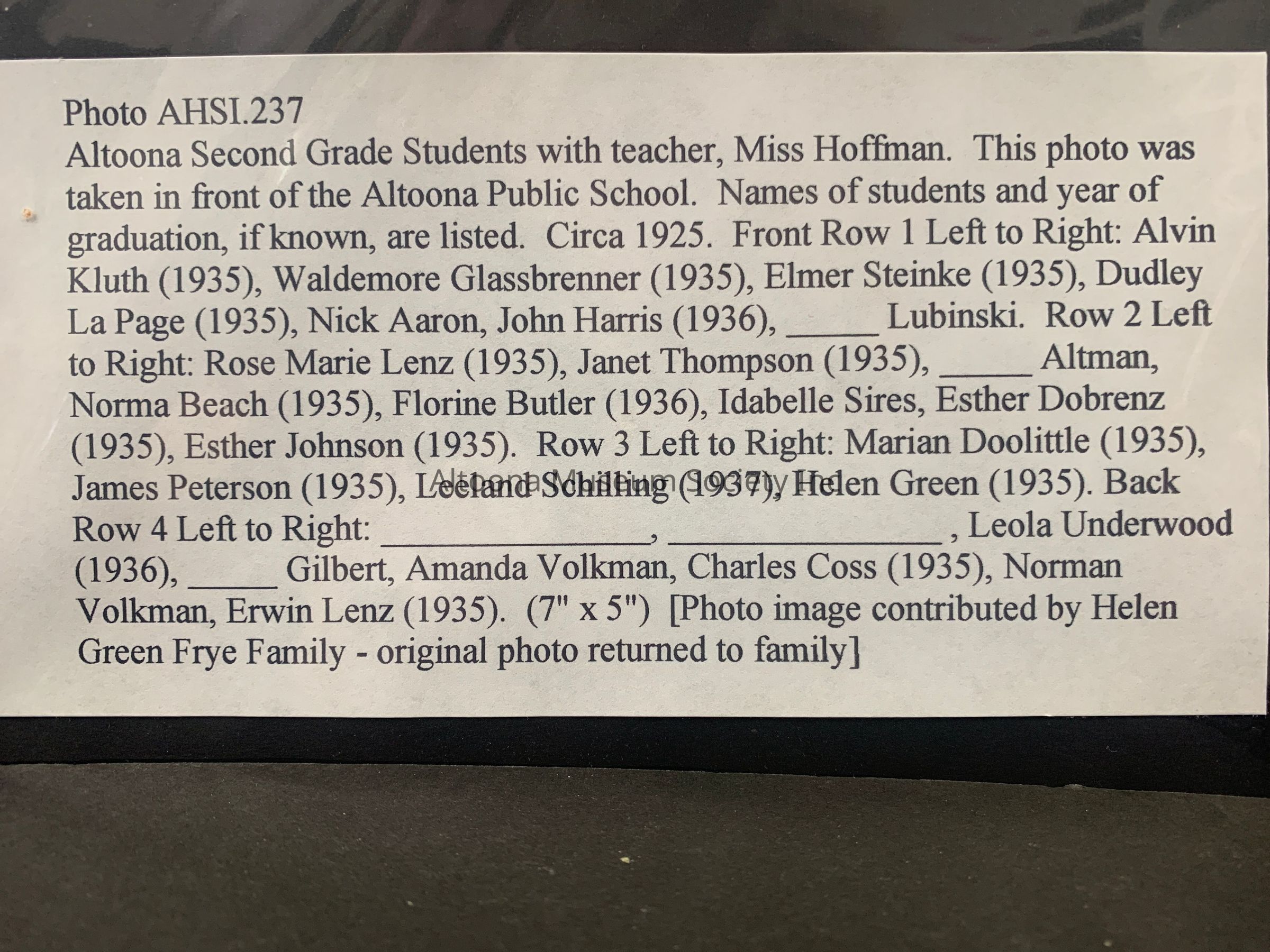 Picture is from Helen Green Frye family; Helen was born in Eau Claire, WI and graduated from Altoona High School in 1935. See attached picture with names of students and year they graduate (if known).Acquisition