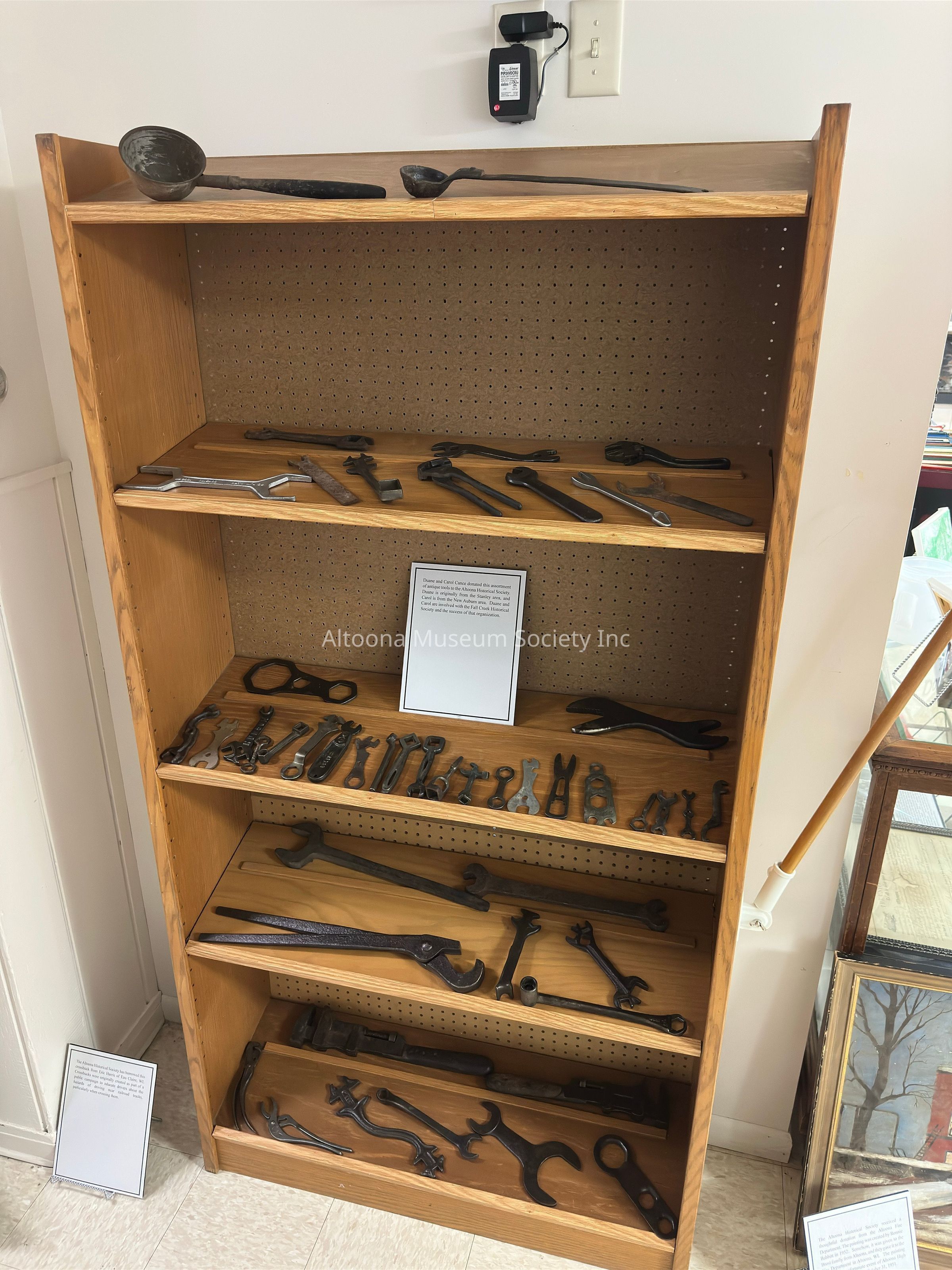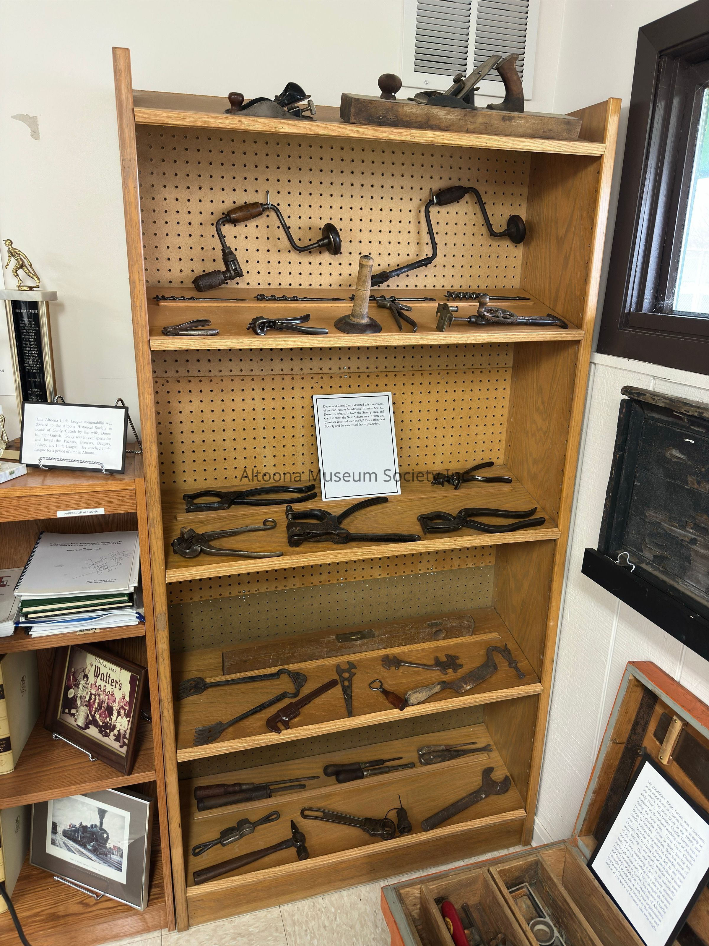 Duane and Carol Cance donated this assortment of antique tools to the Altoona Historical Society Duane is originally from the Stanley area, and Carol is from the New Auburn area. Duane and Carol are involved with the Fall Creek Historical Society and the success of that organization. Two bookcases of tools.Acquisition