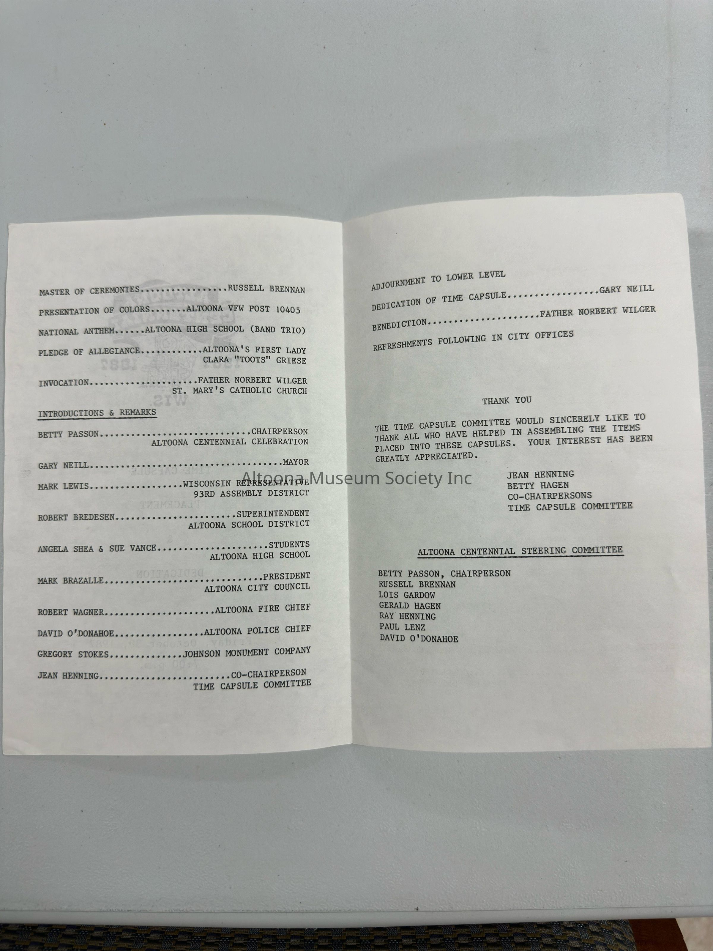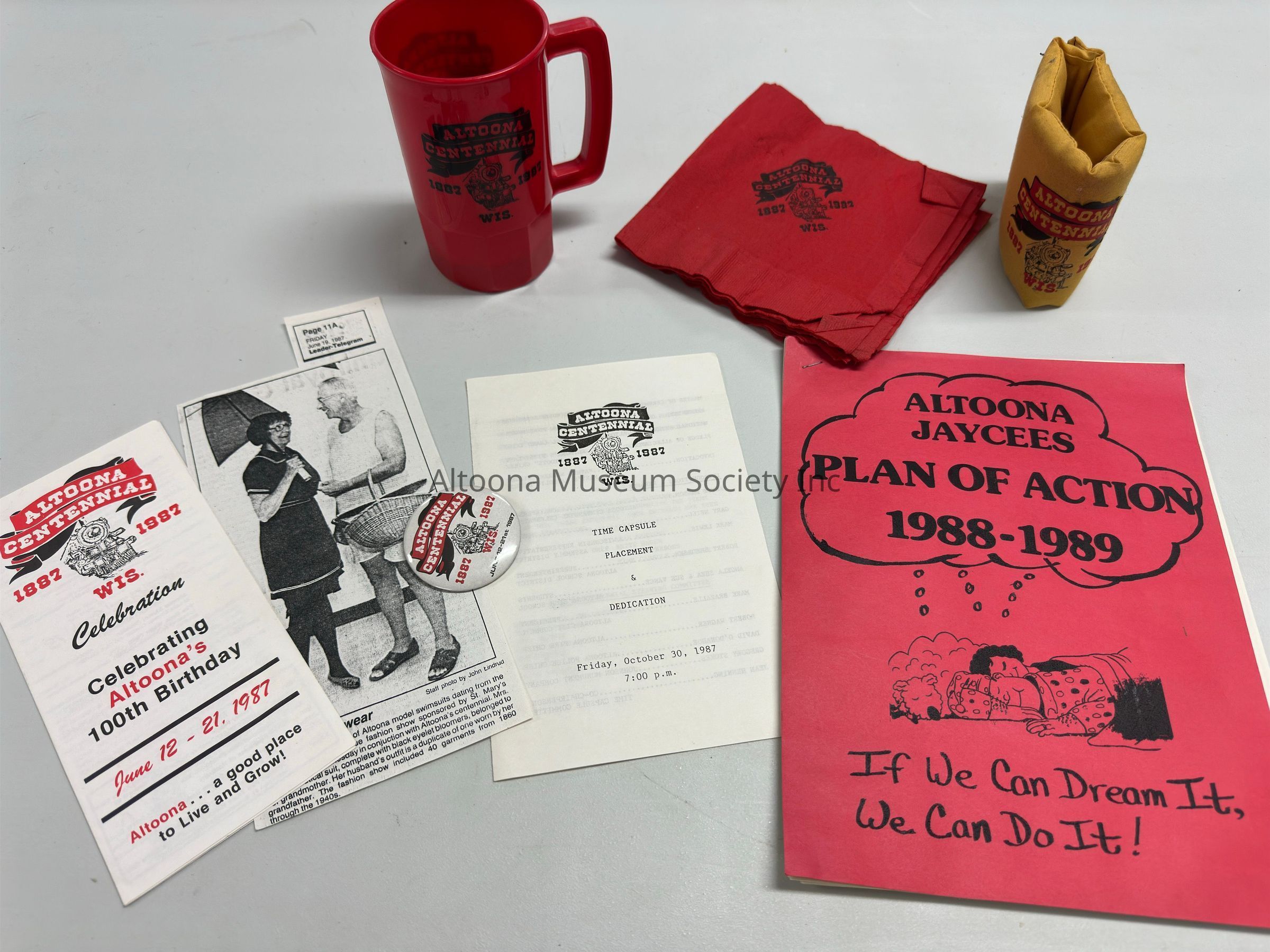 This collection of centennial memorabilia was donated to the Altoona Historical Society by Cheryl Bevins who up until recently was a resident of Altoona. The city of Altoona celebrated their centennial from June 12 to 21st in 1987