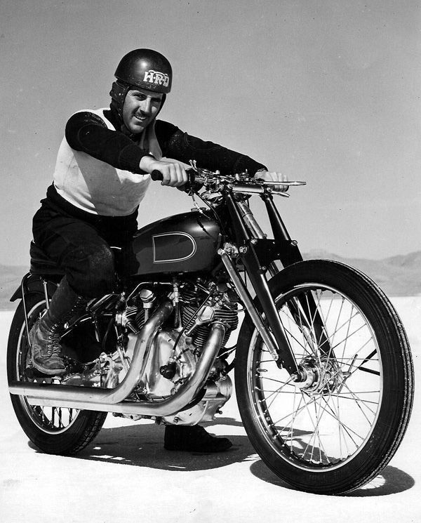 After a long ride out into the desert, the race was set up on a dark and isolated road with dozens of riders lined up to watch the race. Dickerson and his Vincent beat the big Chevy and the angry driver tried clipping the Vincent’s front tire as he sped away.