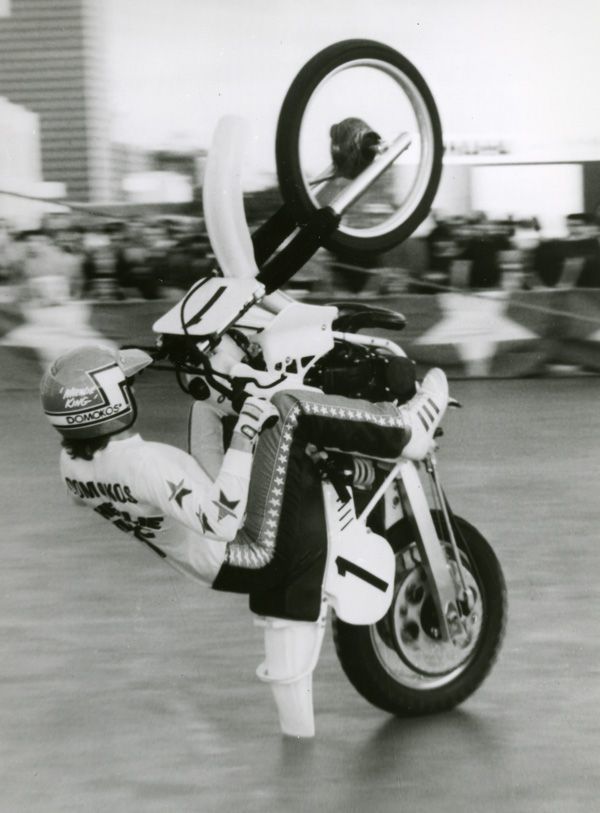 In the late 1970s, Domokos began performing at Supercross events in stadiums as well as the outdoor national motocross events, and he began being featured in motorcycle magazines. He soon gained national recognition and his ability to ride a motorcycle on its rear wheel took him from putting on a show in front of a few people at the races or the shop to a thriving career.