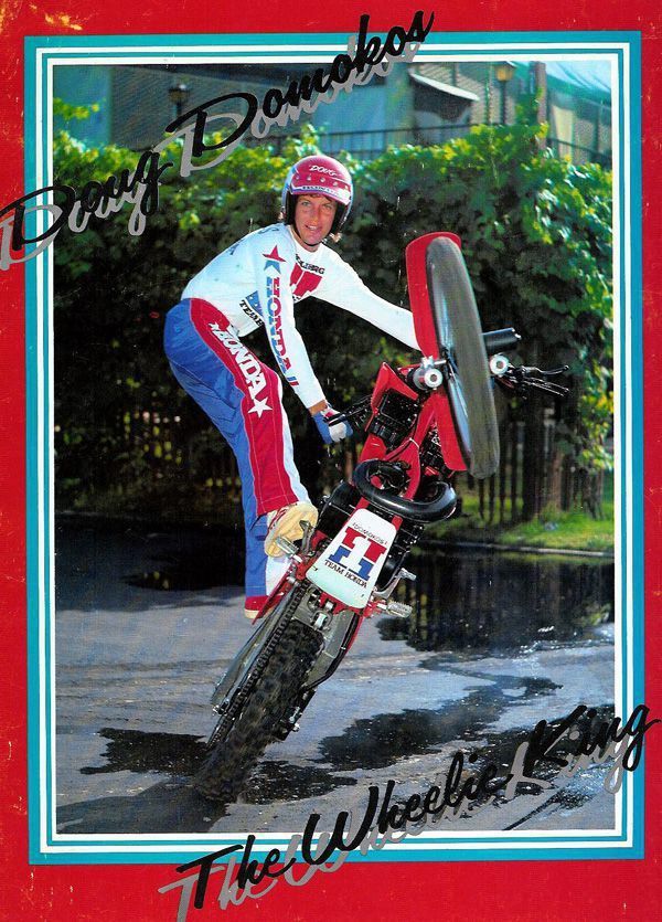 Doug Domokos was better known to his legion of fans as "The Wheelie King." Domokos' uncanny ability to balance and ride a motorcycle on its rear wheel, and his natural showmanship, earned him a worldwide reputation as one of the premier motorcycle performers of the 1980s and ‘90s and landed him in the Guinness Book of World Records.