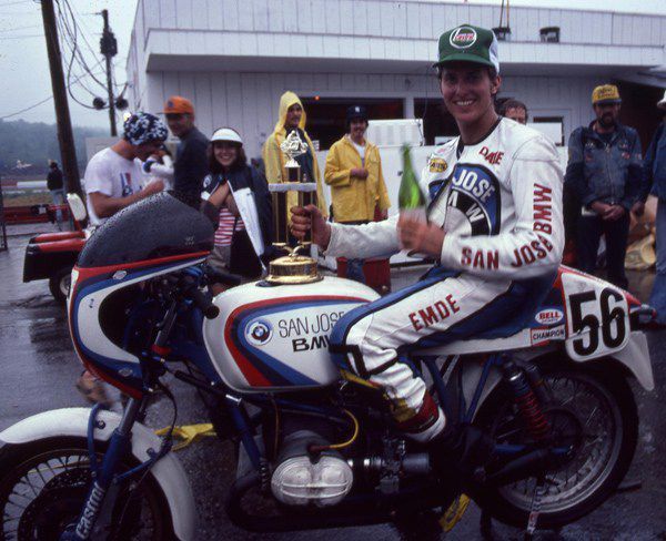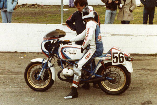 As he continued to register victories in the 250cc class into the 1980s, Emde was signed by San Jose BMW to ride their potent BMW Boxer Twins in the newly formed Battle of the Twins class. Battle of the Twins was conceived since twins were thought then to be totally uncompetitive against the four-cylinder machines. He ran well in that class, with his highlight coming in June of 1981 at the Loudon, New Hampshire National. Emde was obviously not originally planning to ride in the Superbike event, but on a day where rain fell steadily throughout the day, his riding style and the more mellow power output of the BMW resulted in his practice times being competitive with the Superbikes. After reviewing his practice times, the team decided to enter him in the big race as well as the Battle of the Twins that would run later in the day.