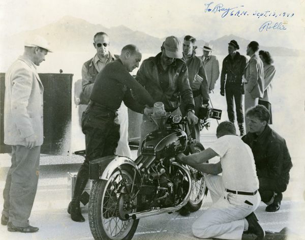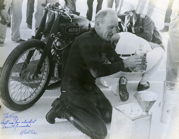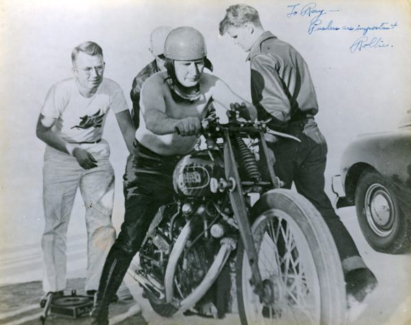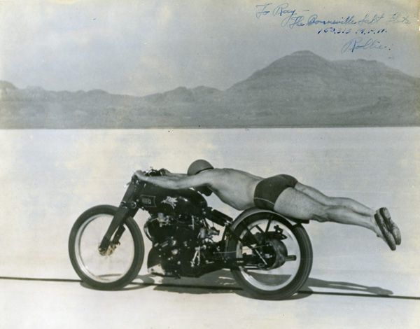 Rollie Free was a racer during the 1920s and '30s, but is best known for setting the American motorcycle one-mile speed record in 1948, when he rode a British-made Vincent HRD Black Shadow to a speed of 150.313 mph at the Bonneville Salt Flats in Utah. To make that record run, Free stripped down to tight-fitting swimming shorts and laid flat on the Vincent to cut down on every last bit of wind resistance. A photo of the swimsuit-clad Free racing across the salt flats at 150 mph became one of the most famous photos in the history of the sport.