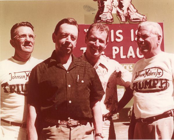 Bill Johnson helped establish Triumph Motorcycles in the United States. His company, Johnson Motors, imported and sold British-made motorcycles starting in the late 1930s when foreign-made motorcycles where a rare sight on American roads. Johnson also helped revolutionize the way motorcycles were sold. He opened a dealership in Pasadena on a busy street in the high-rent district of town. The dealership featured a roomy two-story showroom with floor-to-ceiling glass that tastefully displayed the machines. Johnson also believed in racing as an excellent form of advertising. He backed many of the leading riders of the 1940 to 1960s and sponsored many racing events across the United States during the same period.