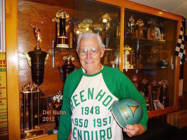 Del Kuhn was one of the nation’s leading off-road motorcycle racers in the 1940s and 1950s. Kuhn won the prestigious Greenhorn Enduro three times—1948, 1950 and 1951. His 1950 victory at Greenhorn earned him the title of AMA National Enduro Champion that season. He also won the highly popular Big Bear Run in 1952. Not as well known is the fact that Kuhn was one of the riders who laid out the Catalina Island Grand Prix course in the early 1950s. The Catalina GP was one of the most popular motorcycle races of the 1950s. Kuhn’s best result at Catalina was third in 1951.