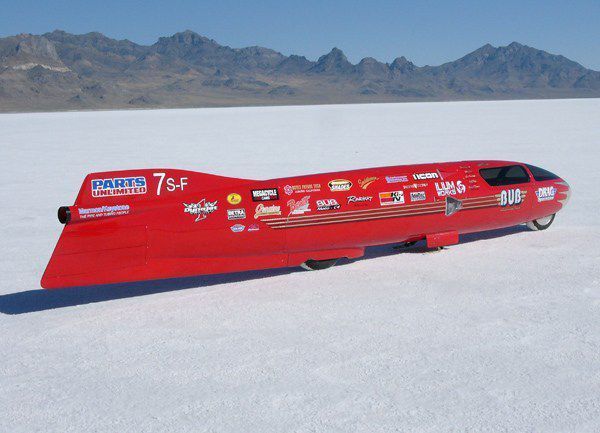 The 15-foot-long streamliner, which Manning constructed around his own physique, needed to have its passenger compartment modified for the 5-inch-shorter Rayborn. Its main structural unit was the compartment itself, an aluminum tube with a cross section of only 23 inches, with aluminum bulkheads riveted into each end. On these bulkheads are bolted tubular steel sub-frames: one in front to carry the front wheel, suspension and steering mechanism, and one in the rear to contain the engine and drive train, fuel tank, air bottle to drive pneumatic skids, and drag chute.